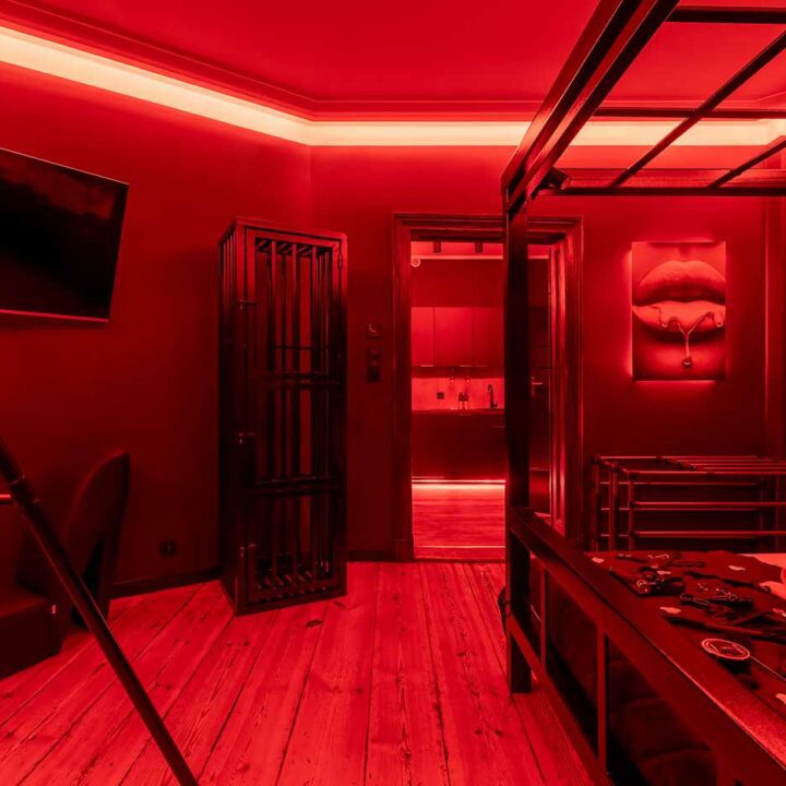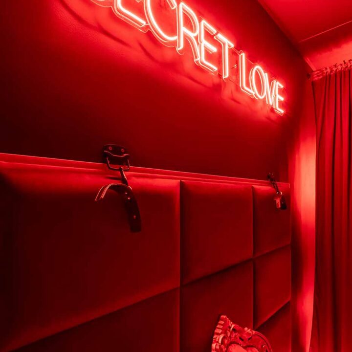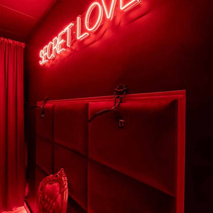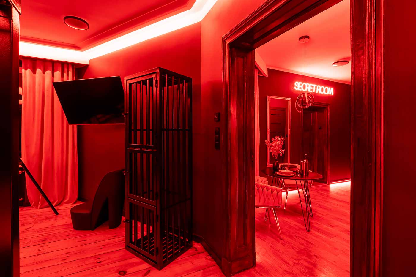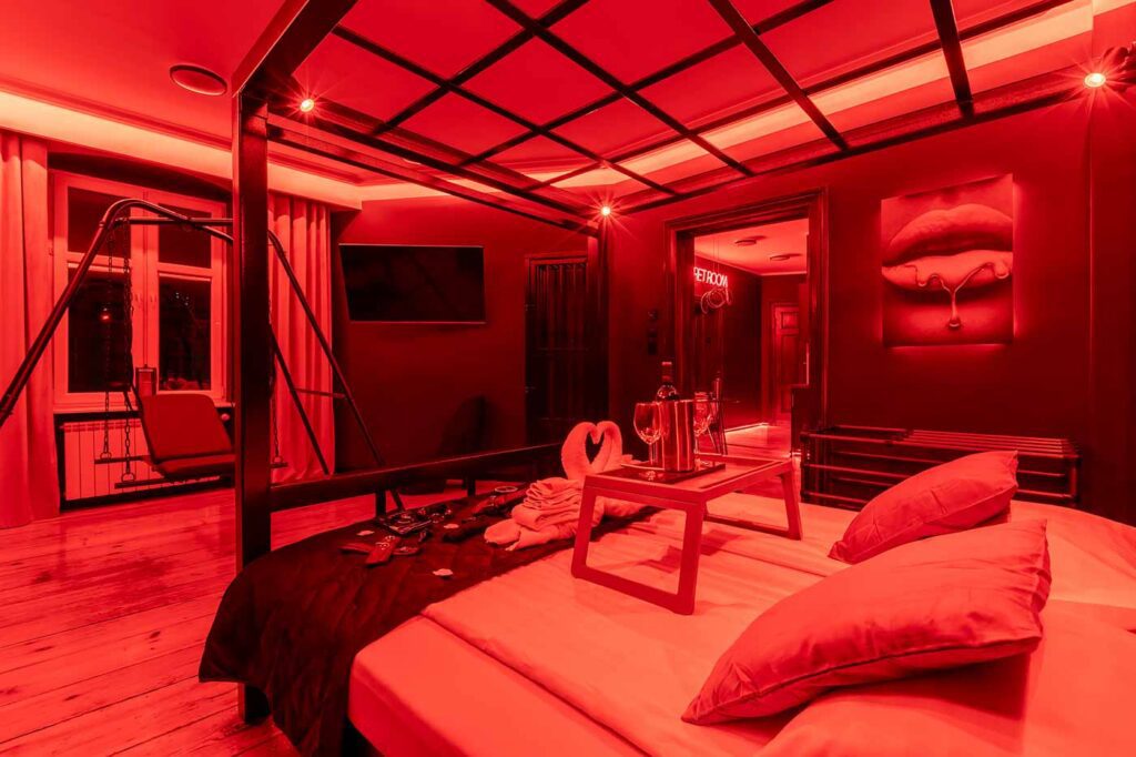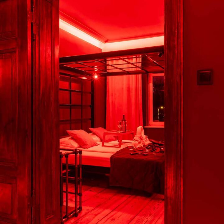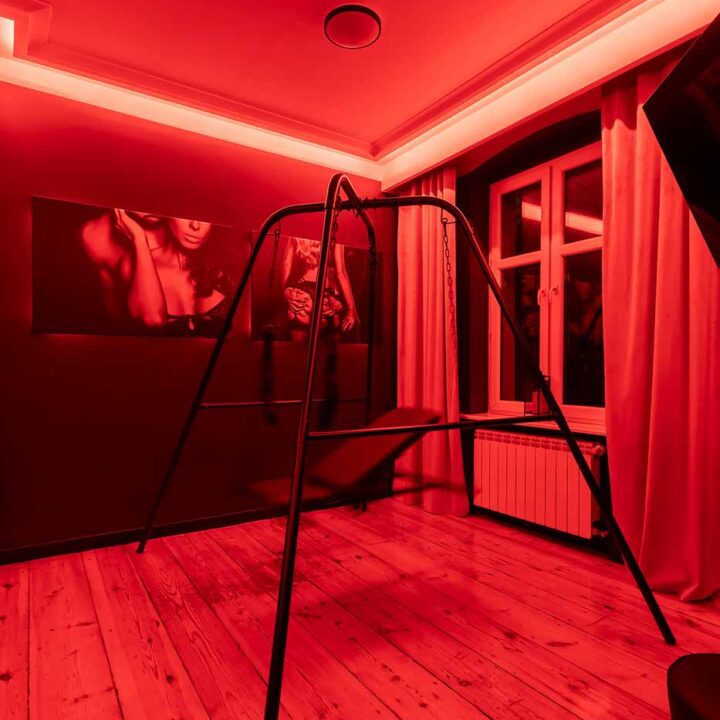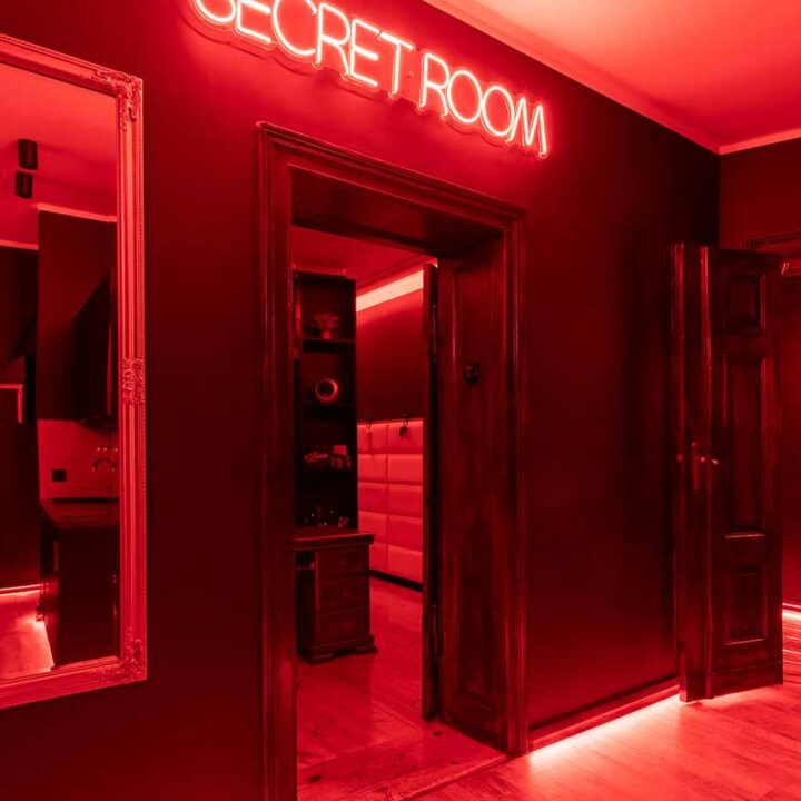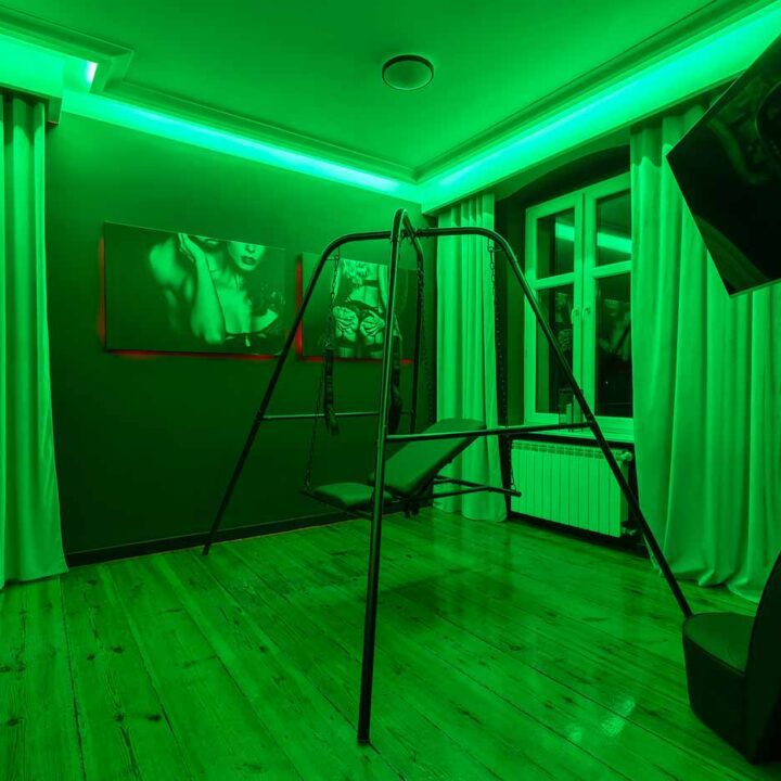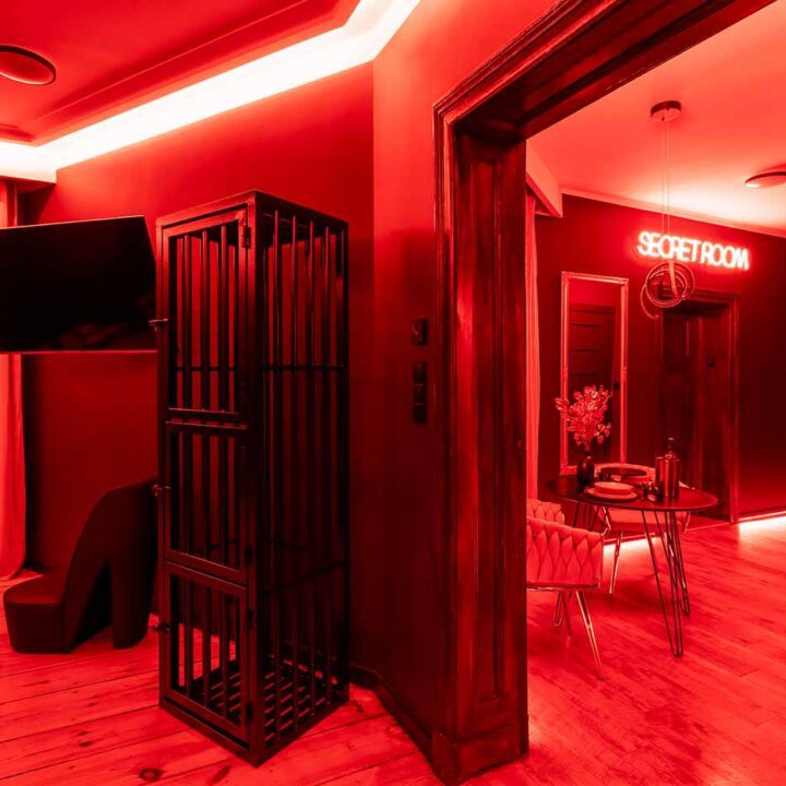 Secret Love BDSM & MYSTERY łączy klimat prywatnego klubu z elementem gry i ciekawości. To apartament, w którym światło, scenografia i układ pomieszczeń same prowadzą przez kolejne strefy – od komfortowego pobytu i części towarzyskiej, po wyraźnie wydzieloną przestrzeń BDSM. Całość działa w kilku „trybach”: może być intensywnie i klubowo (czerwień), chłodniej i bardziej tajemniczo (niebieski), albo bardziej „eventowo” i energetycznie (zieleń). W każdym wariancie zostaje jedno: atmosfera, która robi wrażenie.