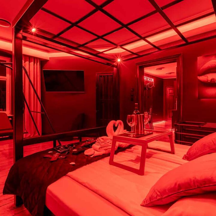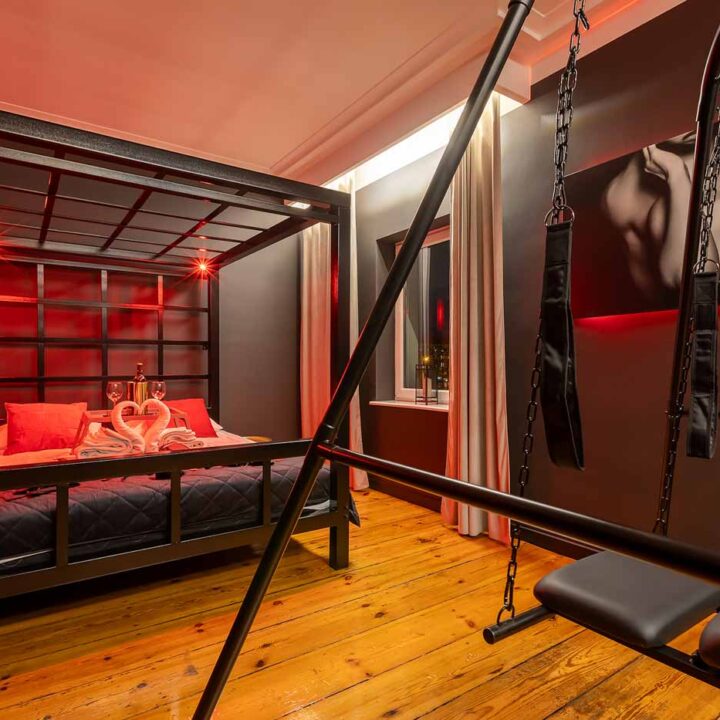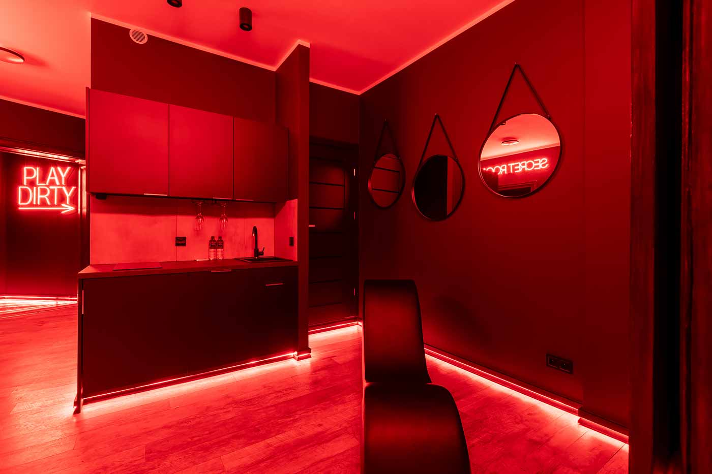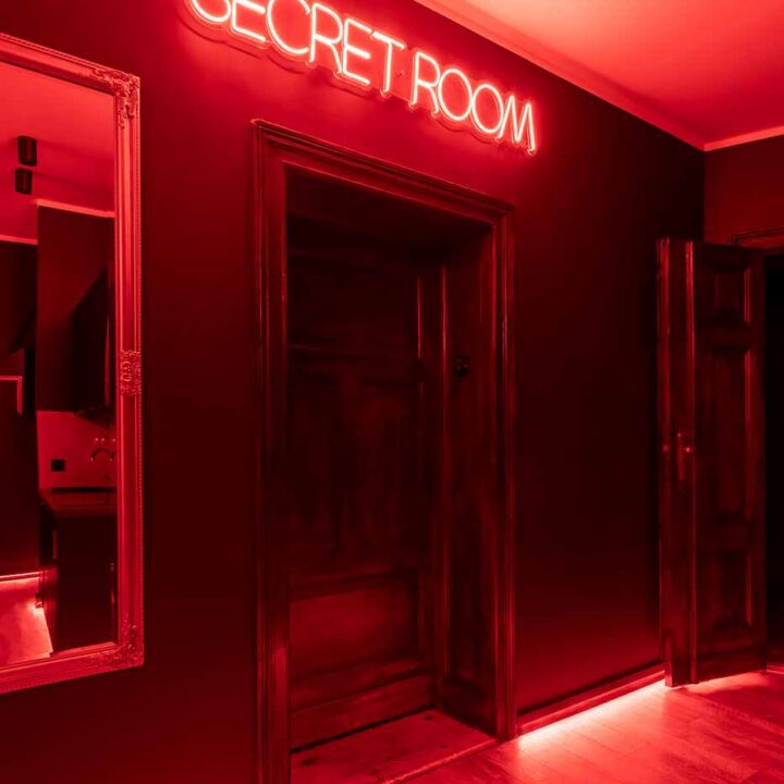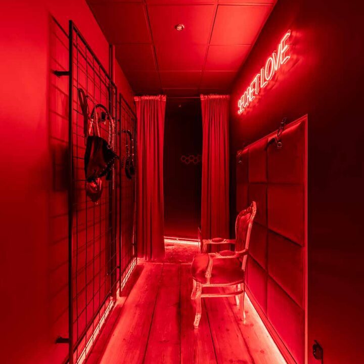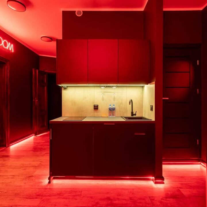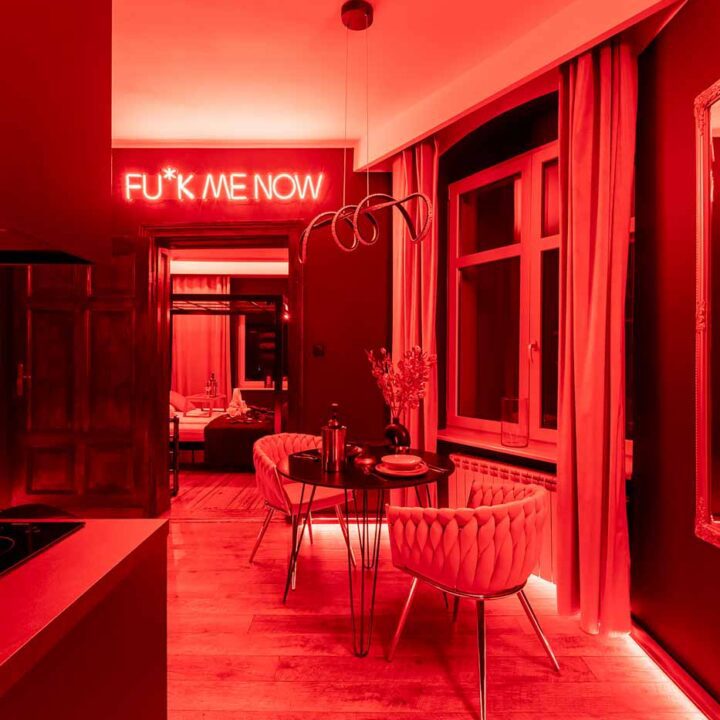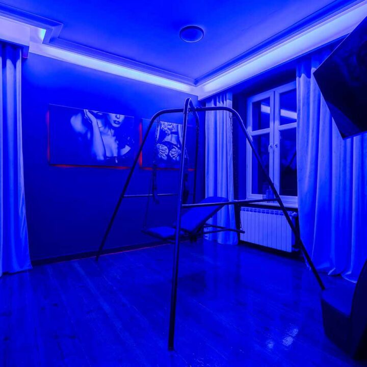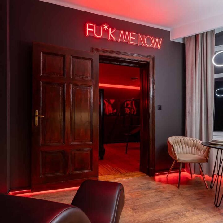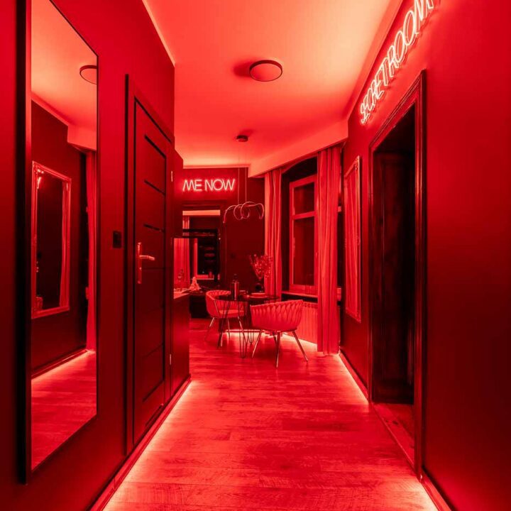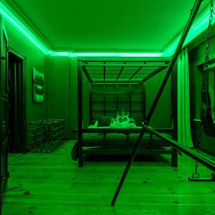 Secret Love BDSM & MYSTERY łączy klimat prywatnego klubu z elementem gry i ciekawości. To apartament, w którym światło, scenografia i układ pomieszczeń same prowadzą przez kolejne strefy – od komfortowego pobytu i części towarzyskiej, po wyraźnie wydzieloną przestrzeń BDSM. Całość działa w kilku „trybach”: może być intensywnie i klubowo (czerwień), chłodniej i bardziej tajemniczo (niebieski), albo bardziej „eventowo” i energetycznie (zieleń). W każdym wariancie zostaje jedno: atmosfera, która robi wrażenie.