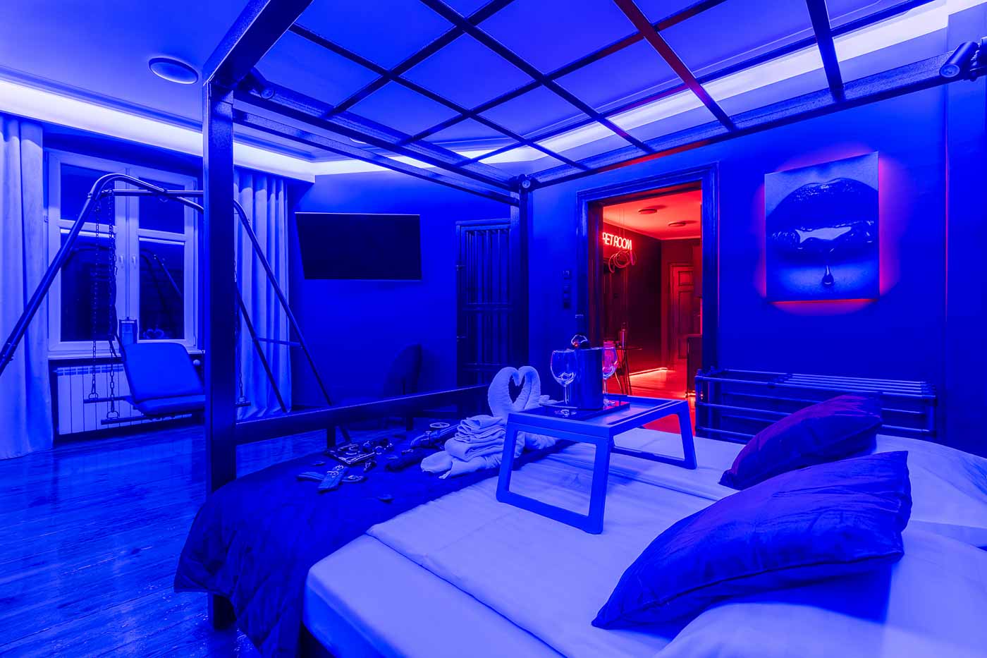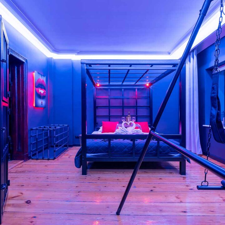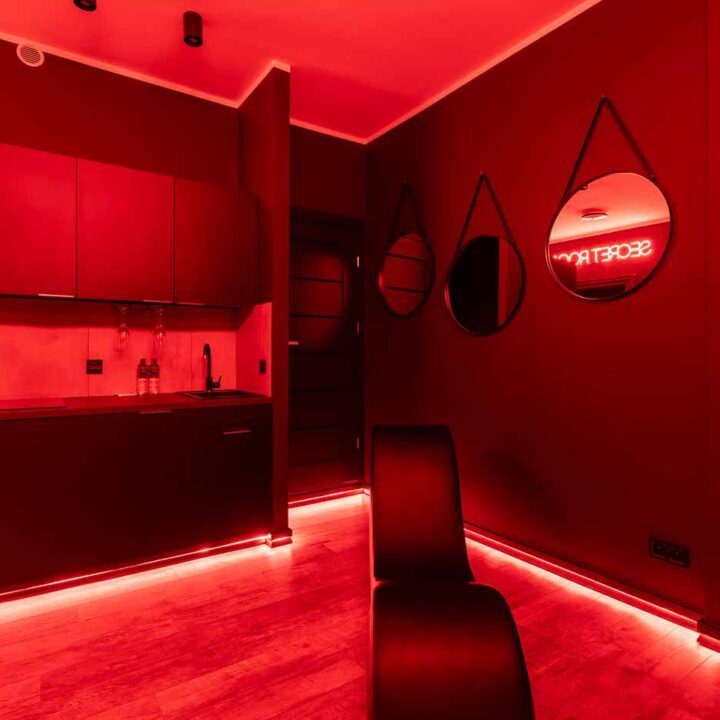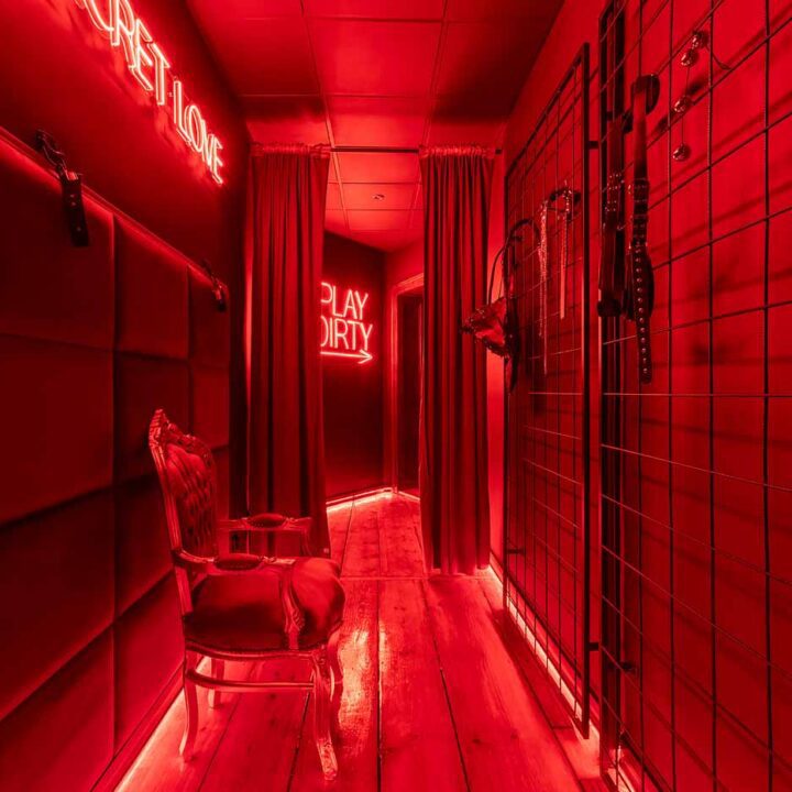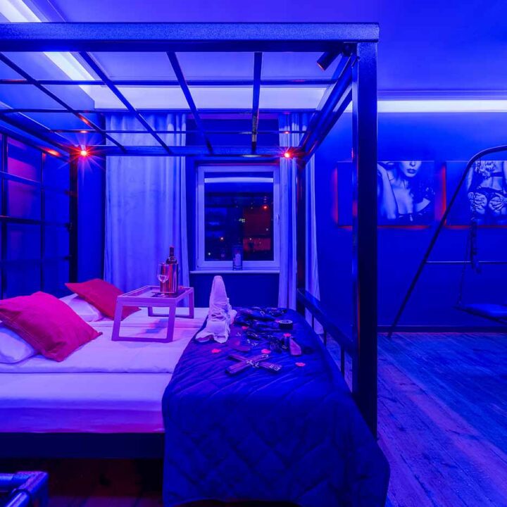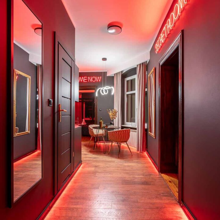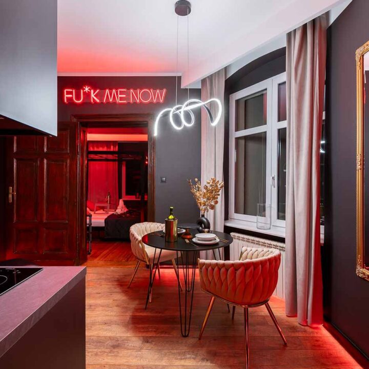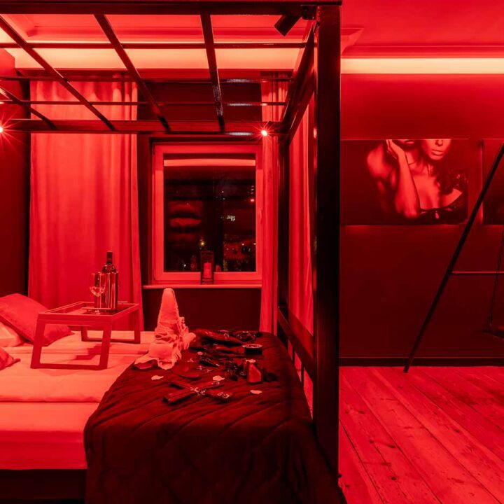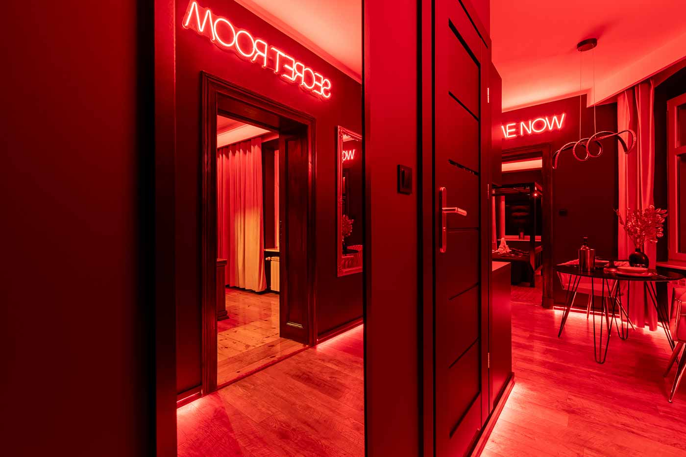 Secret Love BDSM & MYSTERY łączy klimat prywatnego klubu z elementem gry i ciekawości. To apartament, w którym światło, scenografia i układ pomieszczeń same prowadzą przez kolejne strefy – od komfortowego pobytu i części towarzyskiej, po wyraźnie wydzieloną przestrzeń BDSM. Całość działa w kilku „trybach”: może być intensywnie i klubowo (czerwień), chłodniej i bardziej tajemniczo (niebieski), albo bardziej „eventowo” i energetycznie (zieleń). W każdym wariancie zostaje jedno: atmosfera, która robi wrażenie.