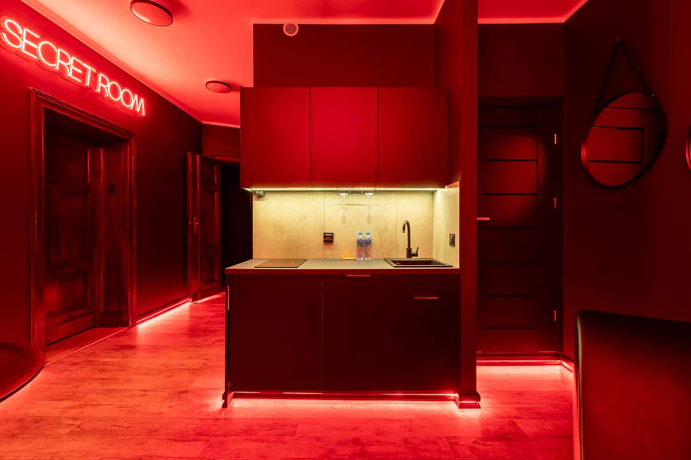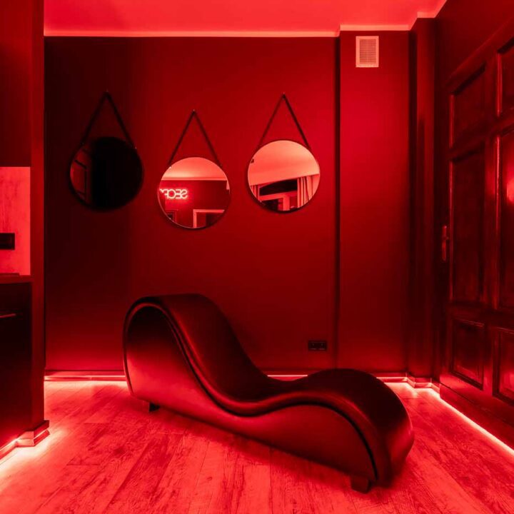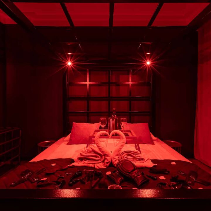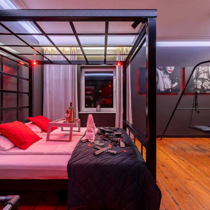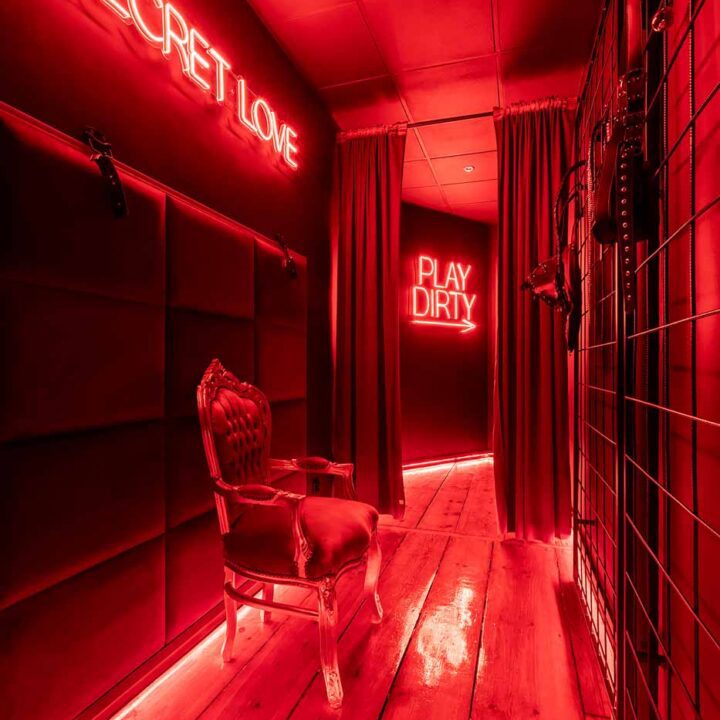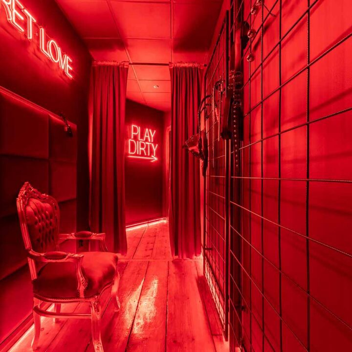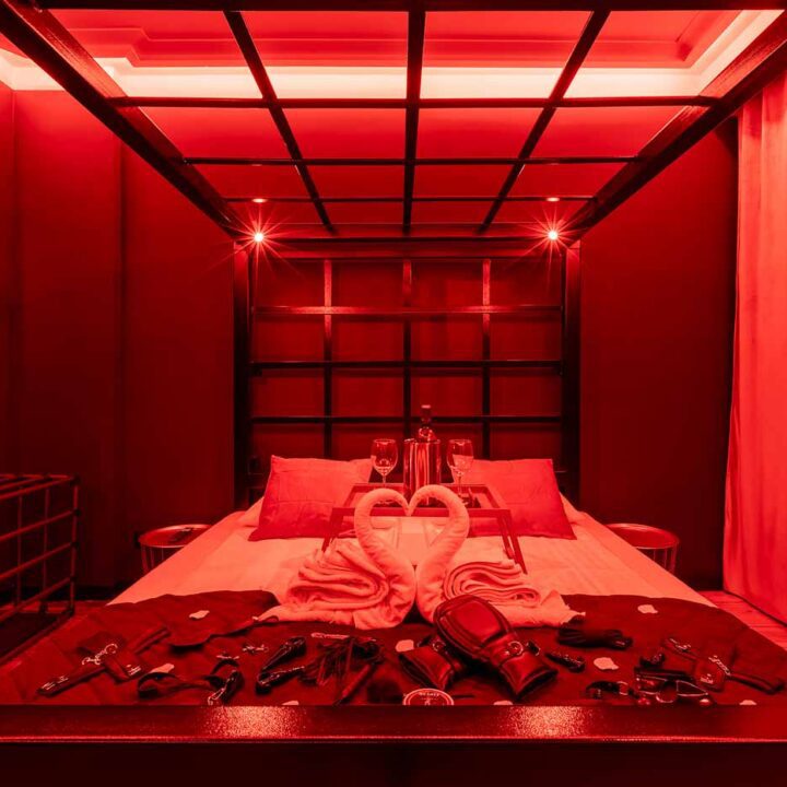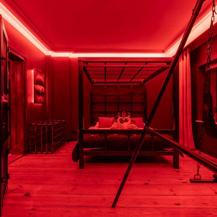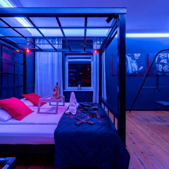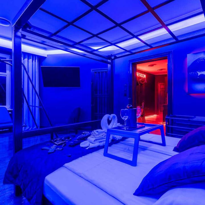 Secret Love BDSM & MYSTERY łączy klimat prywatnego klubu z elementem gry i ciekawości. To apartament, w którym światło, scenografia i układ pomieszczeń same prowadzą przez kolejne strefy – od komfortowego pobytu i części towarzyskiej, po wyraźnie wydzieloną przestrzeń BDSM. Całość działa w kilku „trybach”: może być intensywnie i klubowo (czerwień), chłodniej i bardziej tajemniczo (niebieski), albo bardziej „eventowo” i energetycznie (zieleń). W każdym wariancie zostaje jedno: atmosfera, która robi wrażenie.