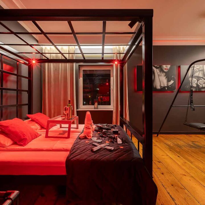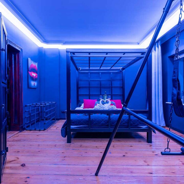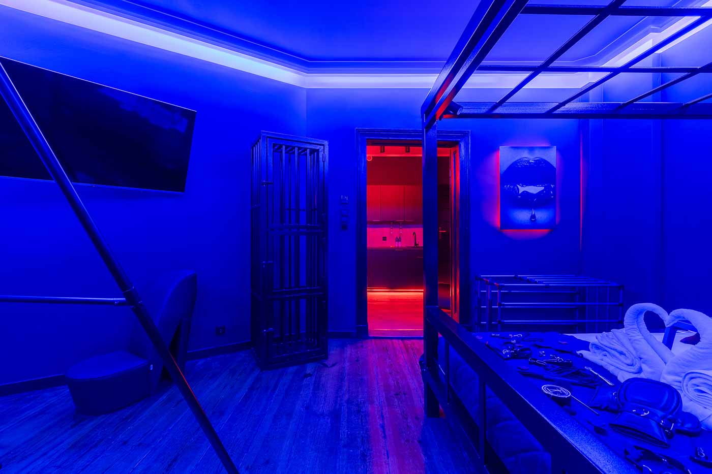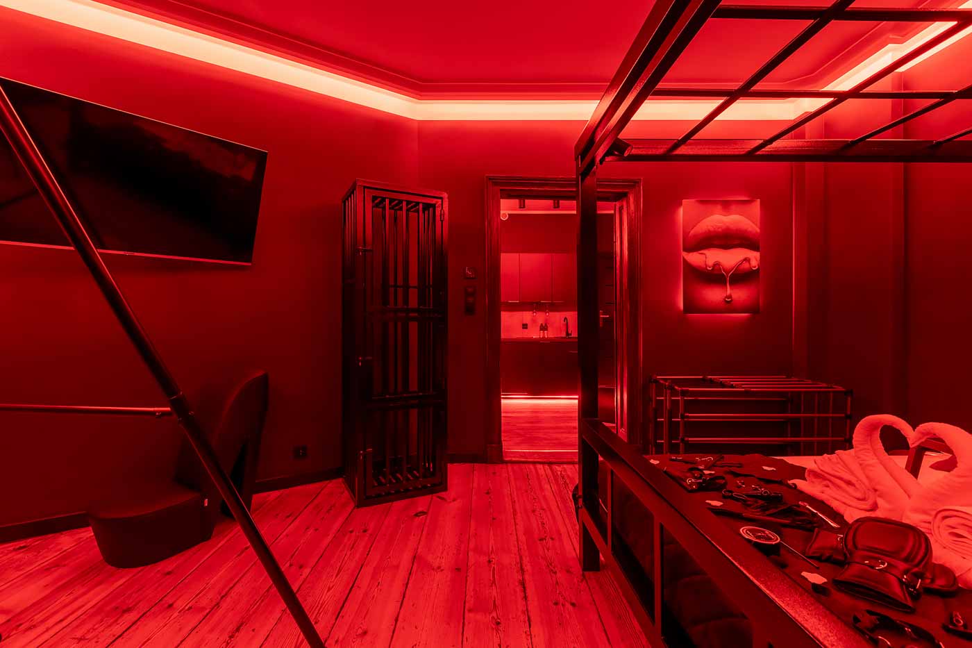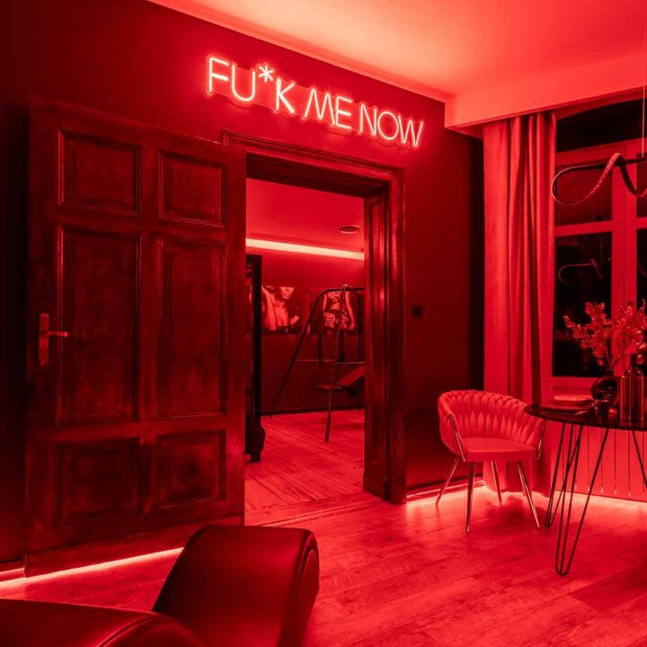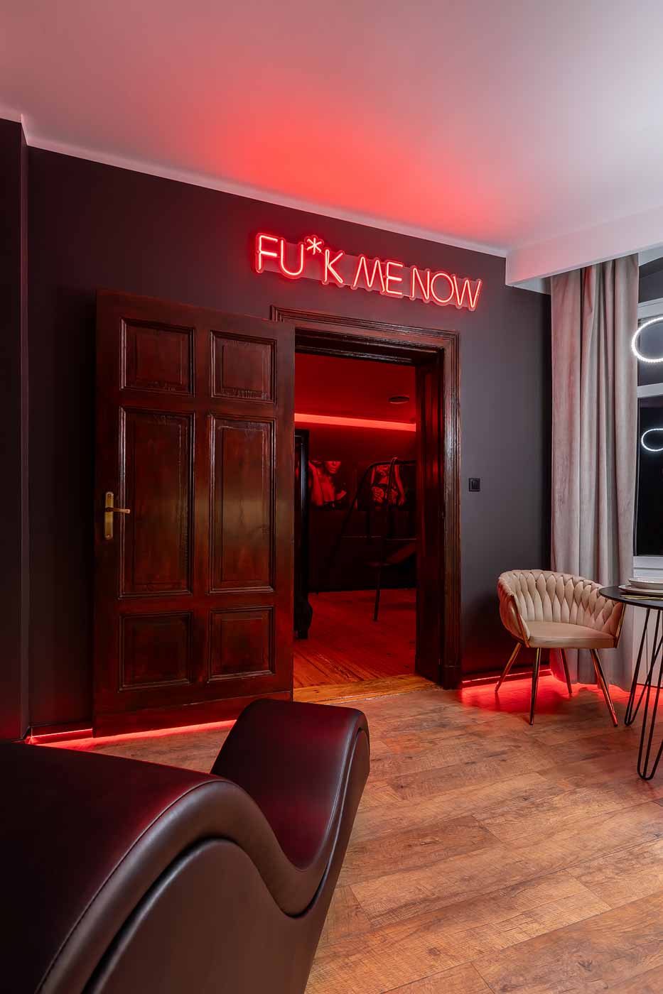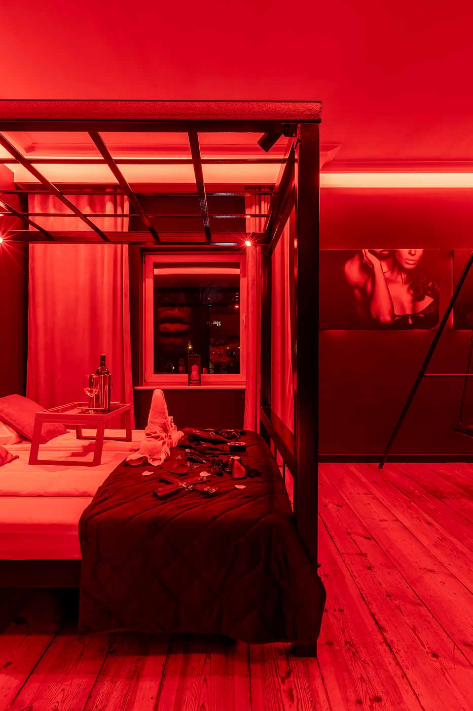 Secret Love BDSM & MYSTERY łączy klimat prywatnego klubu z elementem gry i ciekawości. To apartament, w którym światło, scenografia i układ pomieszczeń same prowadzą przez kolejne strefy – od komfortowego pobytu i części towarzyskiej, po wyraźnie wydzieloną przestrzeń BDSM. Całość działa w kilku „trybach”: może być intensywnie i klubowo (czerwień), chłodniej i bardziej tajemniczo (niebieski), albo bardziej „eventowo” i energetycznie (zieleń). W każdym wariancie zostaje jedno: atmosfera, która robi wrażenie.