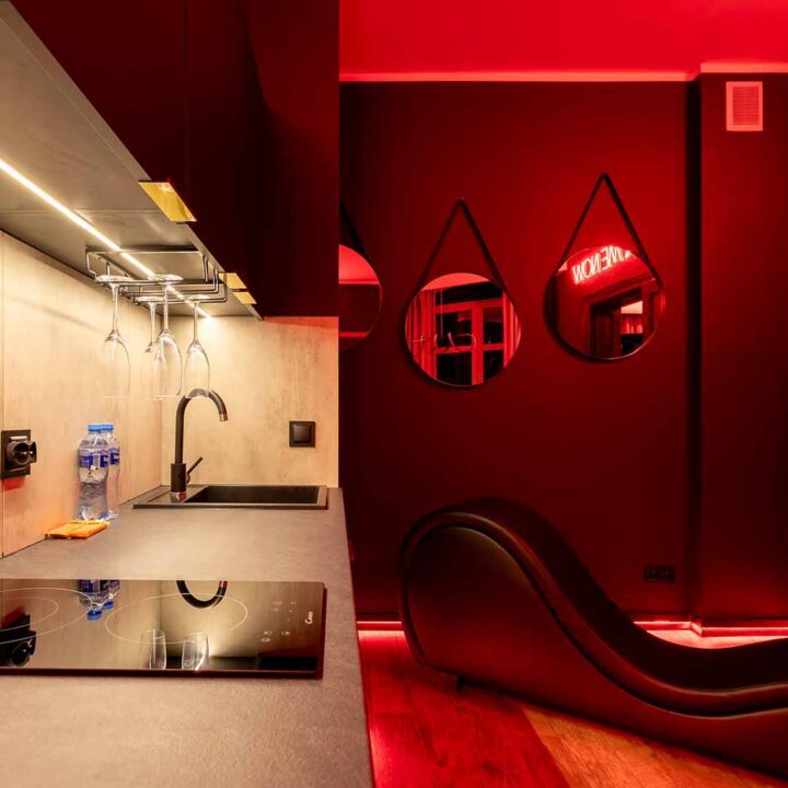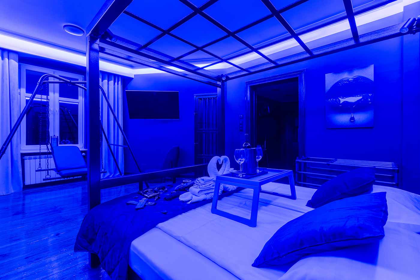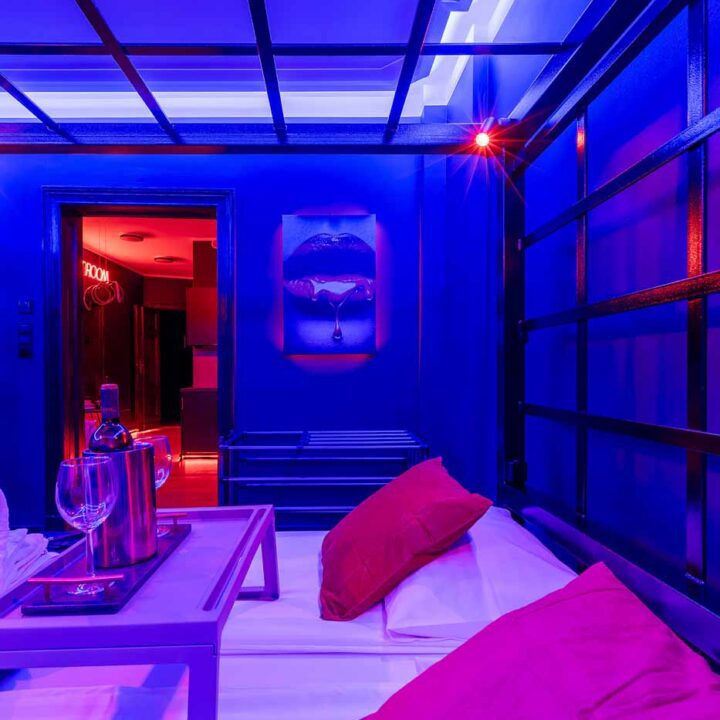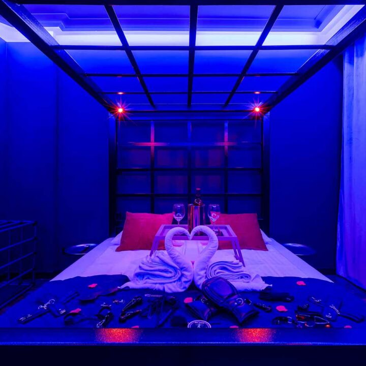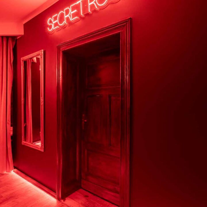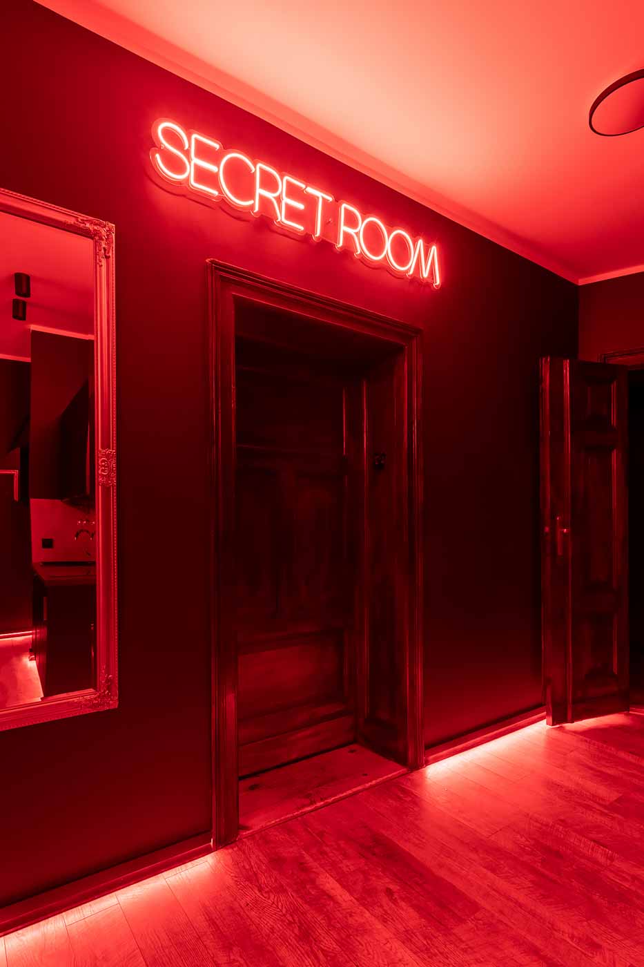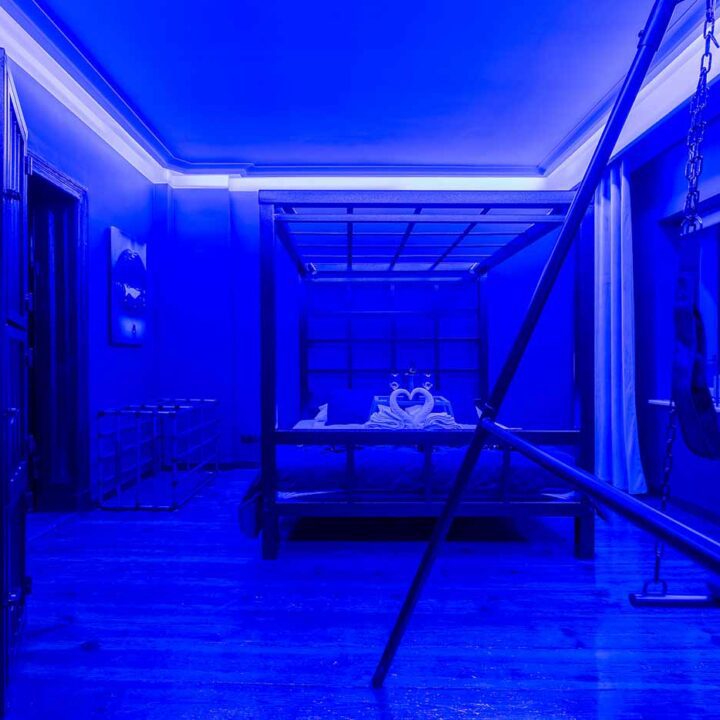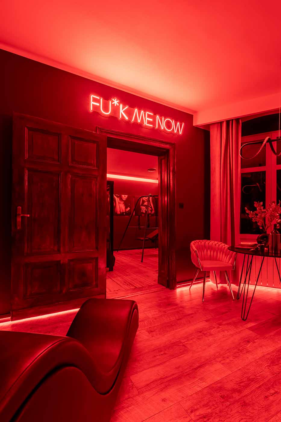 Secret Love BDSM & MYSTERY łączy klimat prywatnego klubu z elementem gry i ciekawości. To apartament, w którym światło, scenografia i układ pomieszczeń same prowadzą przez kolejne strefy – od komfortowego pobytu i części towarzyskiej, po wyraźnie wydzieloną przestrzeń BDSM. Całość działa w kilku „trybach”: może być intensywnie i klubowo (czerwień), chłodniej i bardziej tajemniczo (niebieski), albo bardziej „eventowo” i energetycznie (zieleń). W każdym wariancie zostaje jedno: atmosfera, która robi wrażenie.