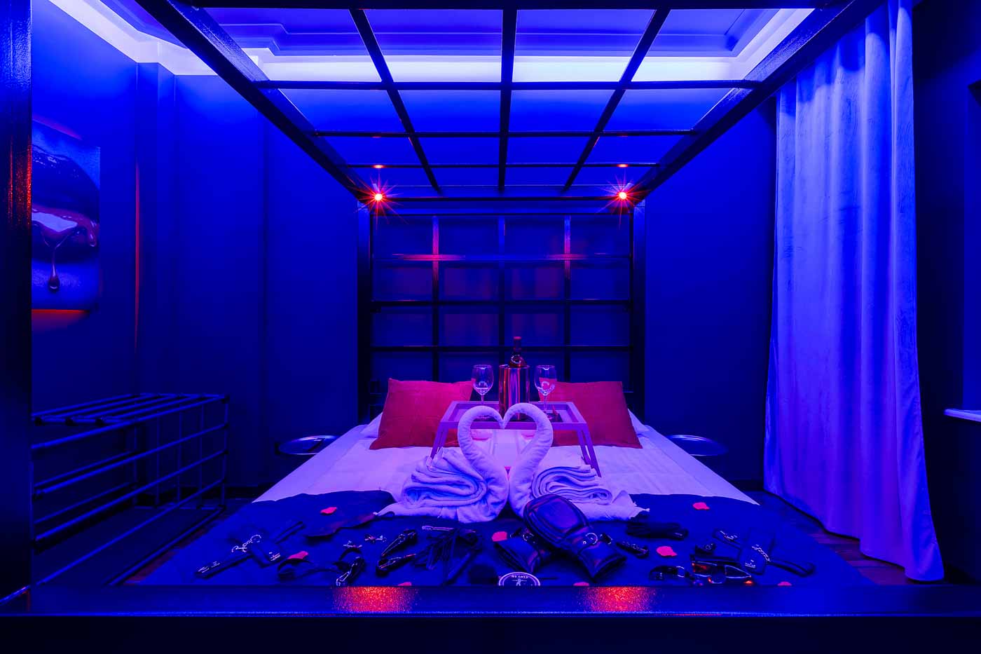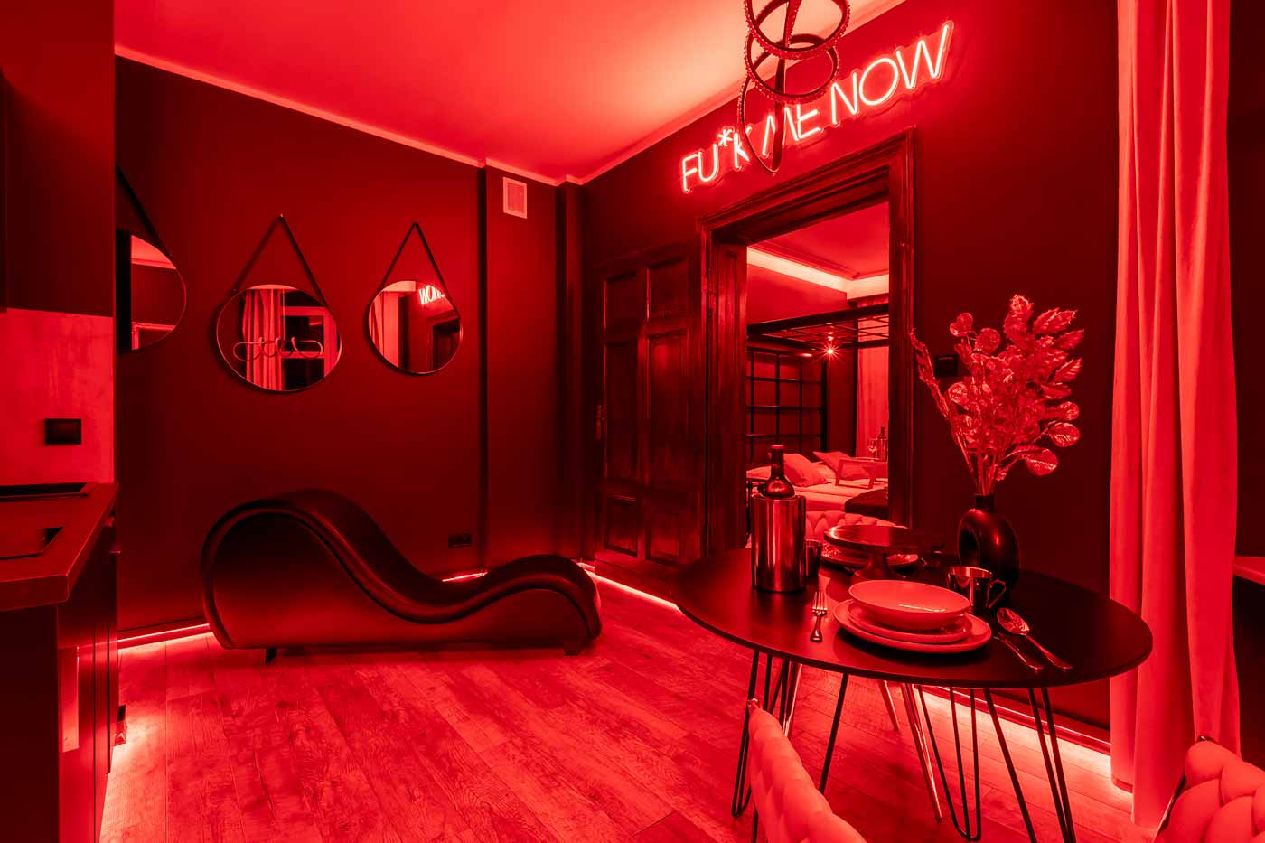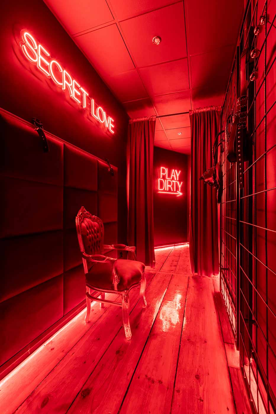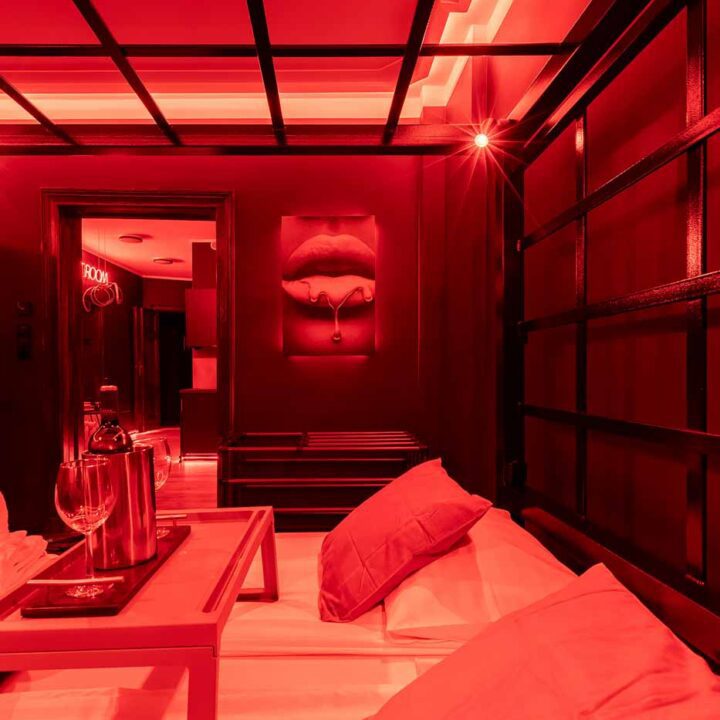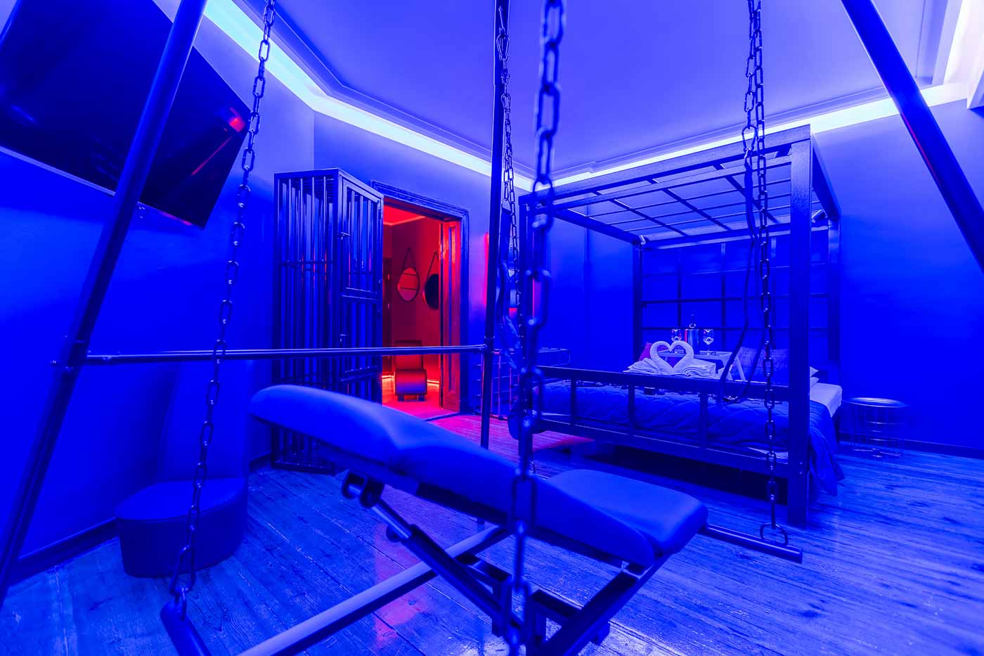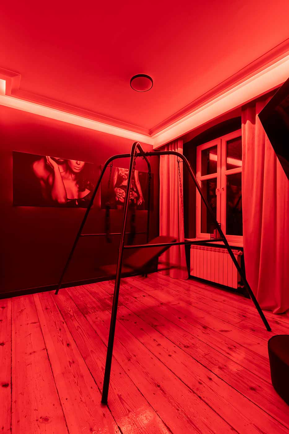 Secret Love BDSM & MYSTERY łączy klimat prywatnego klubu z elementem gry i ciekawości. To apartament, w którym światło, scenografia i układ pomieszczeń same prowadzą przez kolejne strefy – od komfortowego pobytu i części towarzyskiej, po wyraźnie wydzieloną przestrzeń BDSM. Całość działa w kilku „trybach”: może być intensywnie i klubowo (czerwień), chłodniej i bardziej tajemniczo (niebieski), albo bardziej „eventowo” i energetycznie (zieleń). W każdym wariancie zostaje jedno: atmosfera, która robi wrażenie.