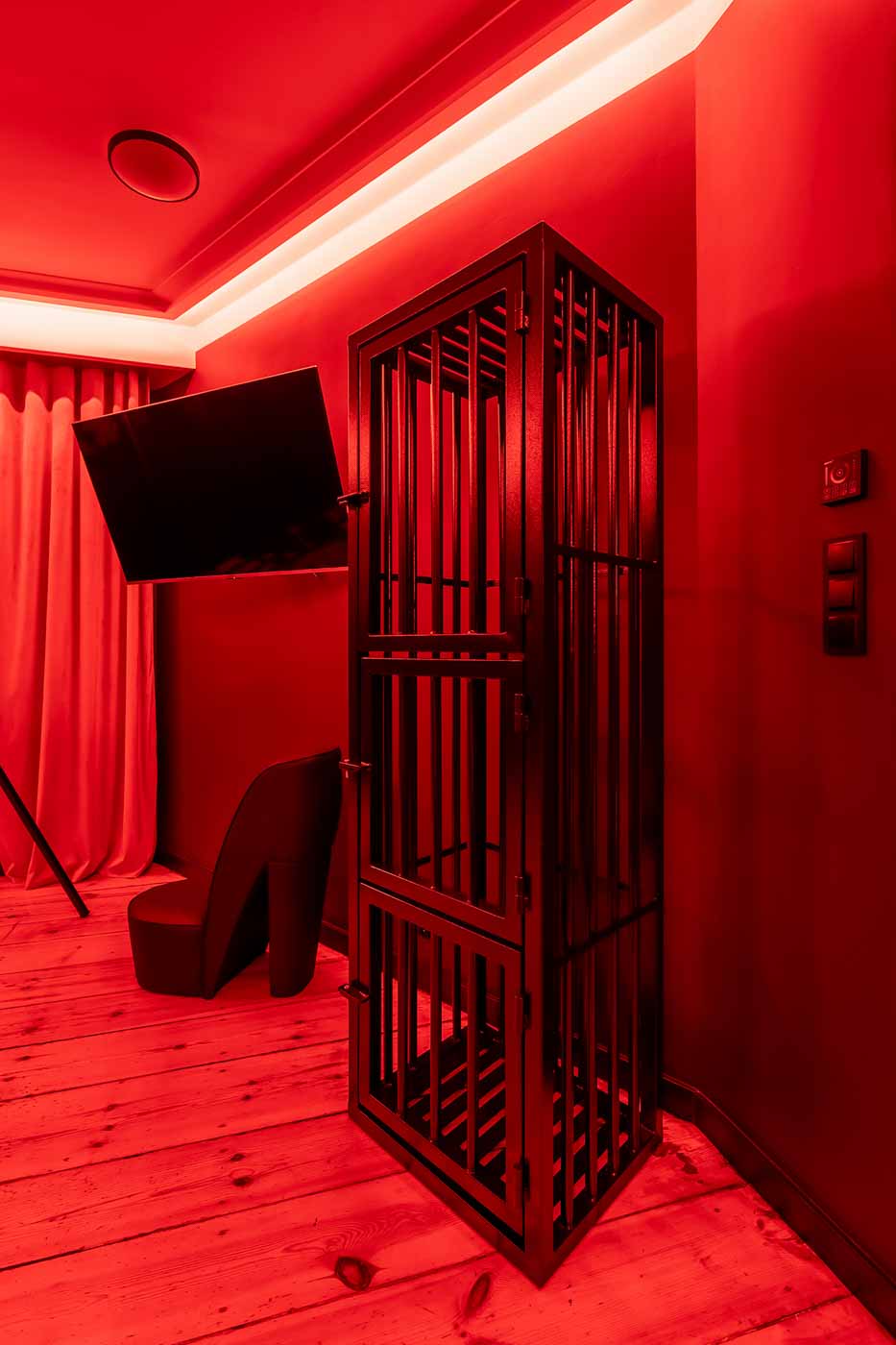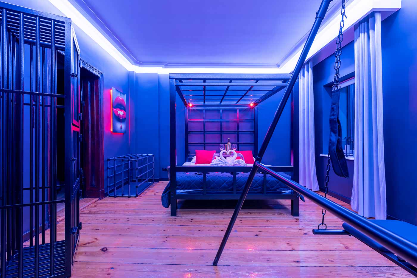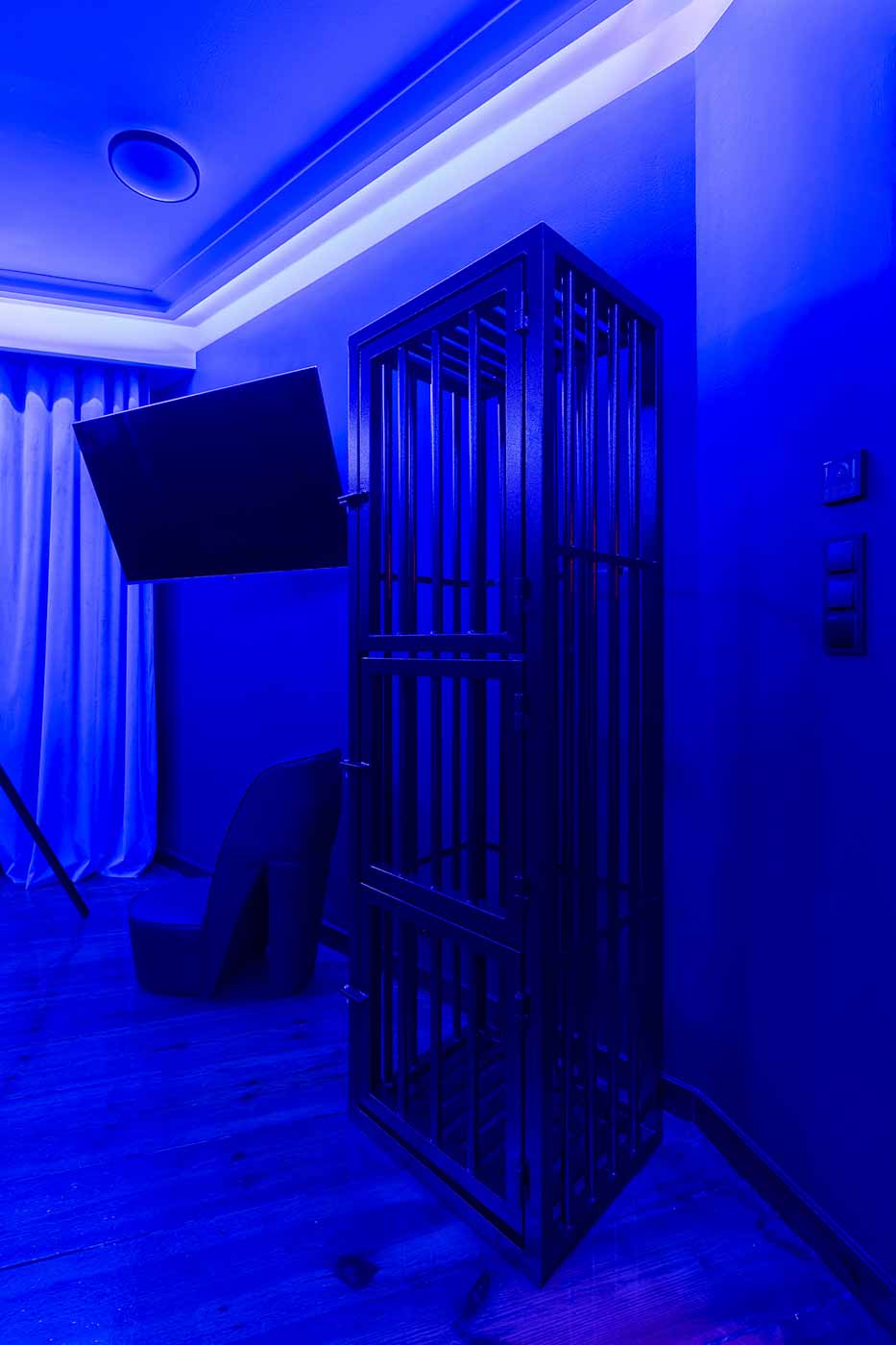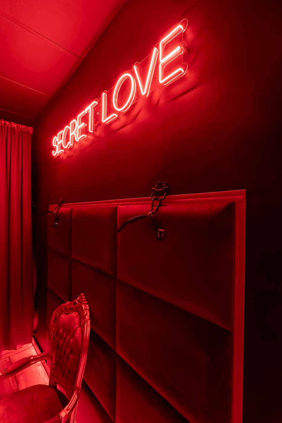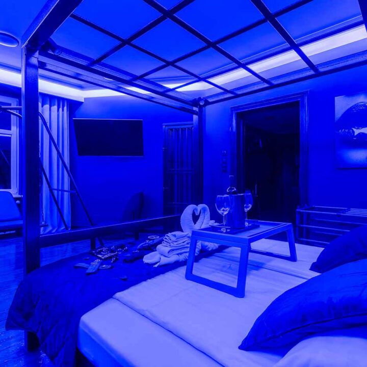 Secret Love BDSM & MYSTERY łączy klimat prywatnego klubu z elementem gry i ciekawości. To apartament, w którym światło, scenografia i układ pomieszczeń same prowadzą przez kolejne strefy – od komfortowego pobytu i części towarzyskiej, po wyraźnie wydzieloną przestrzeń BDSM. Całość działa w kilku „trybach”: może być intensywnie i klubowo (czerwień), chłodniej i bardziej tajemniczo (niebieski), albo bardziej „eventowo” i energetycznie (zieleń). W każdym wariancie zostaje jedno: atmosfera, która robi wrażenie.