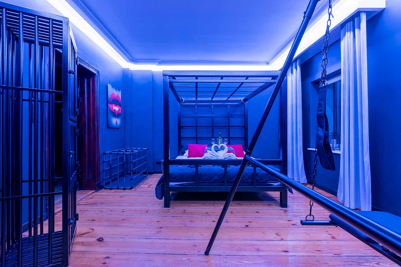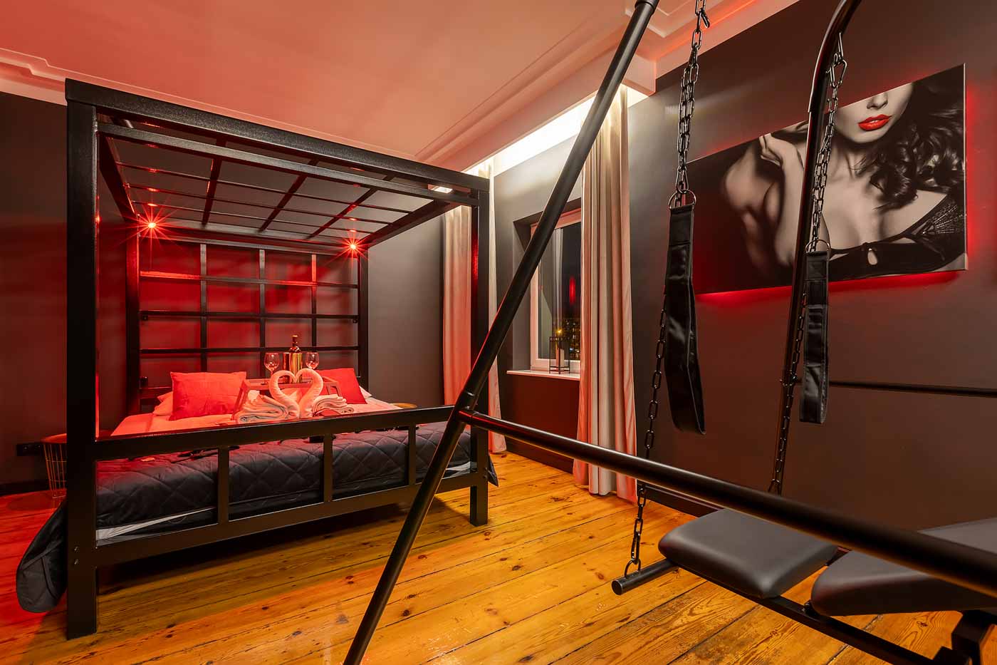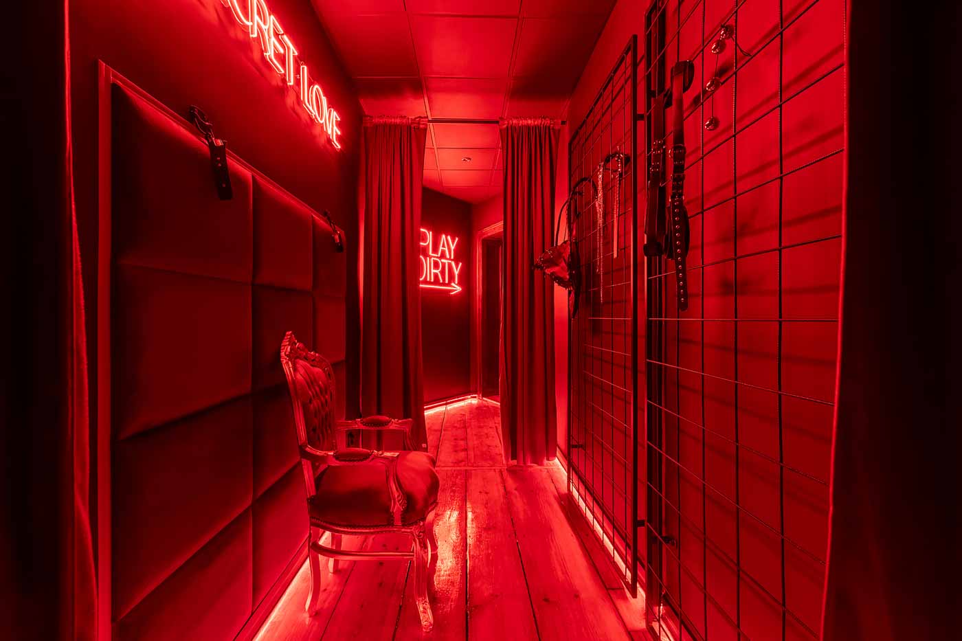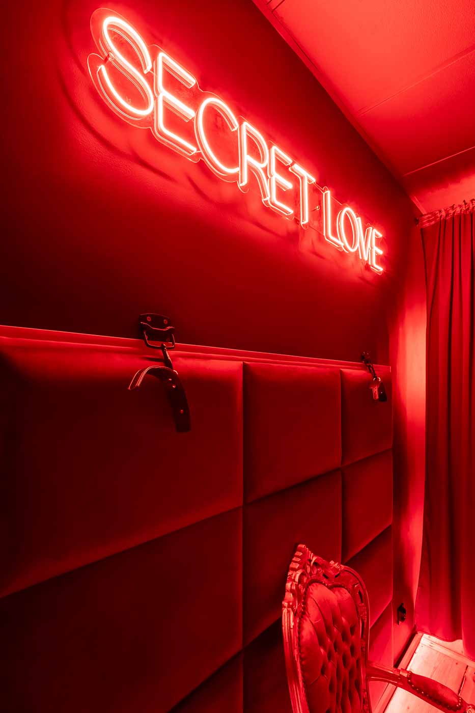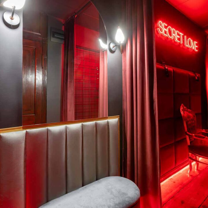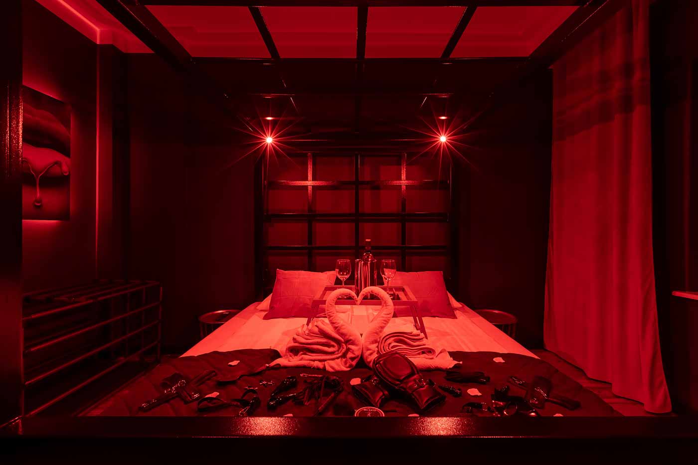 Secret Love BDSM & MYSTERY łączy klimat prywatnego klubu z elementem gry i ciekawości. To apartament, w którym światło, scenografia i układ pomieszczeń same prowadzą przez kolejne strefy – od komfortowego pobytu i części towarzyskiej, po wyraźnie wydzieloną przestrzeń BDSM. Całość działa w kilku „trybach”: może być intensywnie i klubowo (czerwień), chłodniej i bardziej tajemniczo (niebieski), albo bardziej „eventowo” i energetycznie (zieleń). W każdym wariancie zostaje jedno: atmosfera, która robi wrażenie.