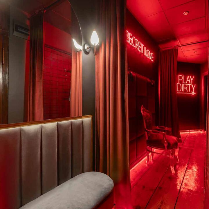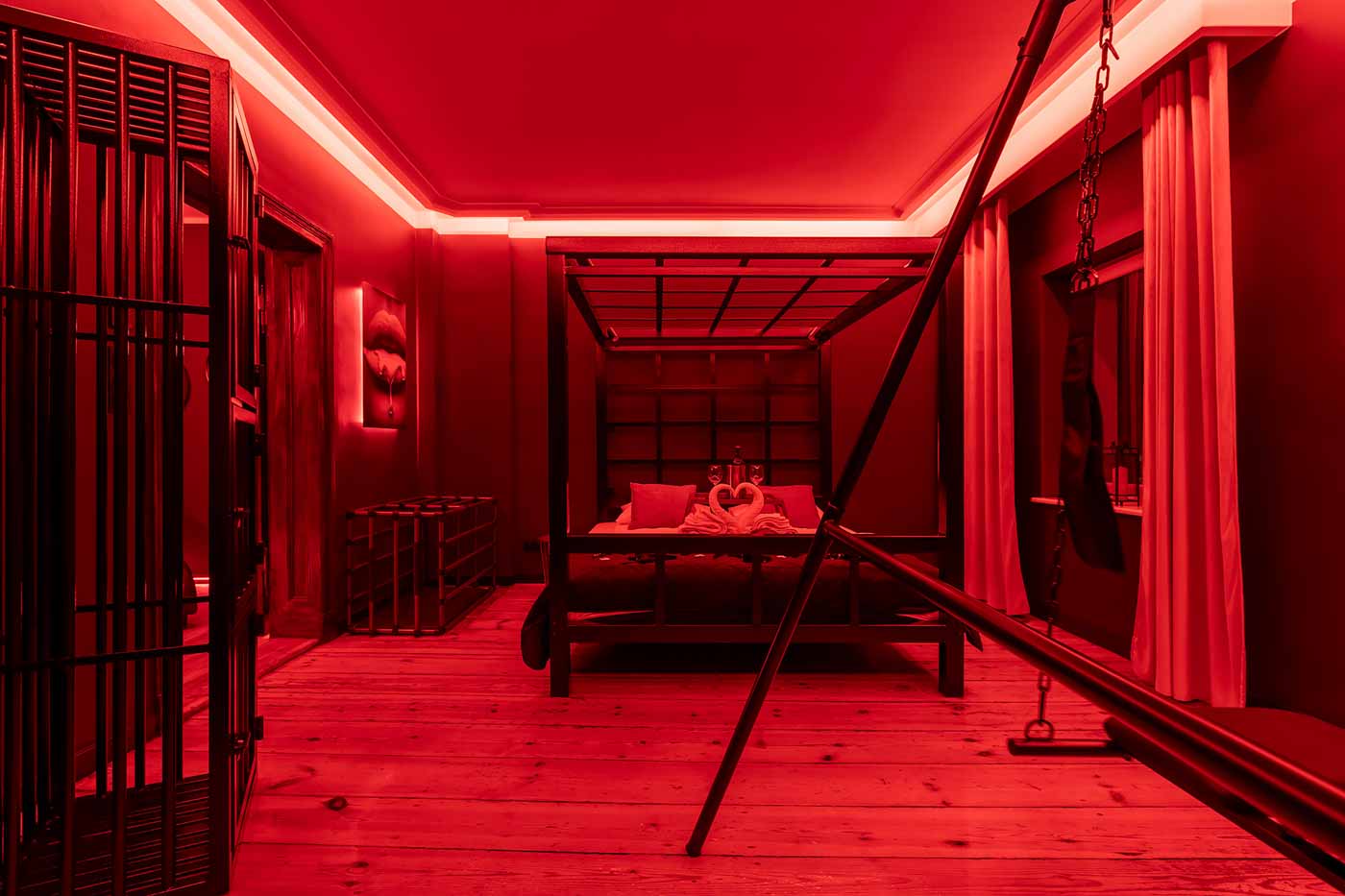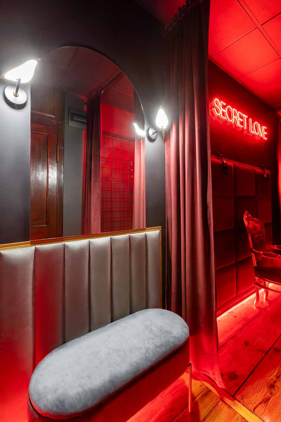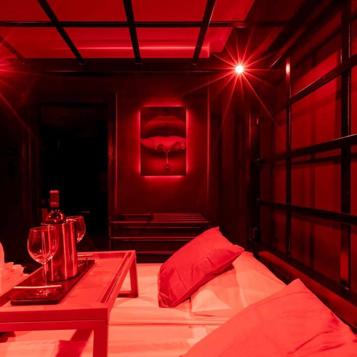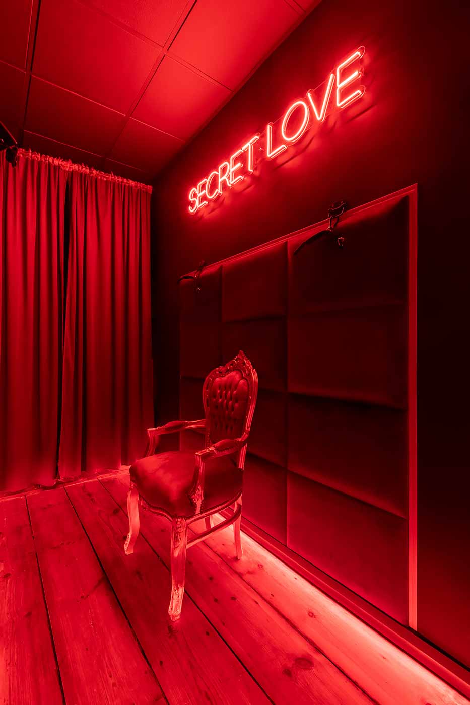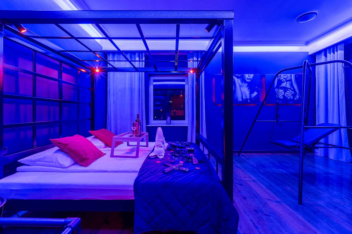 Secret Love BDSM & MYSTERY łączy klimat prywatnego klubu z elementem gry i ciekawości. To apartament, w którym światło, scenografia i układ pomieszczeń same prowadzą przez kolejne strefy – od komfortowego pobytu i części towarzyskiej, po wyraźnie wydzieloną przestrzeń BDSM. Całość działa w kilku „trybach”: może być intensywnie i klubowo (czerwień), chłodniej i bardziej tajemniczo (niebieski), albo bardziej „eventowo” i energetycznie (zieleń). W każdym wariancie zostaje jedno: atmosfera, która robi wrażenie.