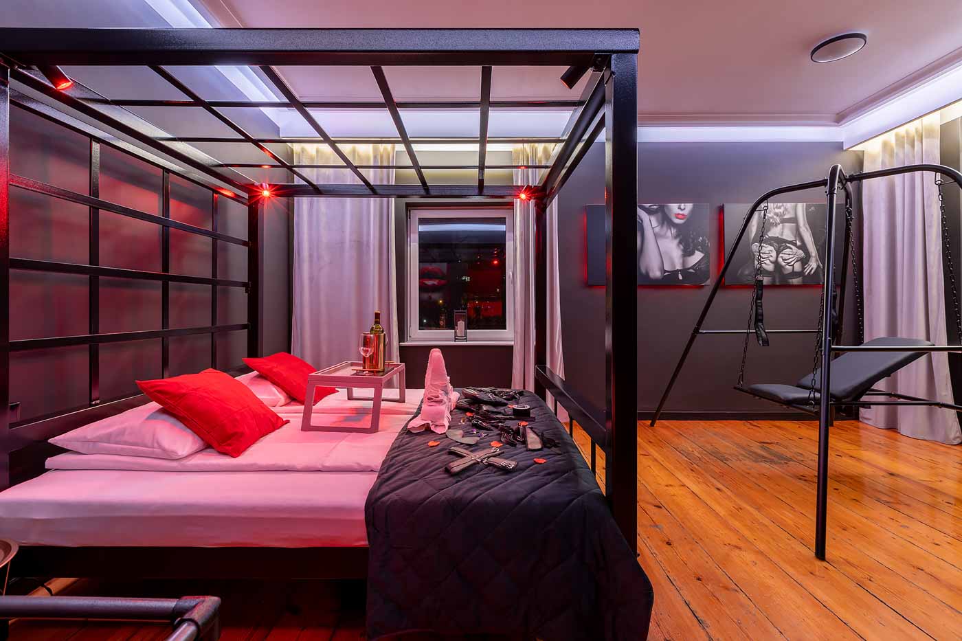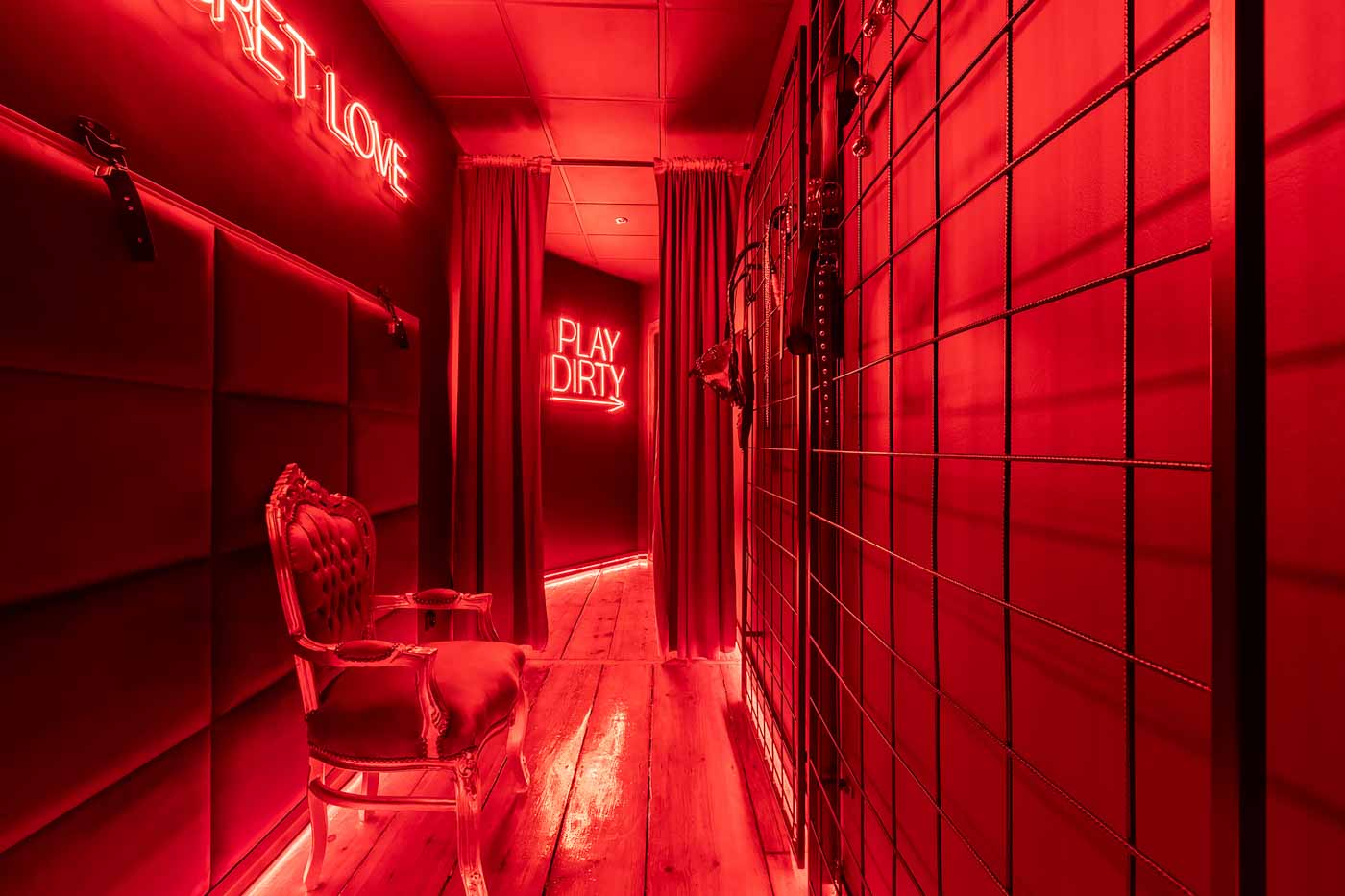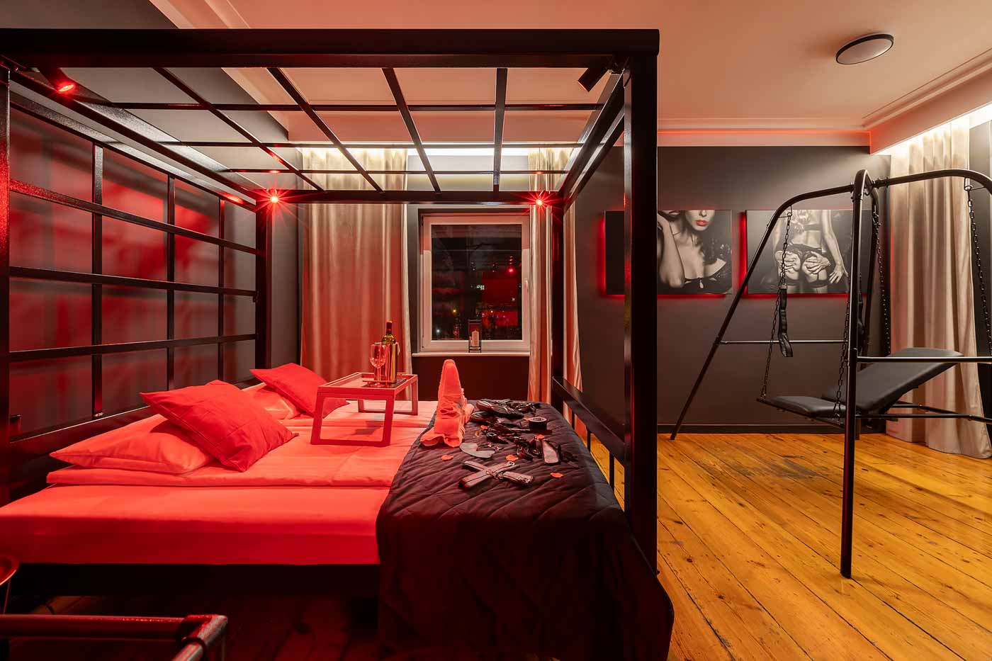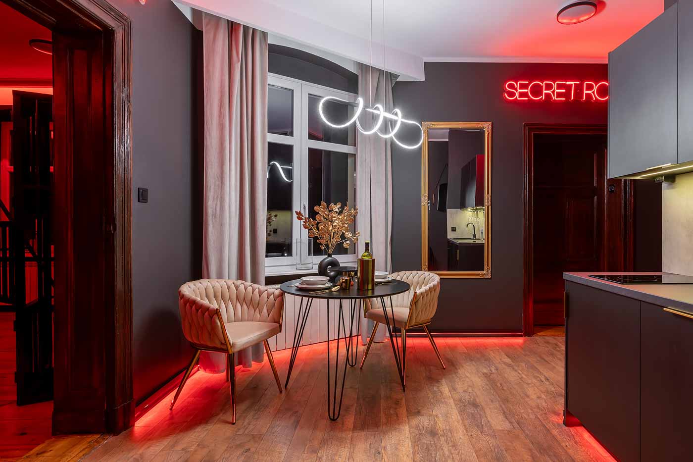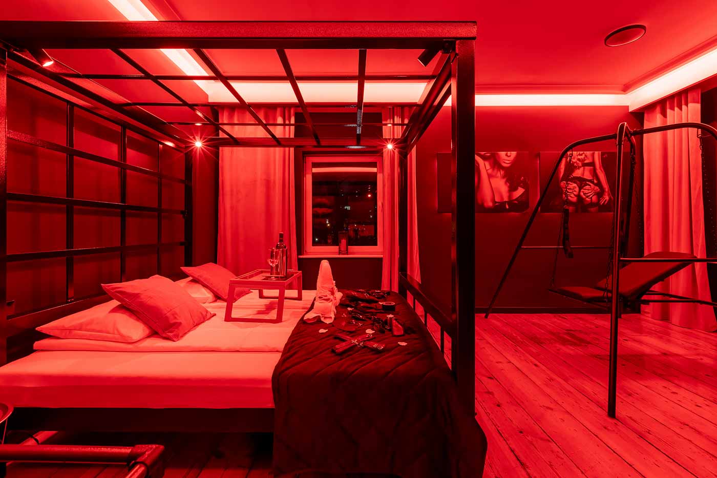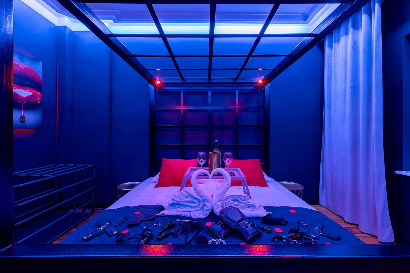Secret Love BDSM & MYSTERY łączy klimat prywatnego klubu z elementem gry i ciekawości. To apartament, w którym światło, scenografia i układ pomieszczeń same prowadzą przez kolejne strefy – od komfortowego pobytu i części towarzyskiej, po wyraźnie wydzieloną przestrzeń BDSM. Całość działa w kilku „trybach”: może być intensywnie i klubowo (czerwień), chłodniej i bardziej tajemniczo (niebieski), albo bardziej „eventowo” i energetycznie (zieleń). W każdym wariancie zostaje jedno: atmosfera, która robi wrażenie.