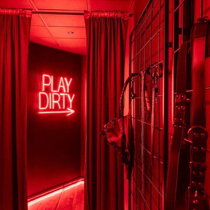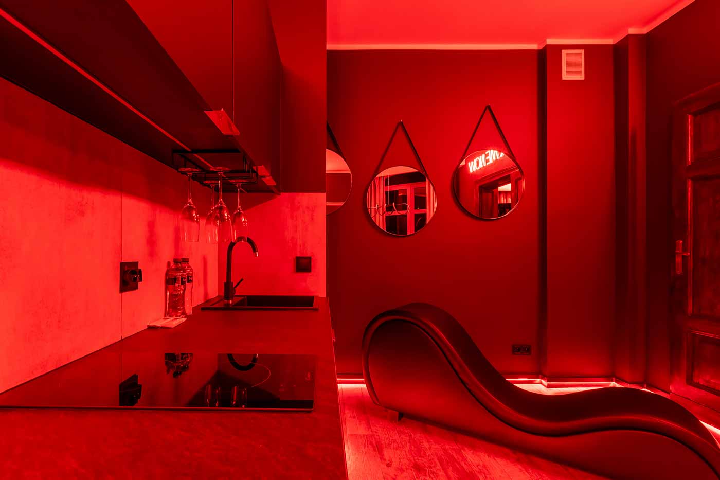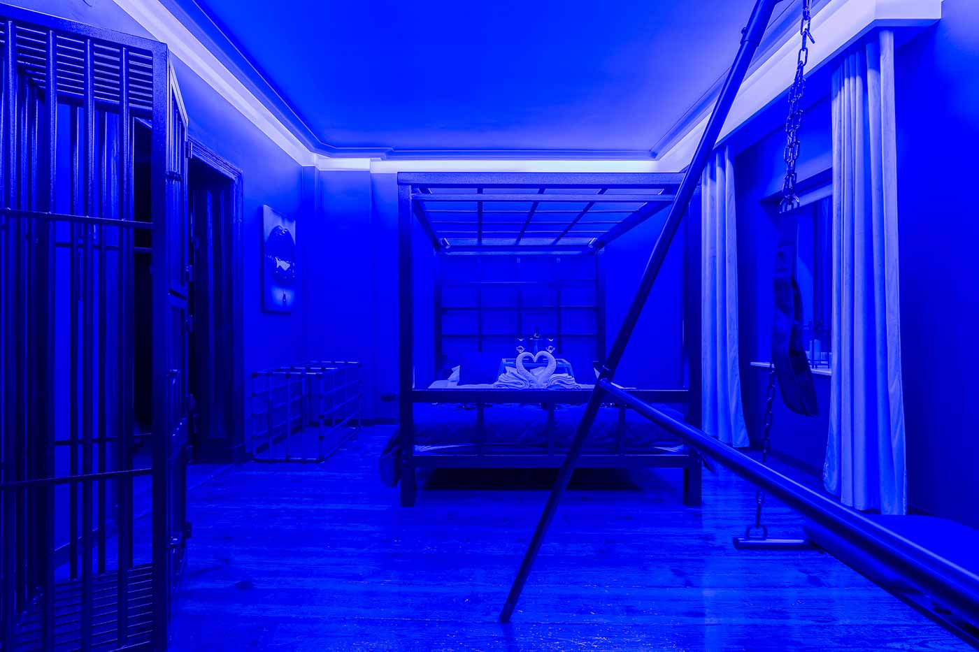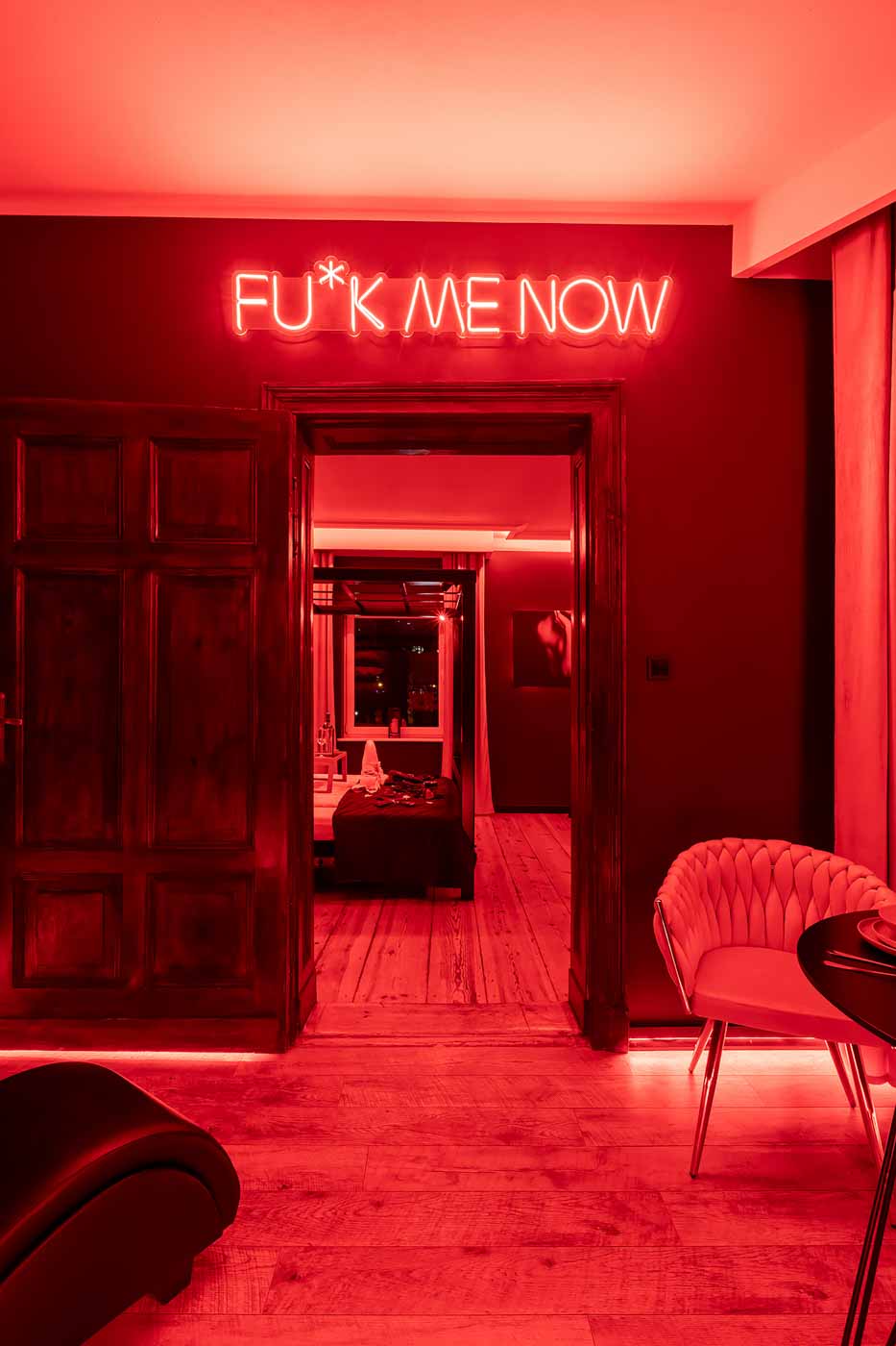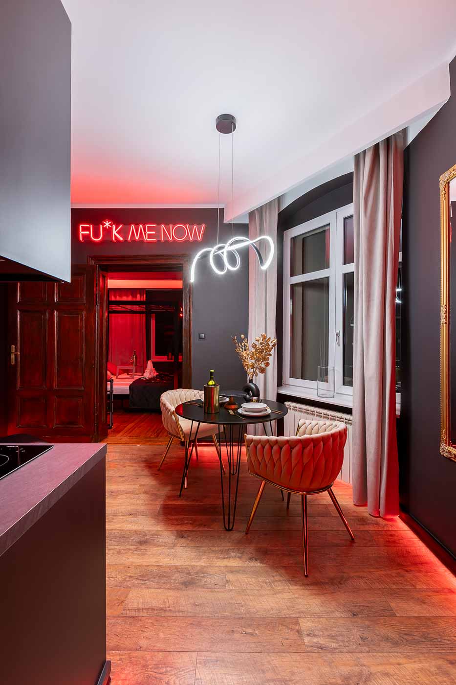 Secret Love BDSM & MYSTERY łączy klimat prywatnego klubu z elementem gry i ciekawości. To apartament, w którym światło, scenografia i układ pomieszczeń same prowadzą przez kolejne strefy – od komfortowego pobytu i części towarzyskiej, po wyraźnie wydzieloną przestrzeń BDSM. Całość działa w kilku „trybach”: może być intensywnie i klubowo (czerwień), chłodniej i bardziej tajemniczo (niebieski), albo bardziej „eventowo” i energetycznie (zieleń). W każdym wariancie zostaje jedno: atmosfera, która robi wrażenie.
