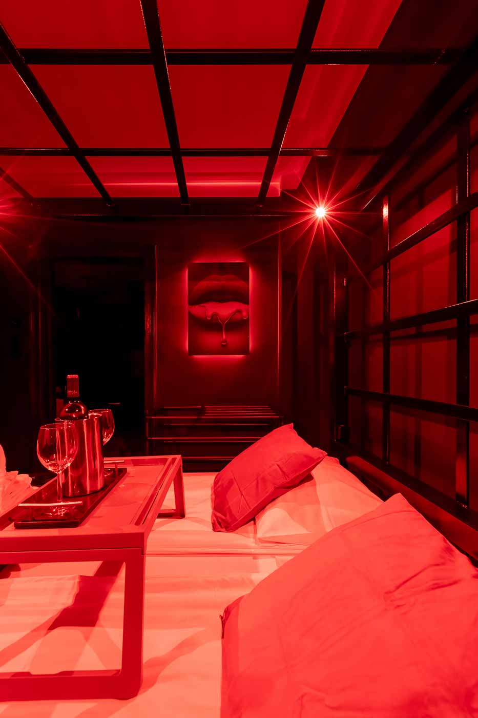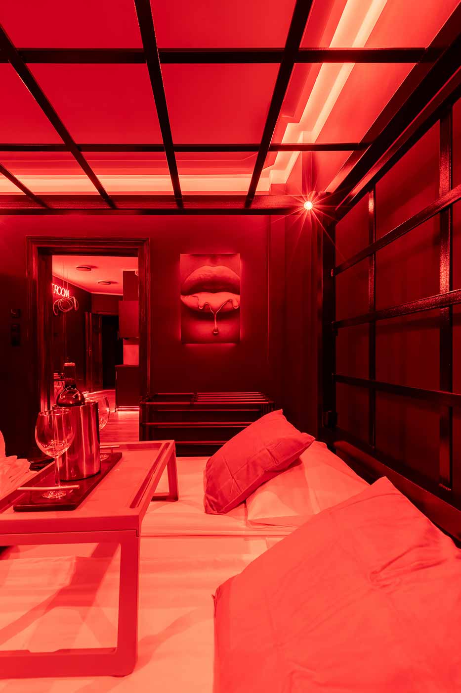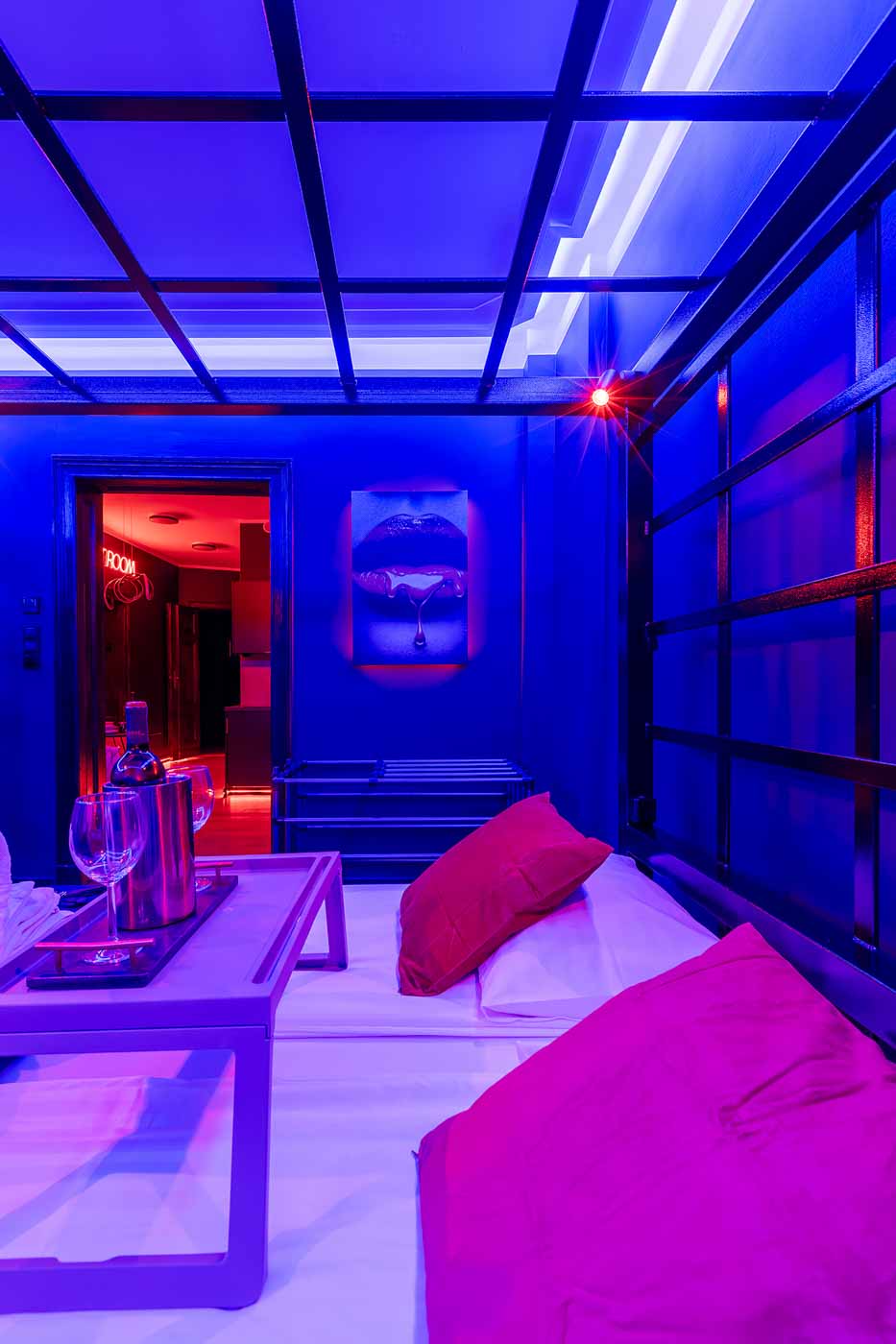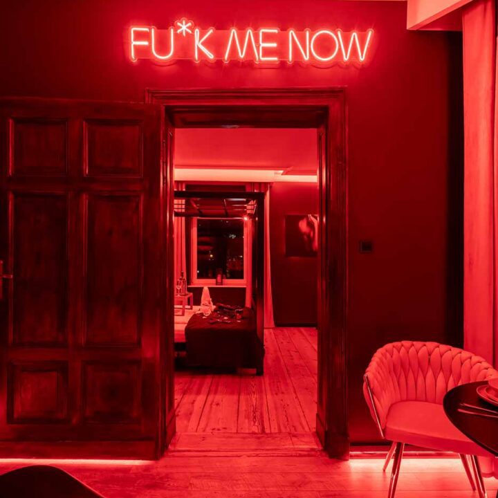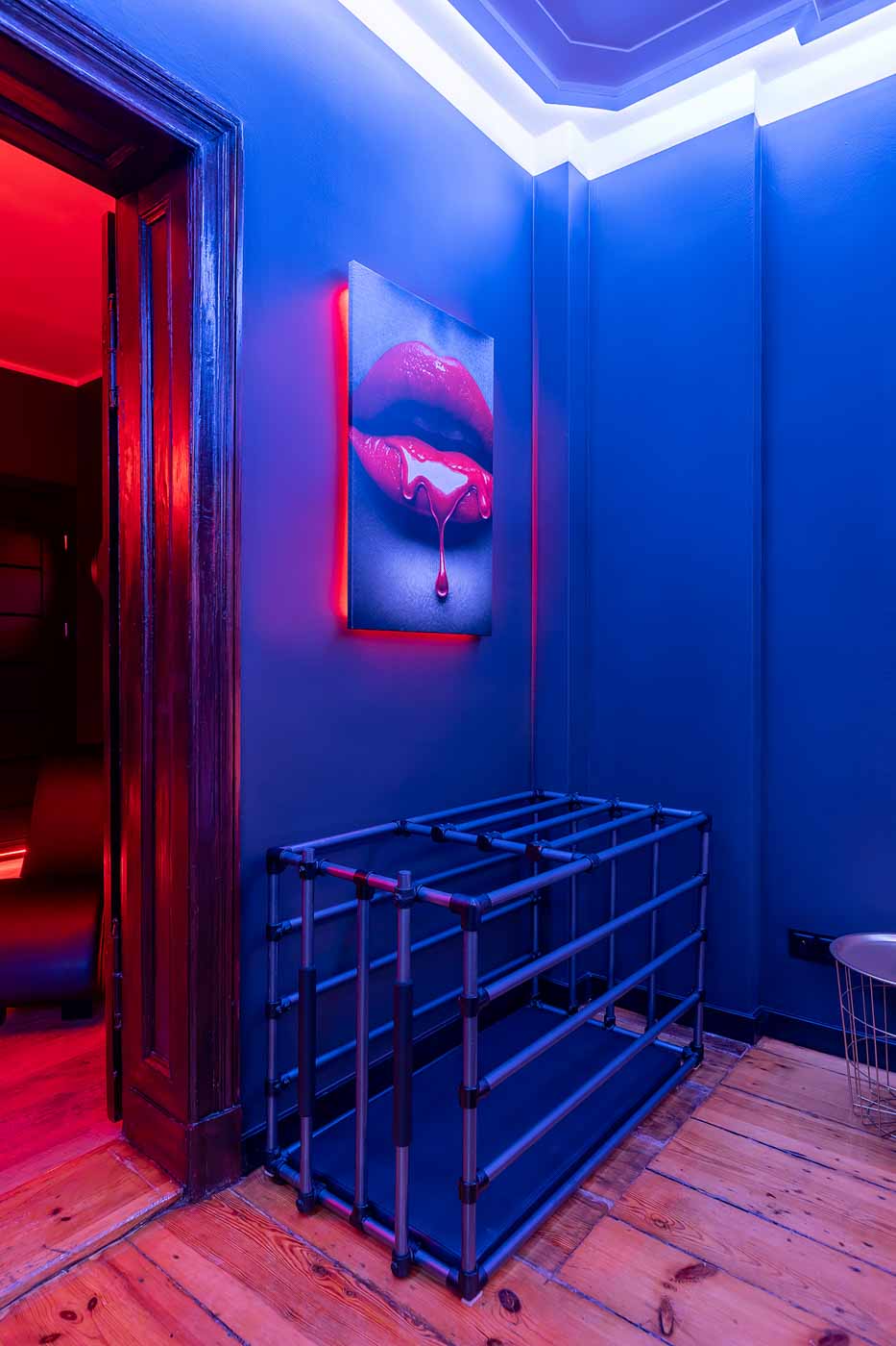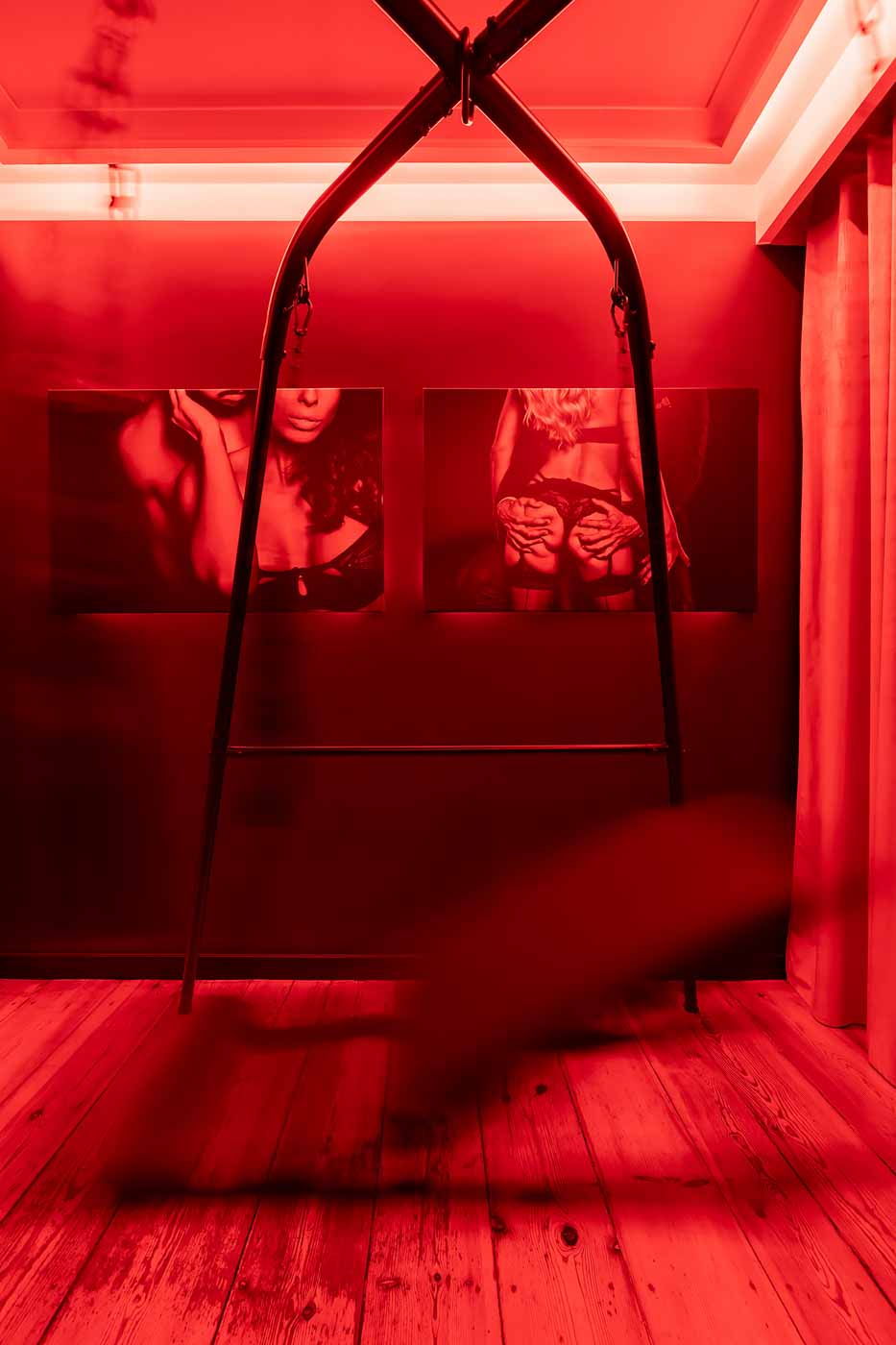 Secret Love BDSM & MYSTERY łączy klimat prywatnego klubu z elementem gry i ciekawości. To apartament, w którym światło, scenografia i układ pomieszczeń same prowadzą przez kolejne strefy – od komfortowego pobytu i części towarzyskiej, po wyraźnie wydzieloną przestrzeń BDSM. Całość działa w kilku „trybach”: może być intensywnie i klubowo (czerwień), chłodniej i bardziej tajemniczo (niebieski), albo bardziej „eventowo” i energetycznie (zieleń). W każdym wariancie zostaje jedno: atmosfera, która robi wrażenie.