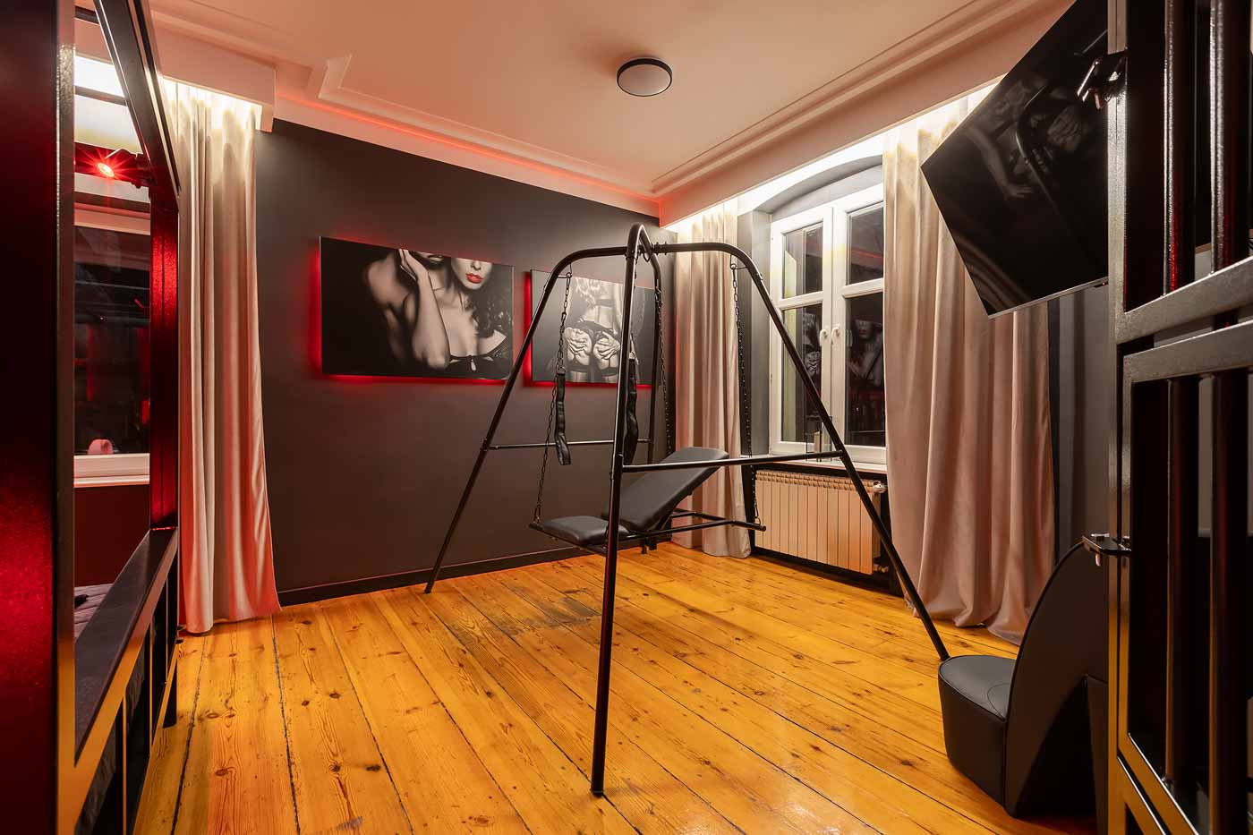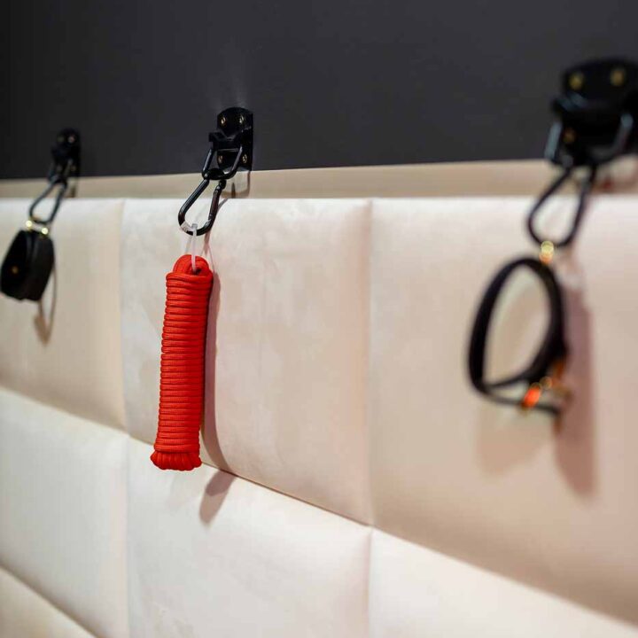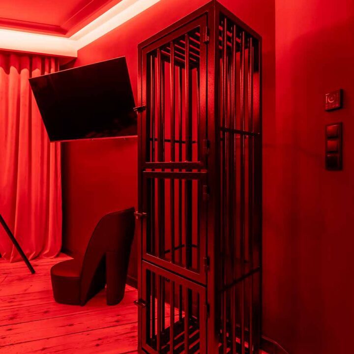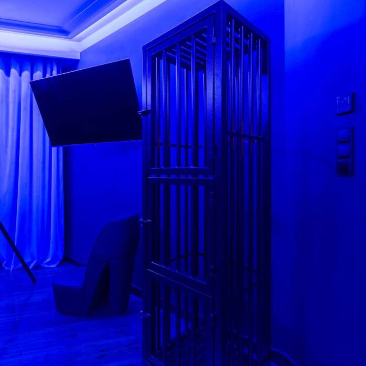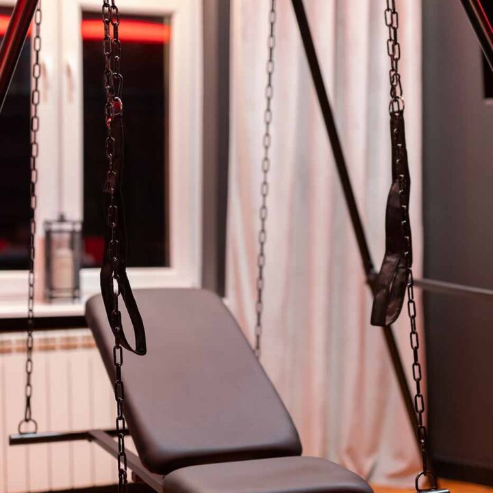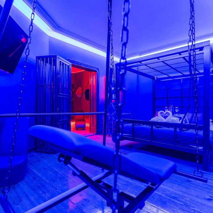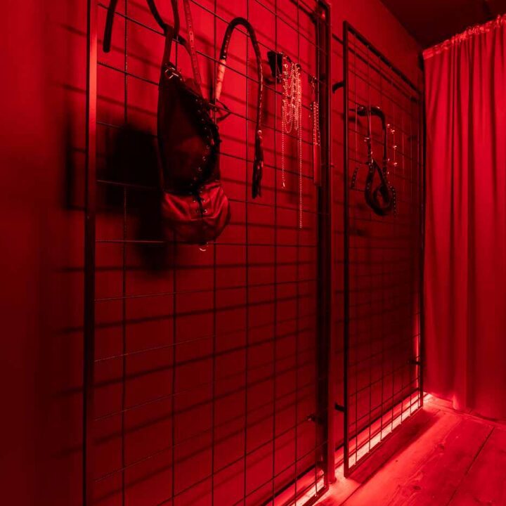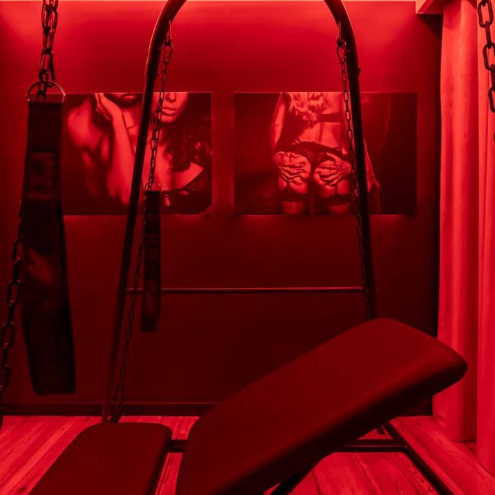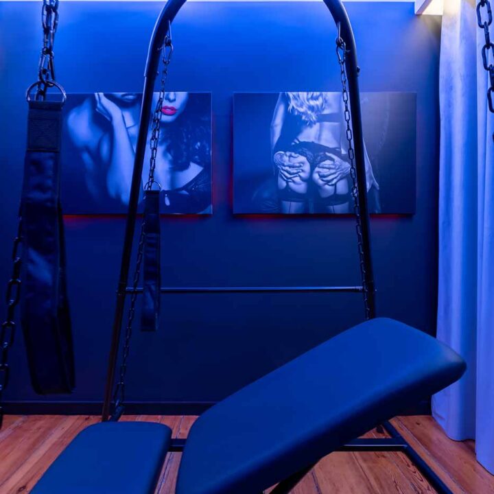 Część BDSM ma mocno klubową oprawę: kratownice, metalowe elementy i scenograficzne podświetlenia budują przestrzeń, która jest gotowa do użycia bez improwizowania aranżacji. Są tu rozwiązania, które pozwalają prowadzić zabawę w różnych wariantach – od bardziej „estetycznych i kontrolowanych” po intensywniejsze, zależnie od granic i nastroju. Dużą przewagą tej strefy jest to, że daje wrażenie uporządkowania: wszystko jest spójne, czytelne i „na miejscu”.