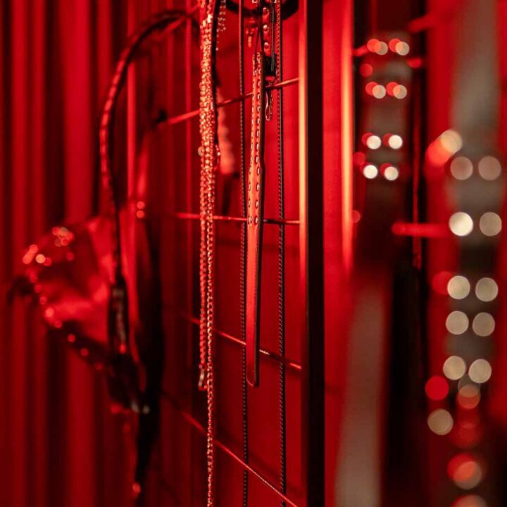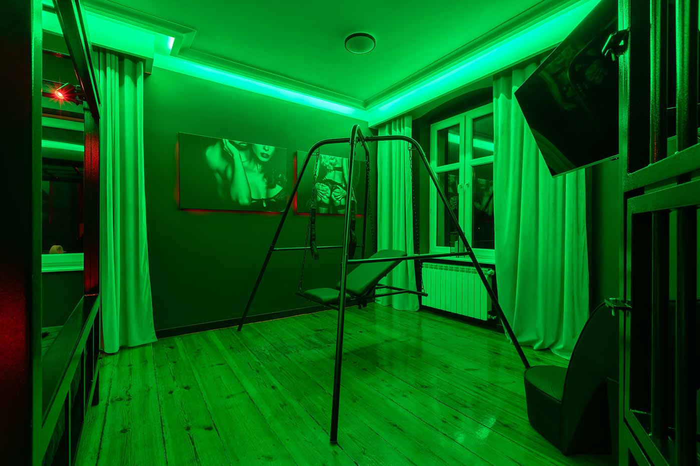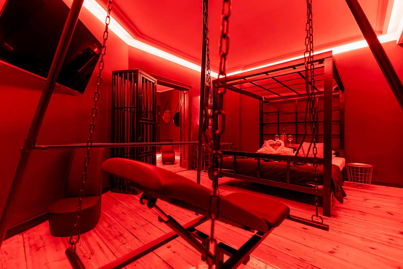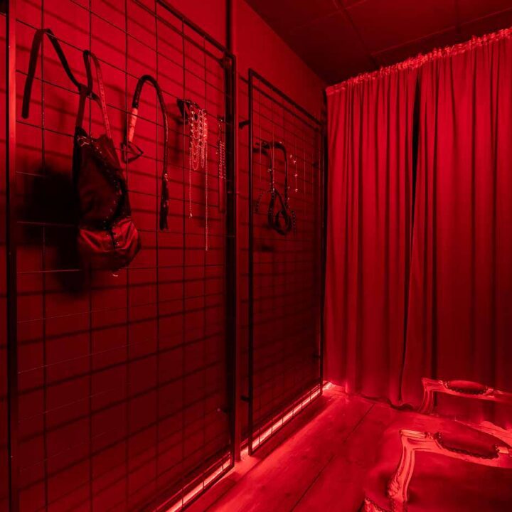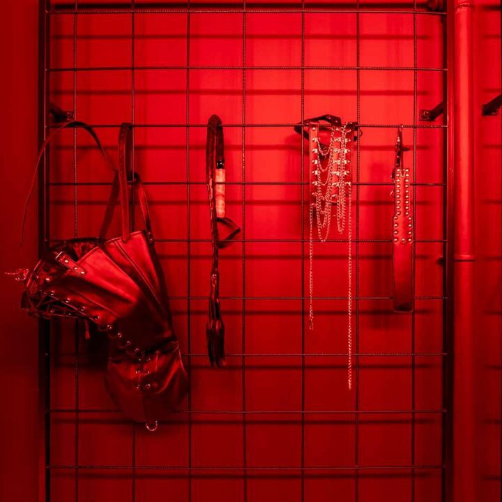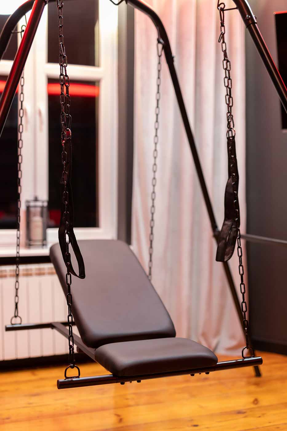Część BDSM ma mocno klubową oprawę: kratownice, metalowe elementy i scenograficzne podświetlenia budują przestrzeń, która jest gotowa do użycia bez improwizowania aranżacji. Są tu rozwiązania, które pozwalają prowadzić zabawę w różnych wariantach – od bardziej „estetycznych i kontrolowanych” po intensywniejsze, zależnie od granic i nastroju. Dużą przewagą tej strefy jest to, że daje wrażenie uporządkowania: wszystko jest spójne, czytelne i „na miejscu”.