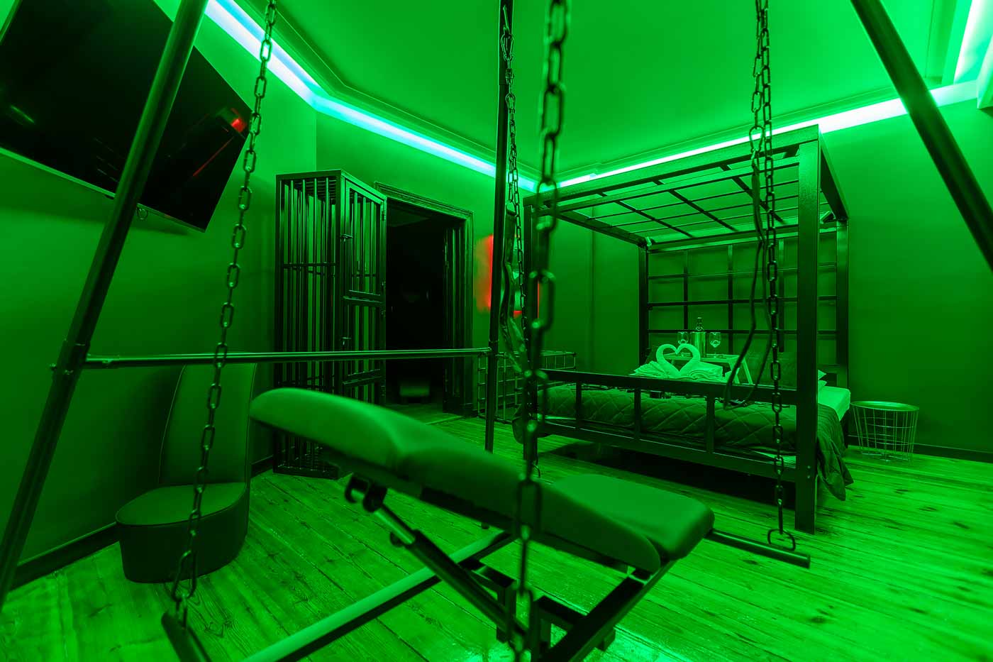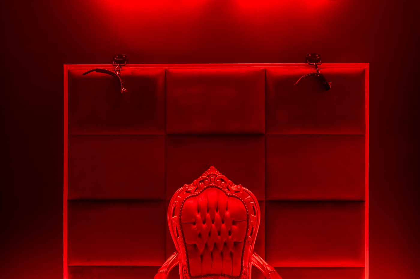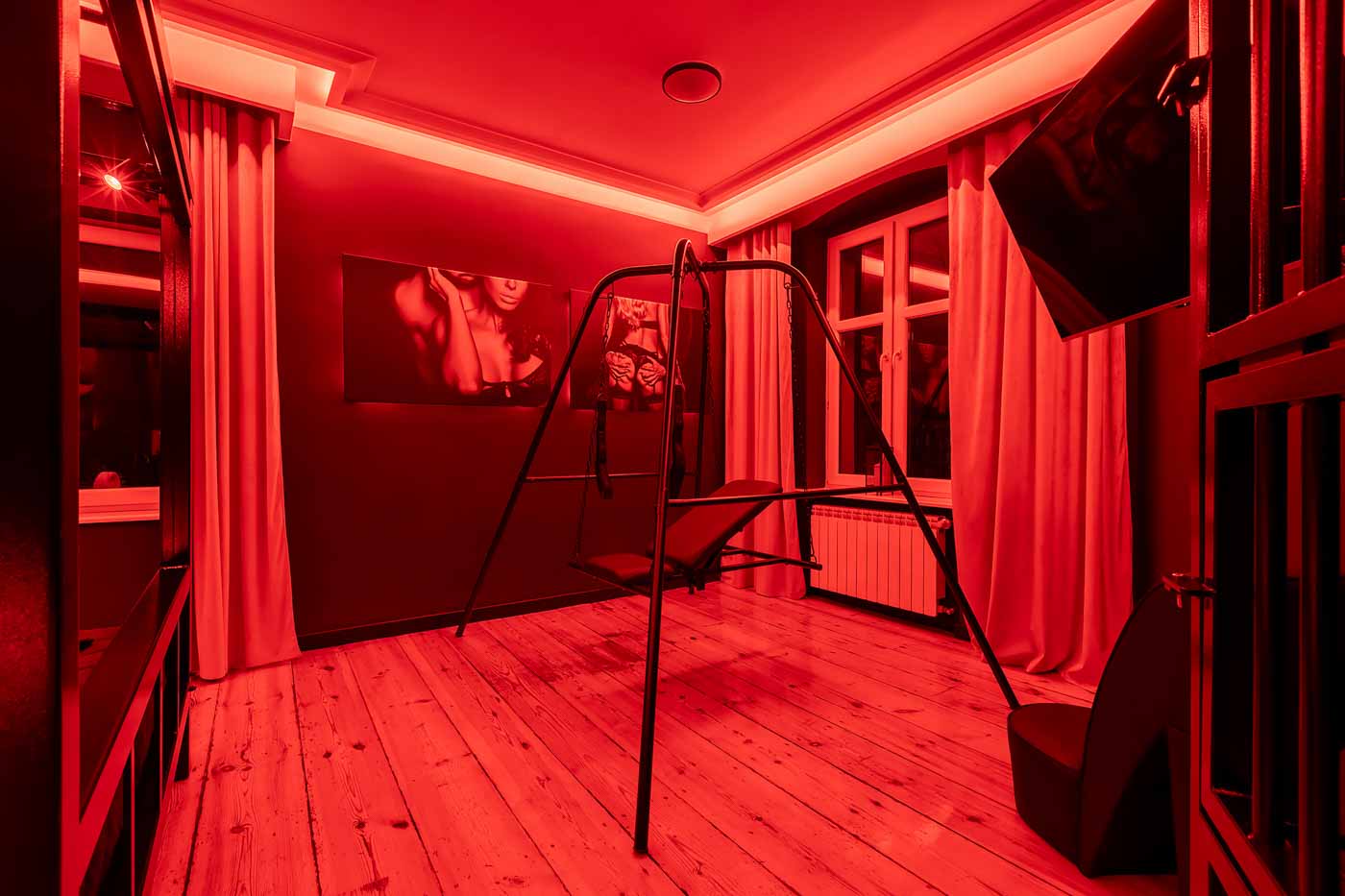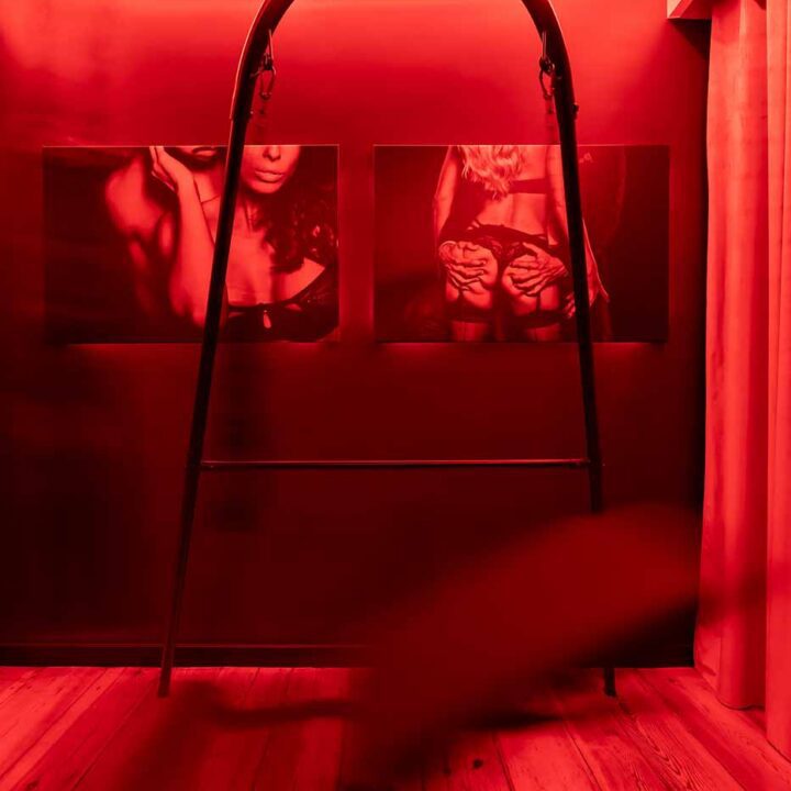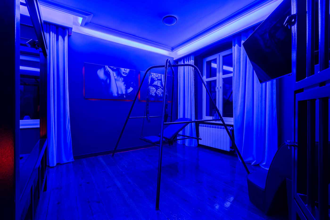 Część BDSM ma mocno klubową oprawę: kratownice, metalowe elementy i scenograficzne podświetlenia budują przestrzeń, która jest gotowa do użycia bez improwizowania aranżacji. Są tu rozwiązania, które pozwalają prowadzić zabawę w różnych wariantach – od bardziej „estetycznych i kontrolowanych” po intensywniejsze, zależnie od granic i nastroju. Dużą przewagą tej strefy jest to, że daje wrażenie uporządkowania: wszystko jest spójne, czytelne i „na miejscu”.
