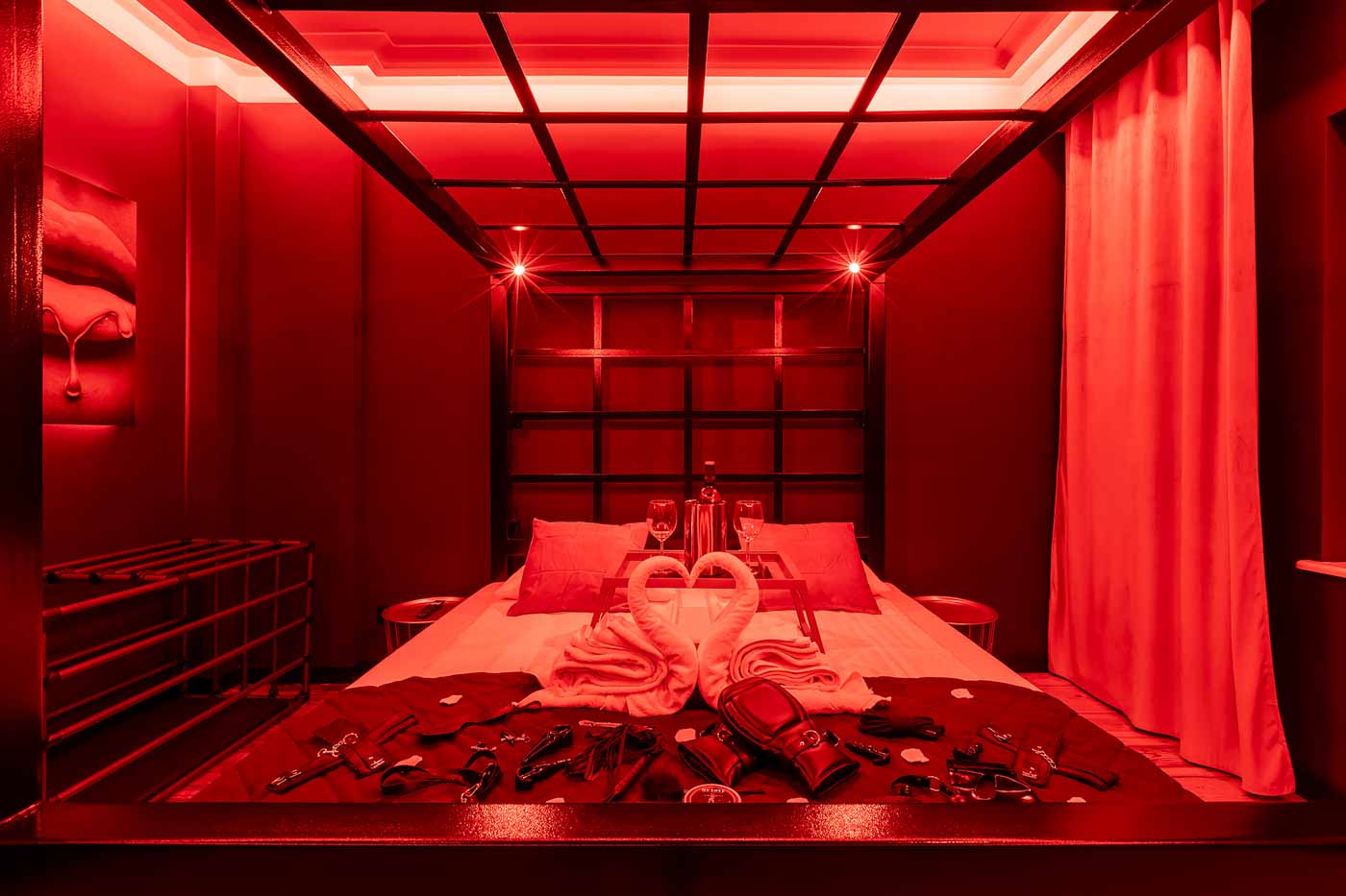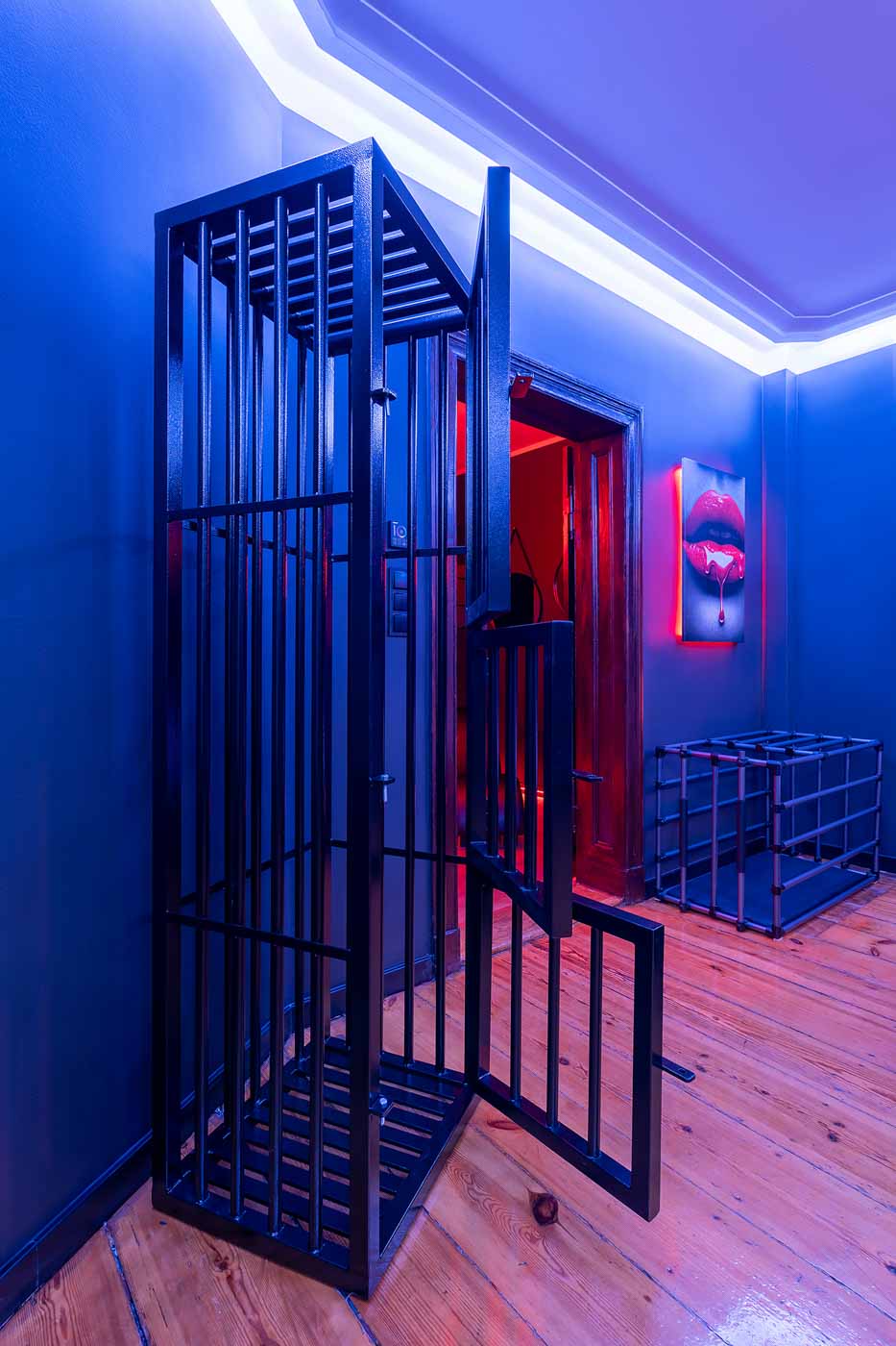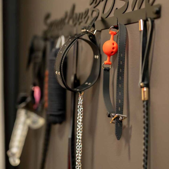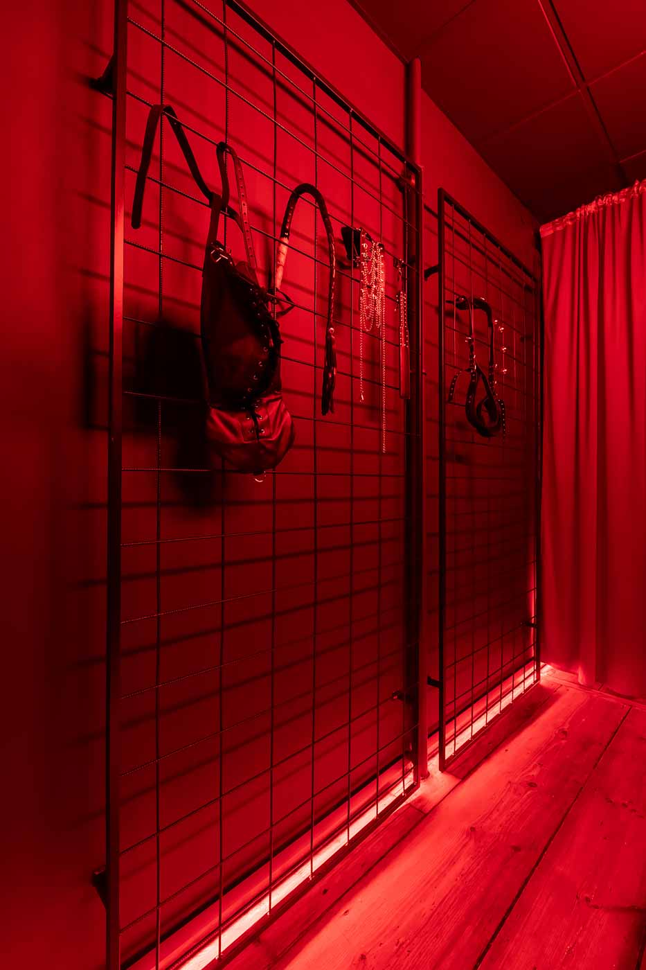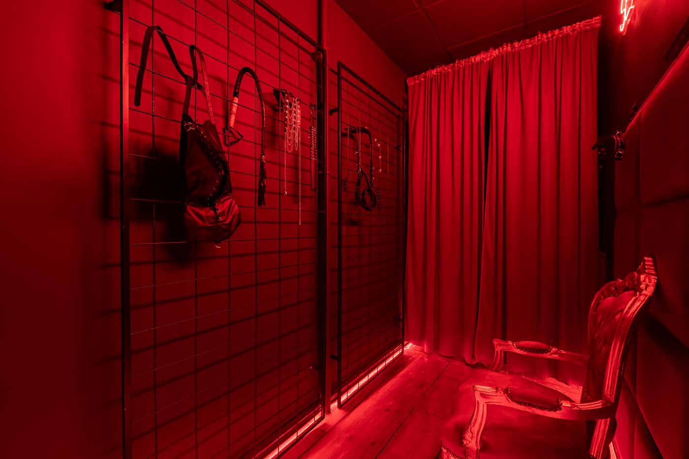 Część BDSM ma mocno klubową oprawę: kratownice, metalowe elementy i scenograficzne podświetlenia budują przestrzeń, która jest gotowa do użycia bez improwizowania aranżacji. Są tu rozwiązania, które pozwalają prowadzić zabawę w różnych wariantach – od bardziej „estetycznych i kontrolowanych” po intensywniejsze, zależnie od granic i nastroju. Dużą przewagą tej strefy jest to, że daje wrażenie uporządkowania: wszystko jest spójne, czytelne i „na miejscu”.