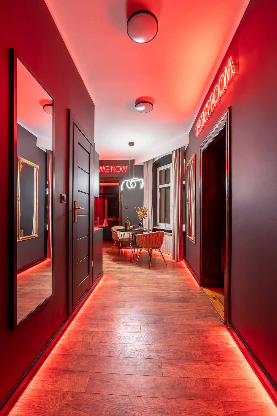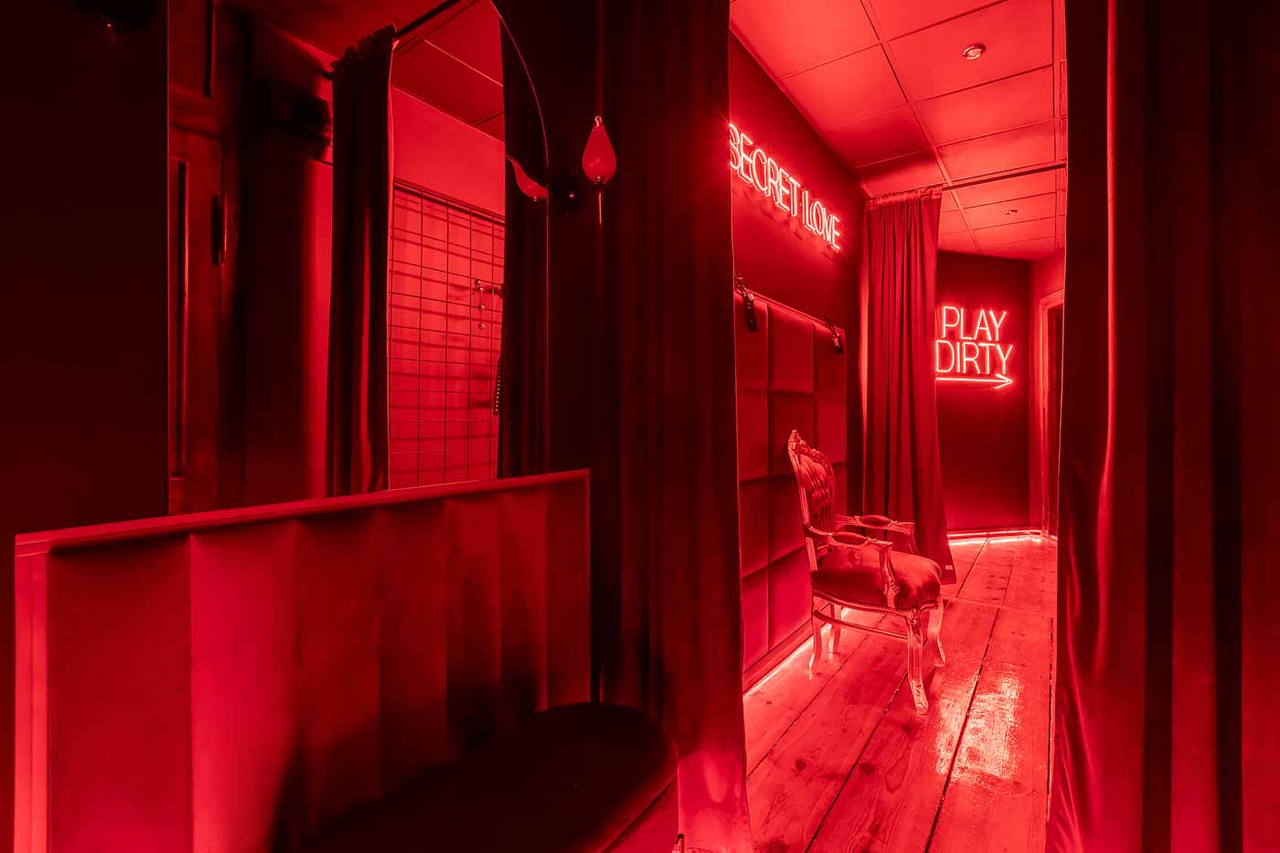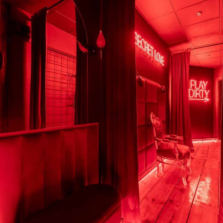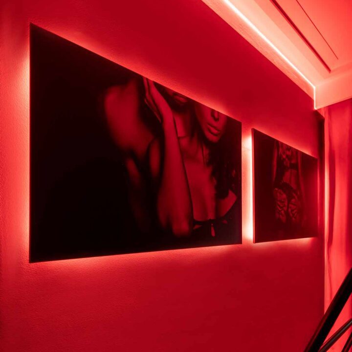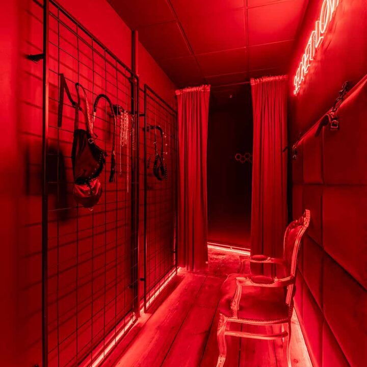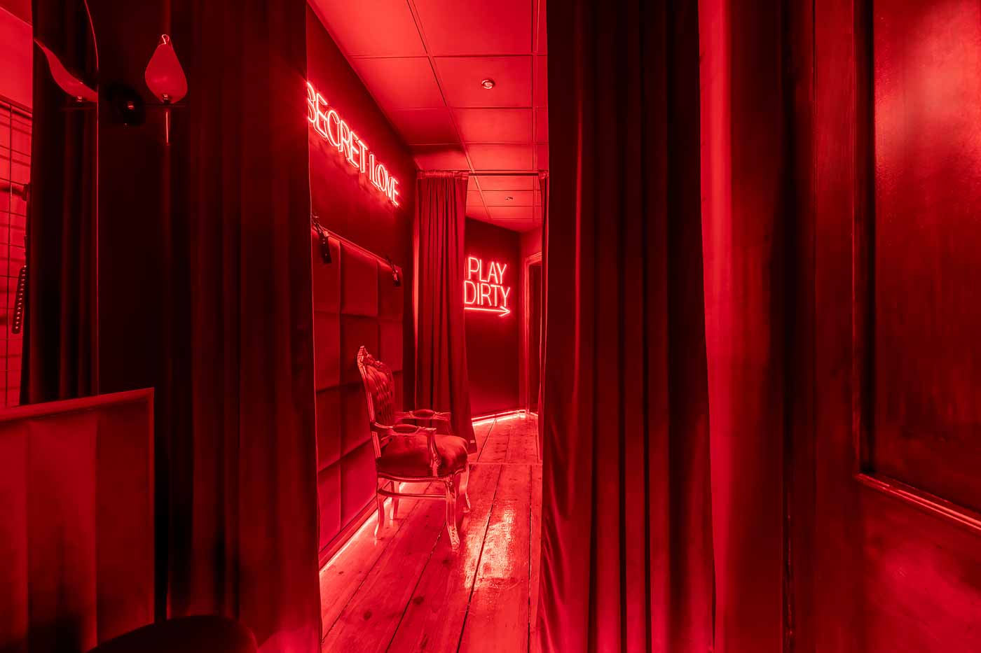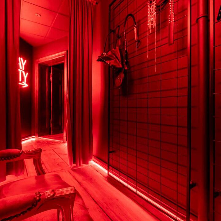 Już od wejścia pracuje oświetlenie LED i mocne, klubowe akcenty – korytarze są zrobione tak, żeby wciągały w klimat. To nie jest zwykłe „przejście” między pokojami, tylko świadomie zaprojektowana część doświadczenia: światło po listwach, mocne czerwienie, neony i zasłony sprawiają, że każda zmiana strefy jest odczuwalna. Ten układ daje komfort kontroli tempa: można wejść spokojnie, a dopiero później podkręcić intensywność.