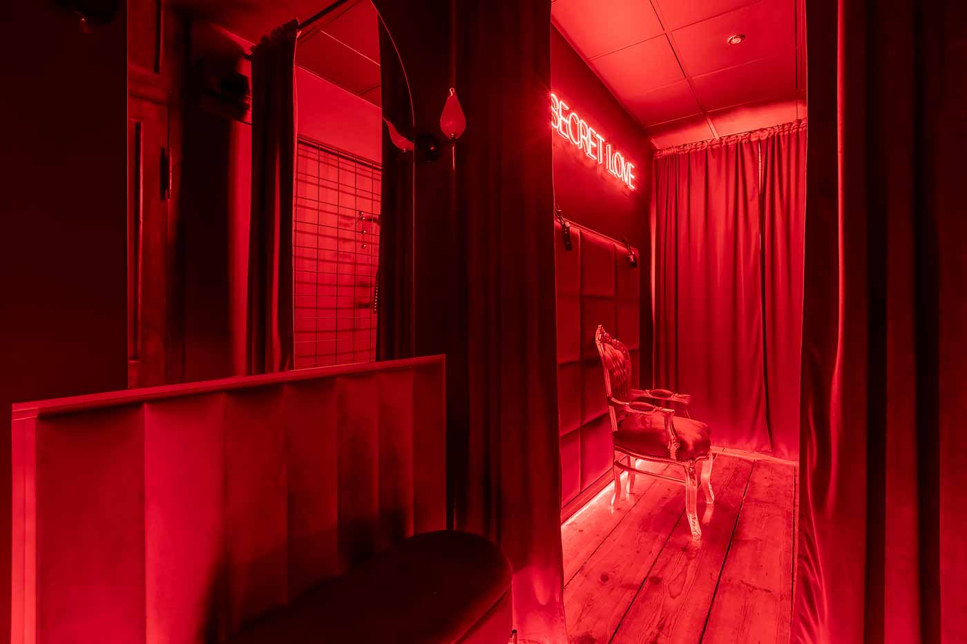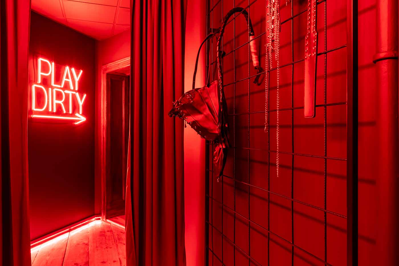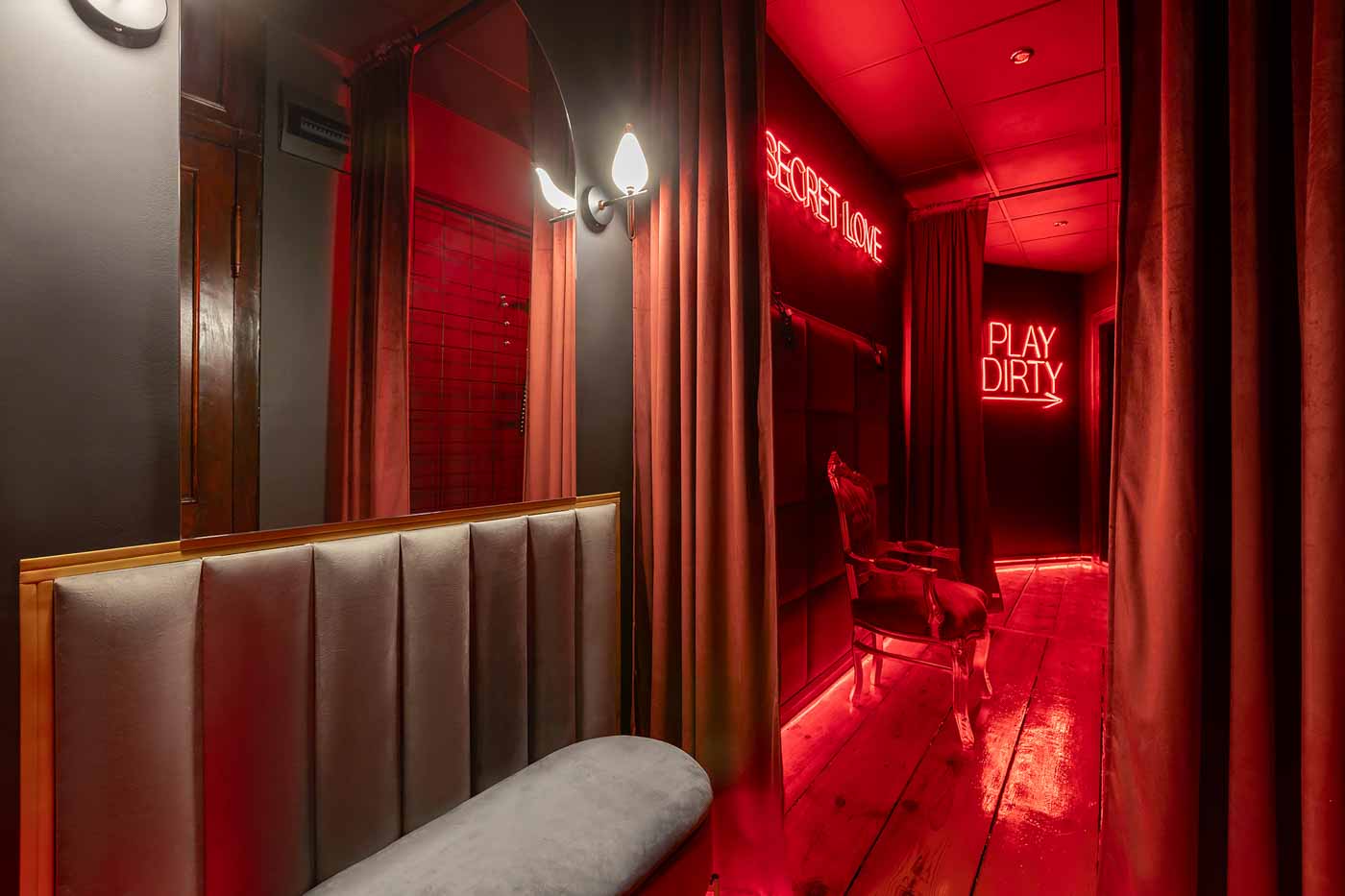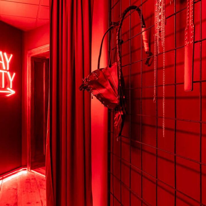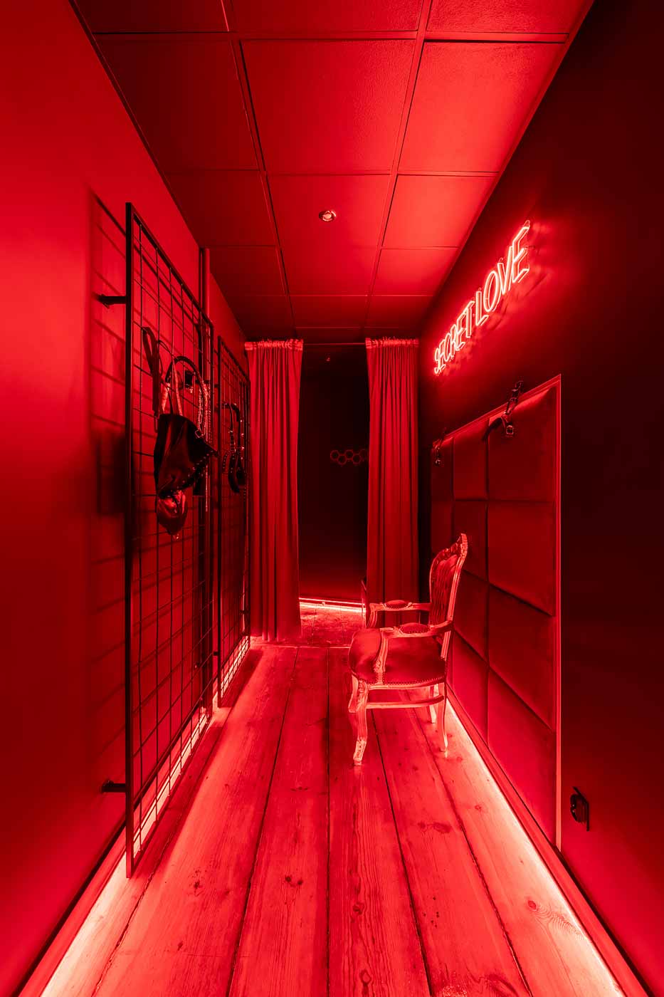 Już od wejścia pracuje oświetlenie LED i mocne, klubowe akcenty – korytarze są zrobione tak, żeby wciągały w klimat. To nie jest zwykłe „przejście” między pokojami, tylko świadomie zaprojektowana część doświadczenia: światło po listwach, mocne czerwienie, neony i zasłony sprawiają, że każda zmiana strefy jest odczuwalna. Ten układ daje komfort kontroli tempa: można wejść spokojnie, a dopiero później podkręcić intensywność.