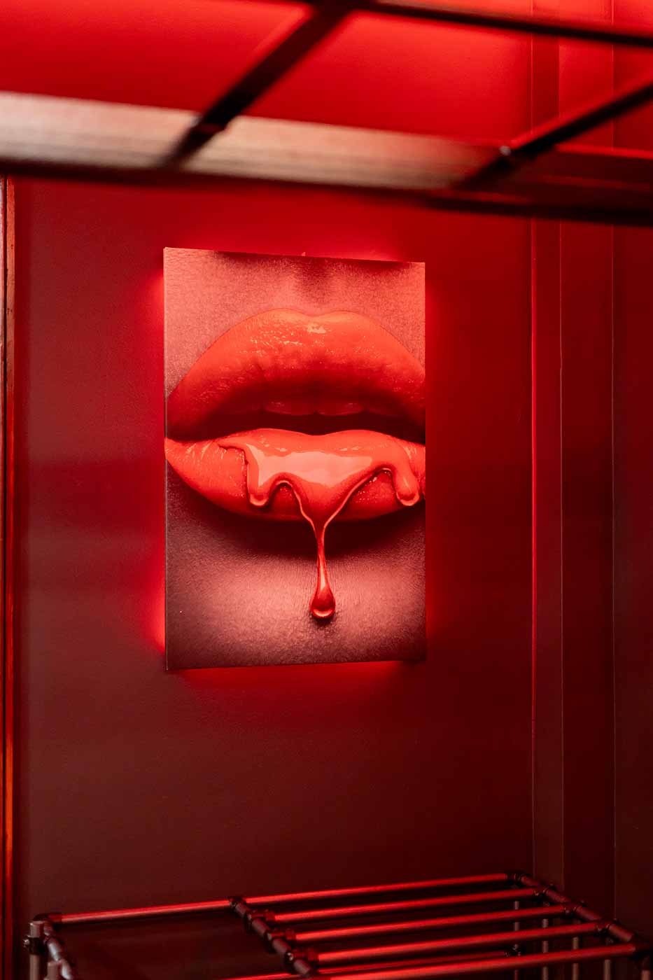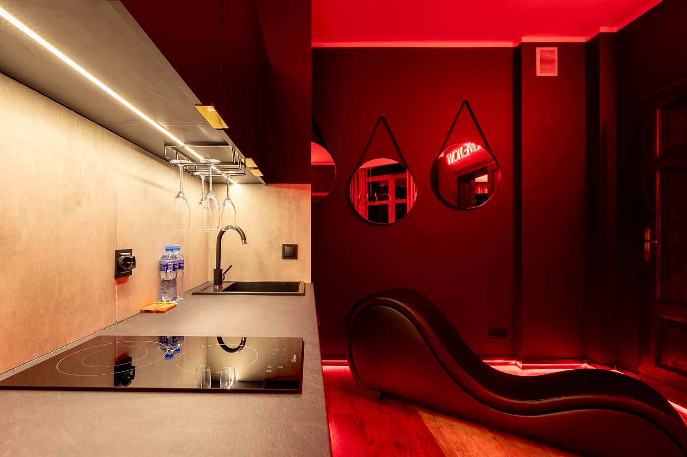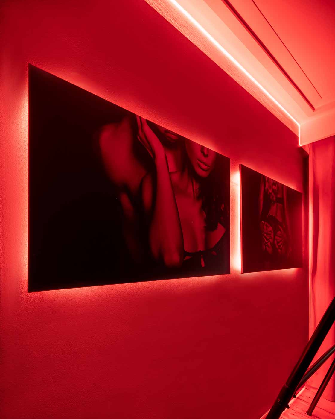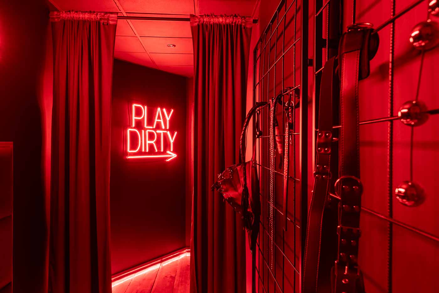 Już od wejścia pracuje oświetlenie LED i mocne, klubowe akcenty – korytarze są zrobione tak, żeby wciągały w klimat. To nie jest zwykłe „przejście” między pokojami, tylko świadomie zaprojektowana część doświadczenia: światło po listwach, mocne czerwienie, neony i zasłony sprawiają, że każda zmiana strefy jest odczuwalna. Ten układ daje komfort kontroli tempa: można wejść spokojnie, a dopiero później podkręcić intensywność.