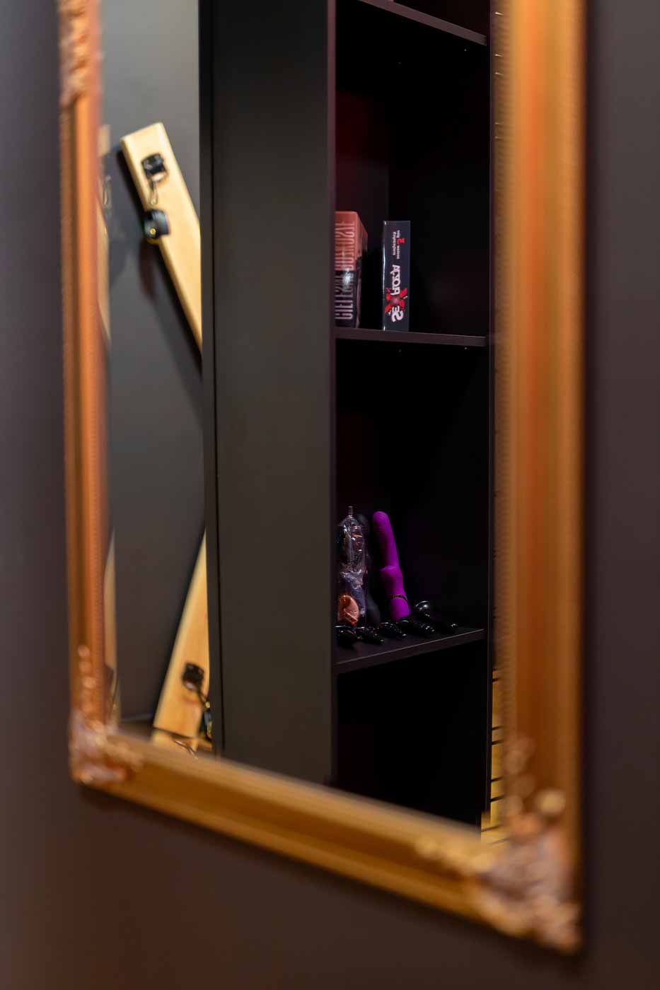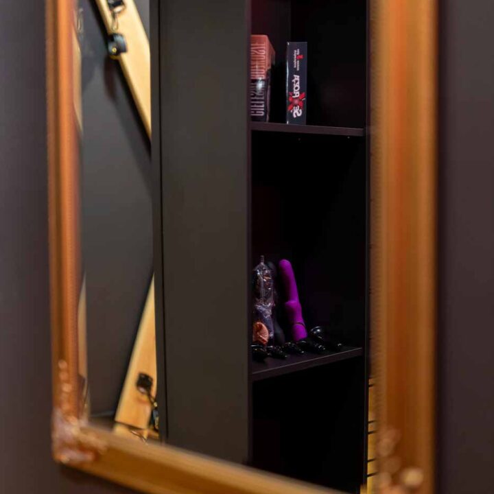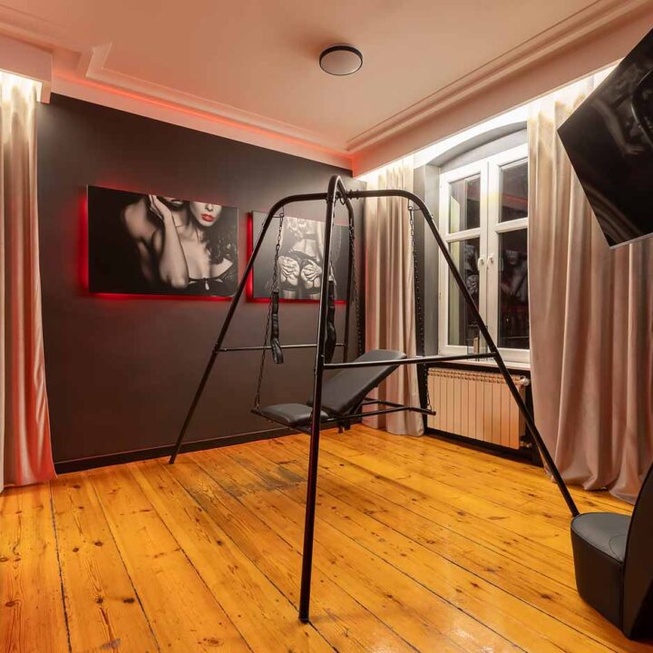W apartamencie działa także wydzielona, bardziej „ukryta” część w stylu Secret Room, która naturalnie podbija klimat MYSTERY. To rozwiązanie daje bardzo prostą korzyść: możesz mieć w jednym wynajmie dwa światy – otwartą część klubową i bardziej odseparowaną przestrzeń, która działa jak „kolejny poziom” wrażeń. Idealne, jeśli lubisz stopniowanie intensywności i przenoszenie zabawy w inne tło bez wychodzenia z apartamentu.