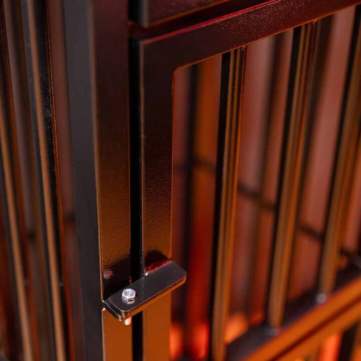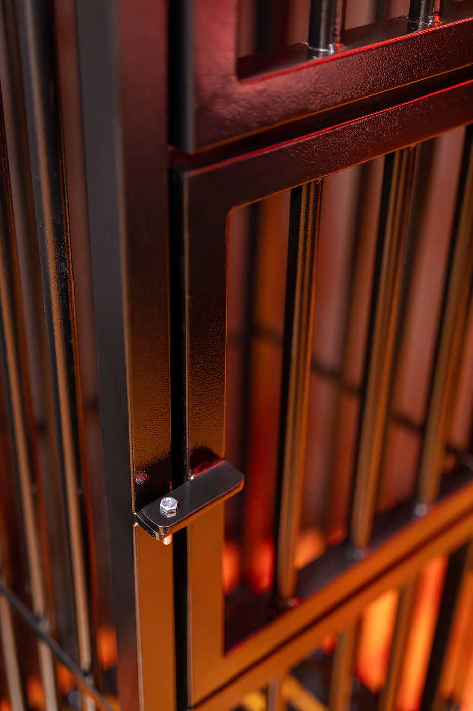 Centralnym punktem jest duże łóżko osadzone w mocnej, geometrycznej konstrukcji (styl „cage”), dzięki czemu ta strefa łączy wygodę noclegu z klubowym charakterem. W zależności od ustawienia światła przestrzeń potrafi być miękka i intymna albo wyraźnie „dungeonowa”. To świetna baza zarówno na spokojniejszy pobyt, jak i na bardziej zdecydowaną atmosferę, gdy chcesz, żeby wnętrze „zrobiło robotę” za Ciebie.