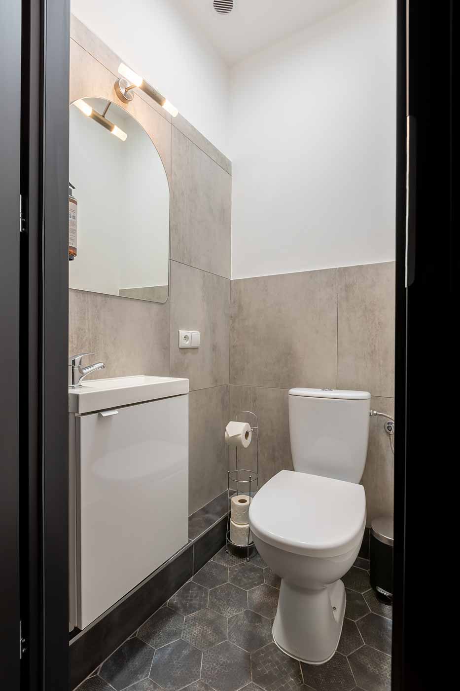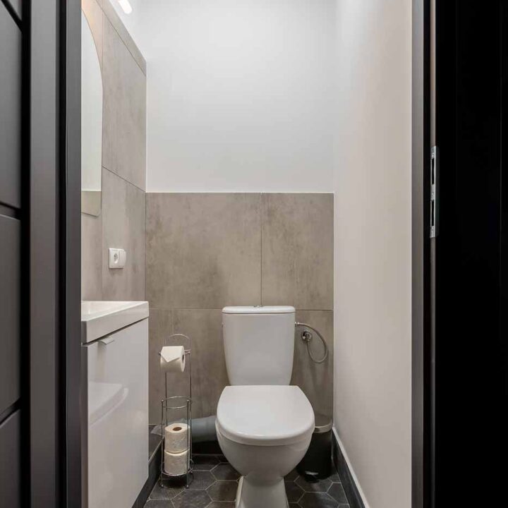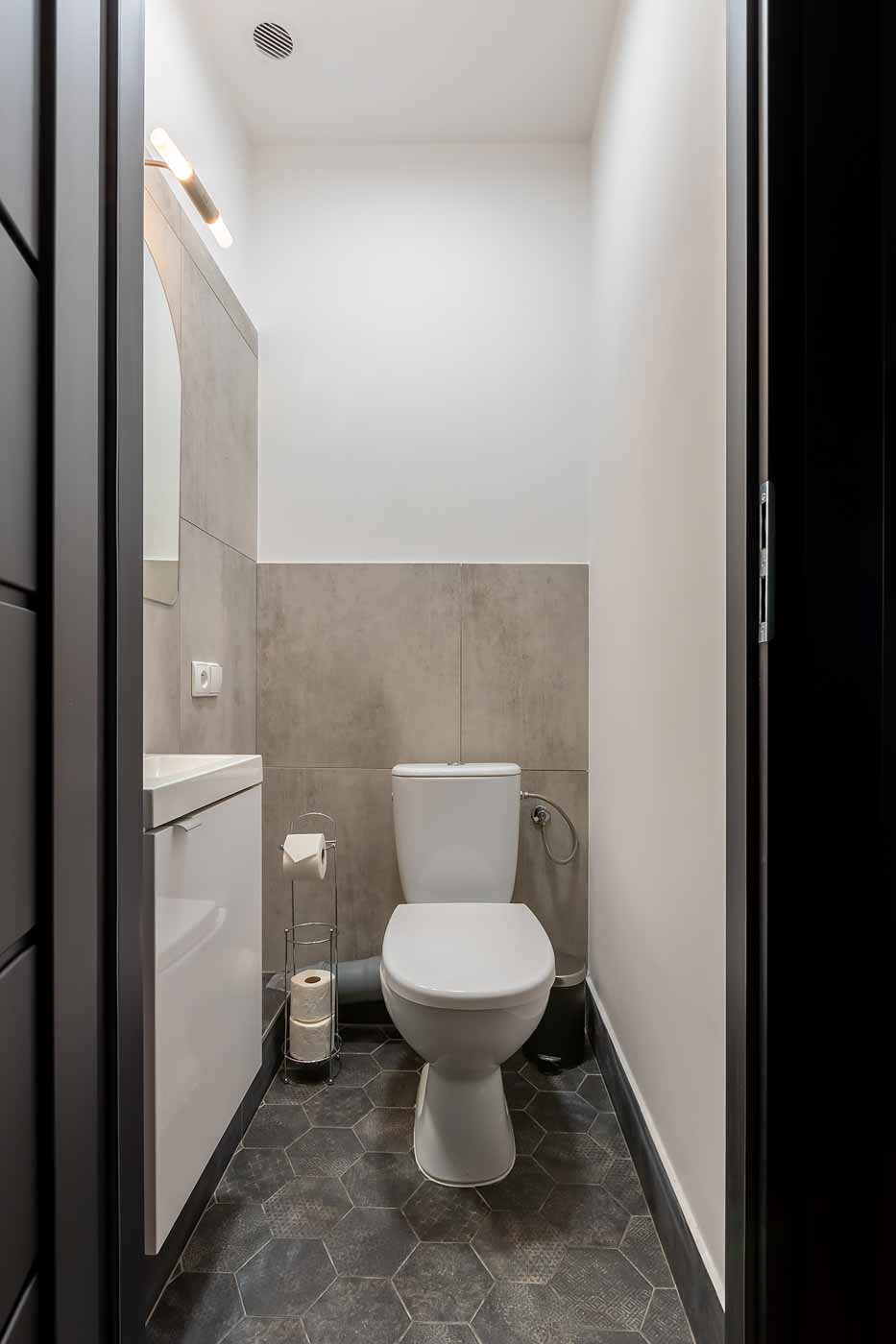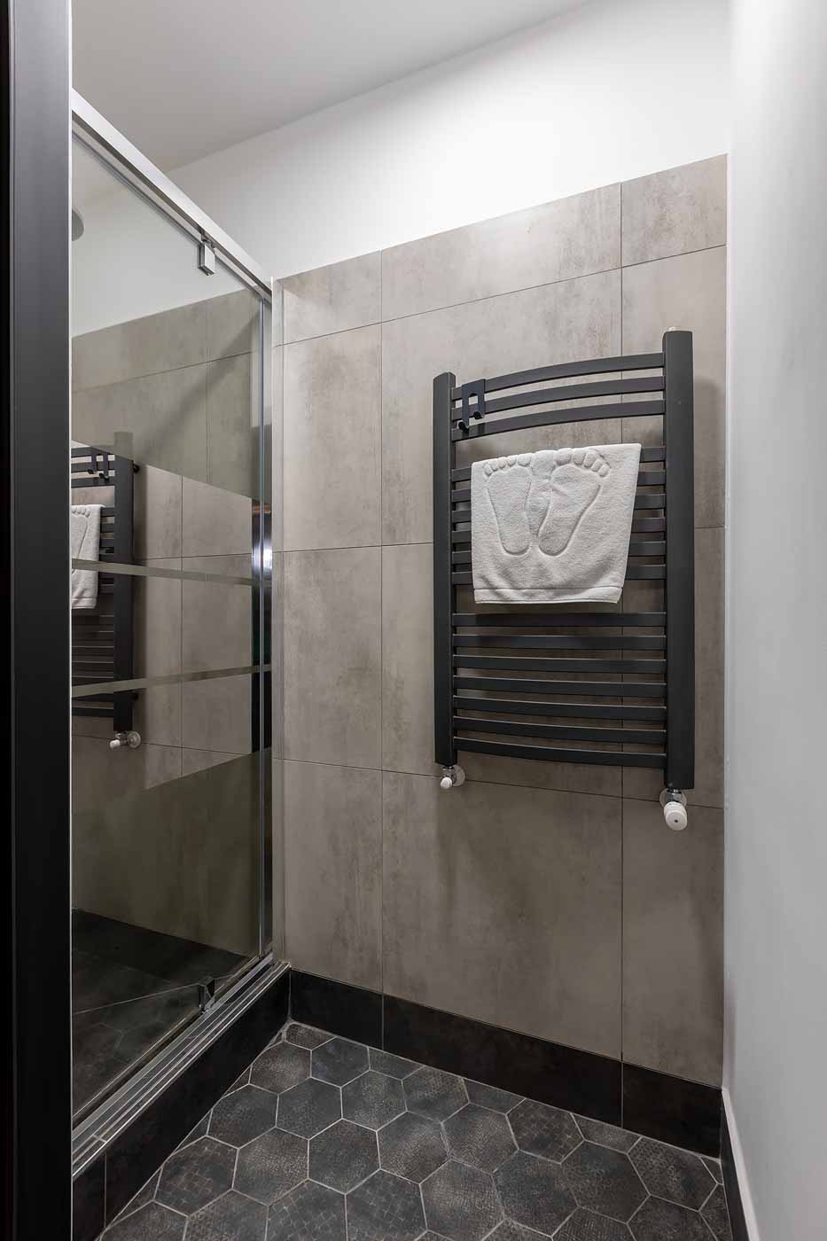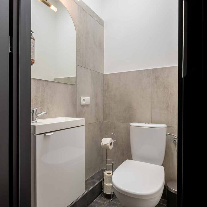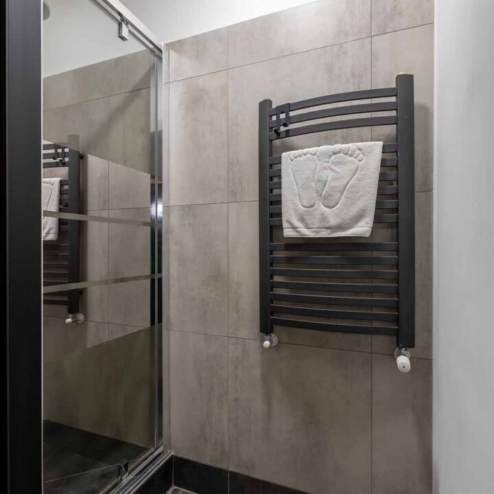 Łazienka jest utrzymana w neutralnym, nowoczesnym stylu – daje wygodę i szybkie odświeżenie, a jednocześnie nie konkuruje z charakterem apartamentu. To praktyczne domknięcie całości: standard, czystość i funkcjonalność, które w apartamencie tematycznym są równie ważne, jak klimat.