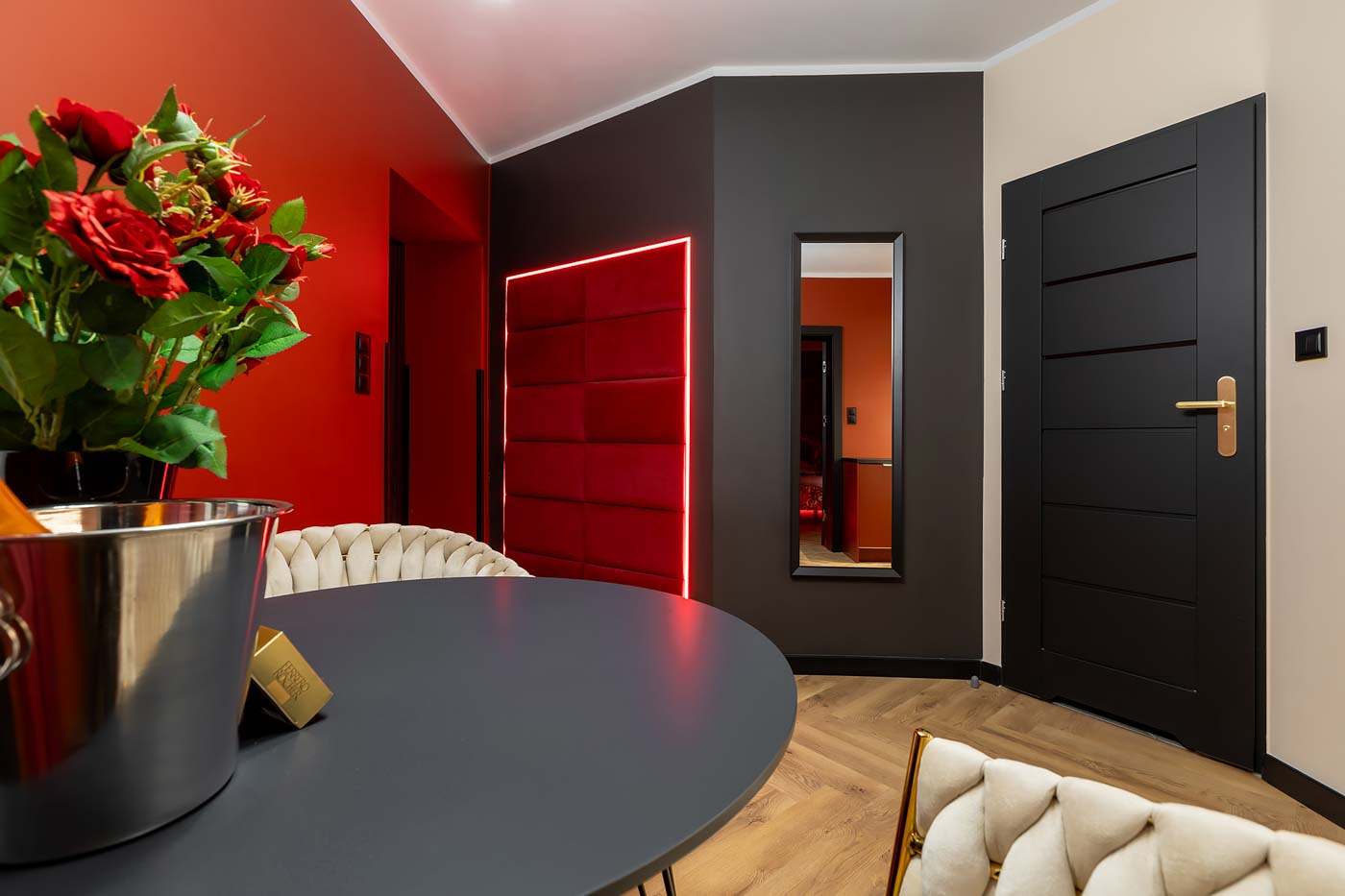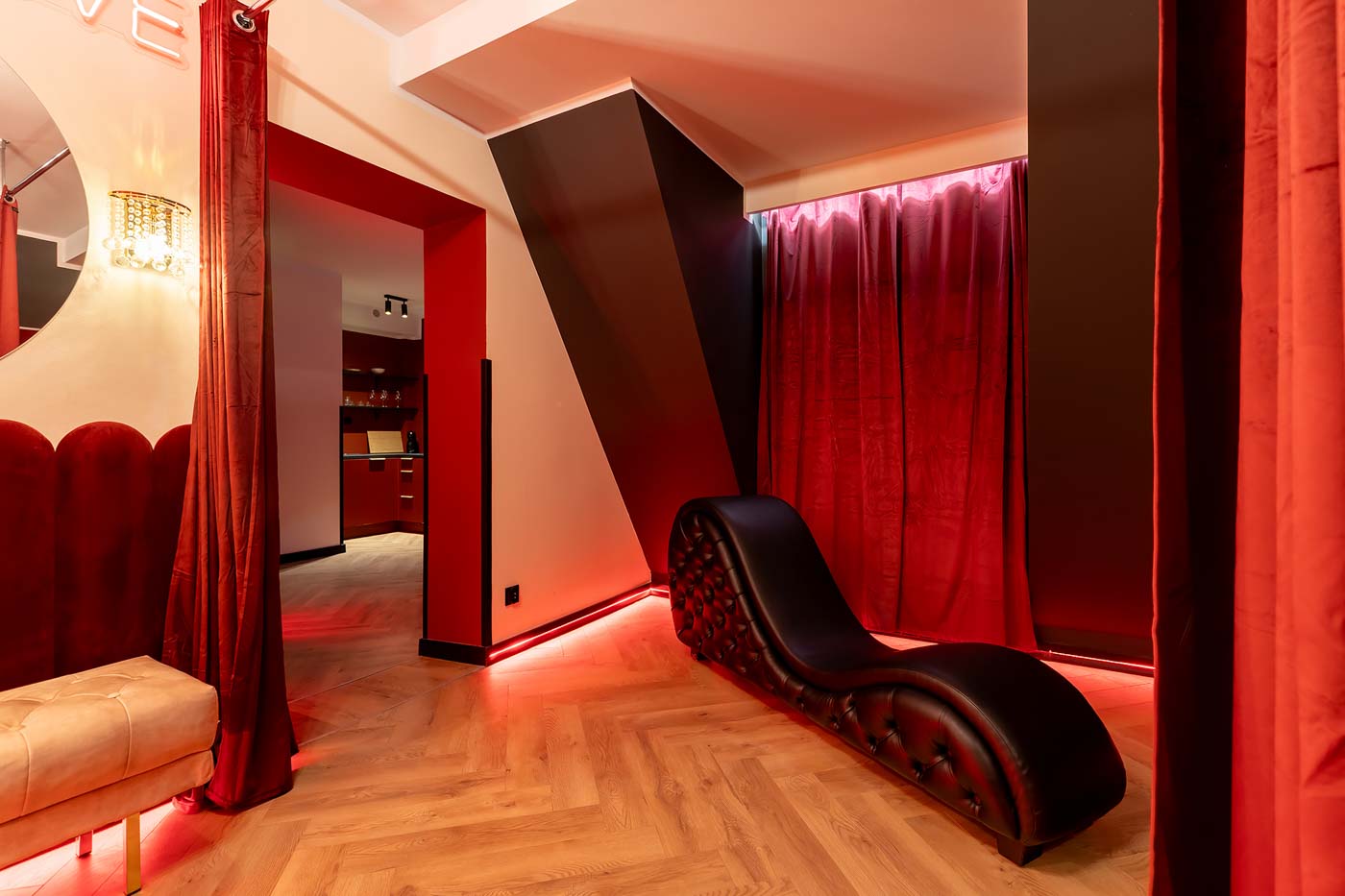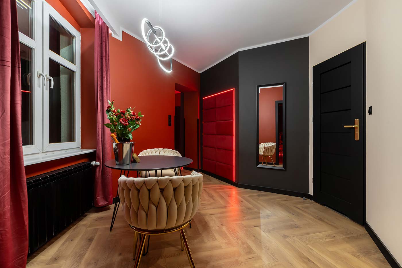 Od wejścia uwagę przyciąga czerwona kolorystyka i konsekwentnie budowany klimat „po godzinach”. Światło prowadzi po wnętrzu strefowo, dzięki czemu łatwo przejść z trybu codziennego na prywatny, bardziej zmysłowy. Ta część świetnie sprawdza się jako spokojny start: muzyka, toast i wejście w atmosferę bez pośpiechu.