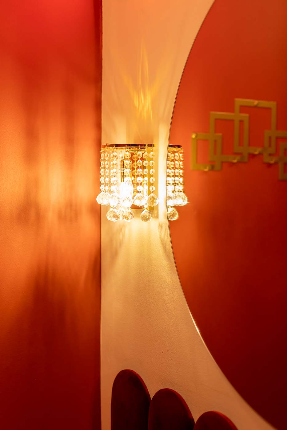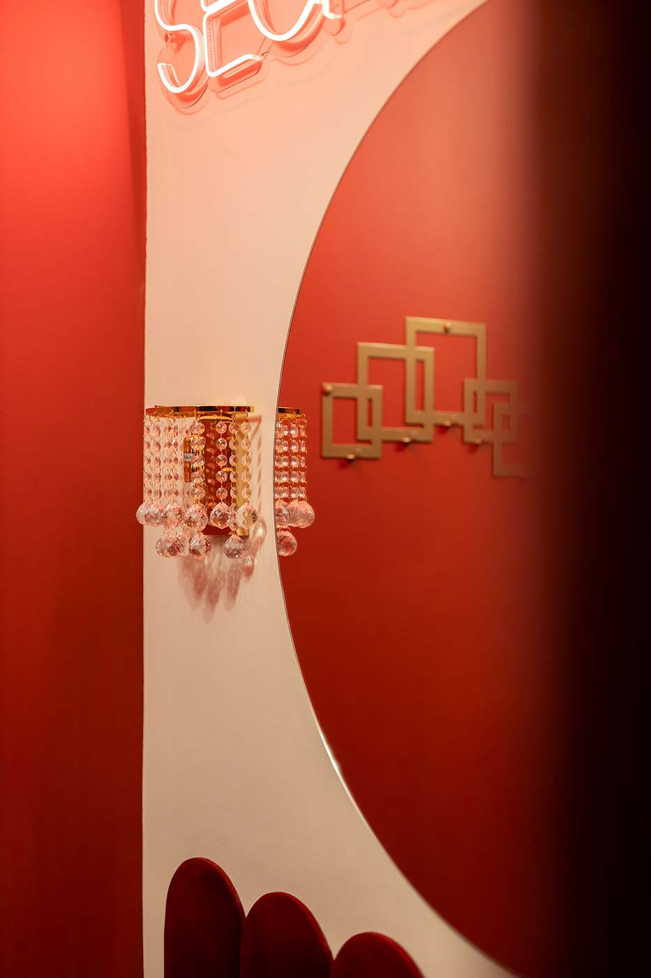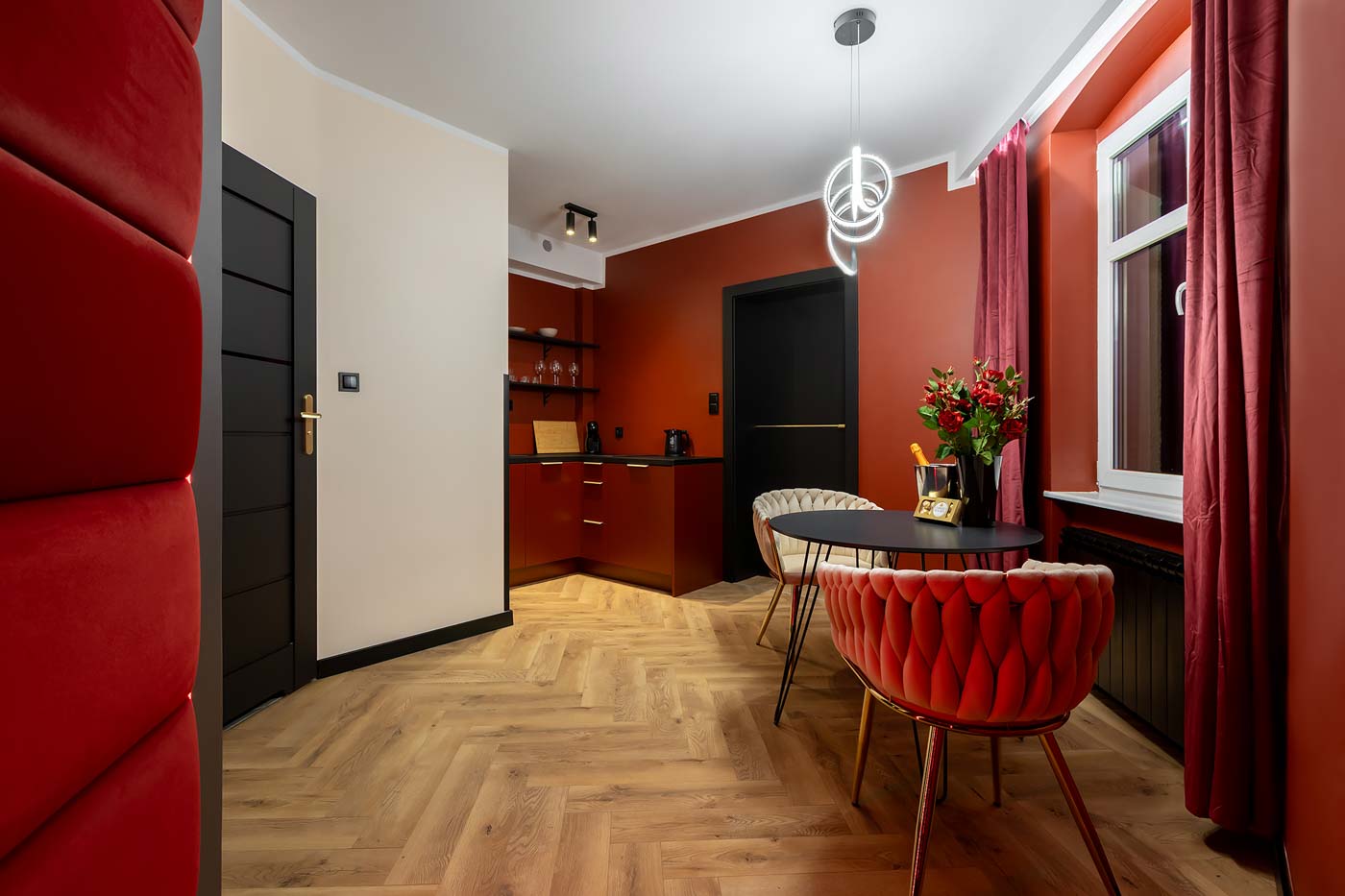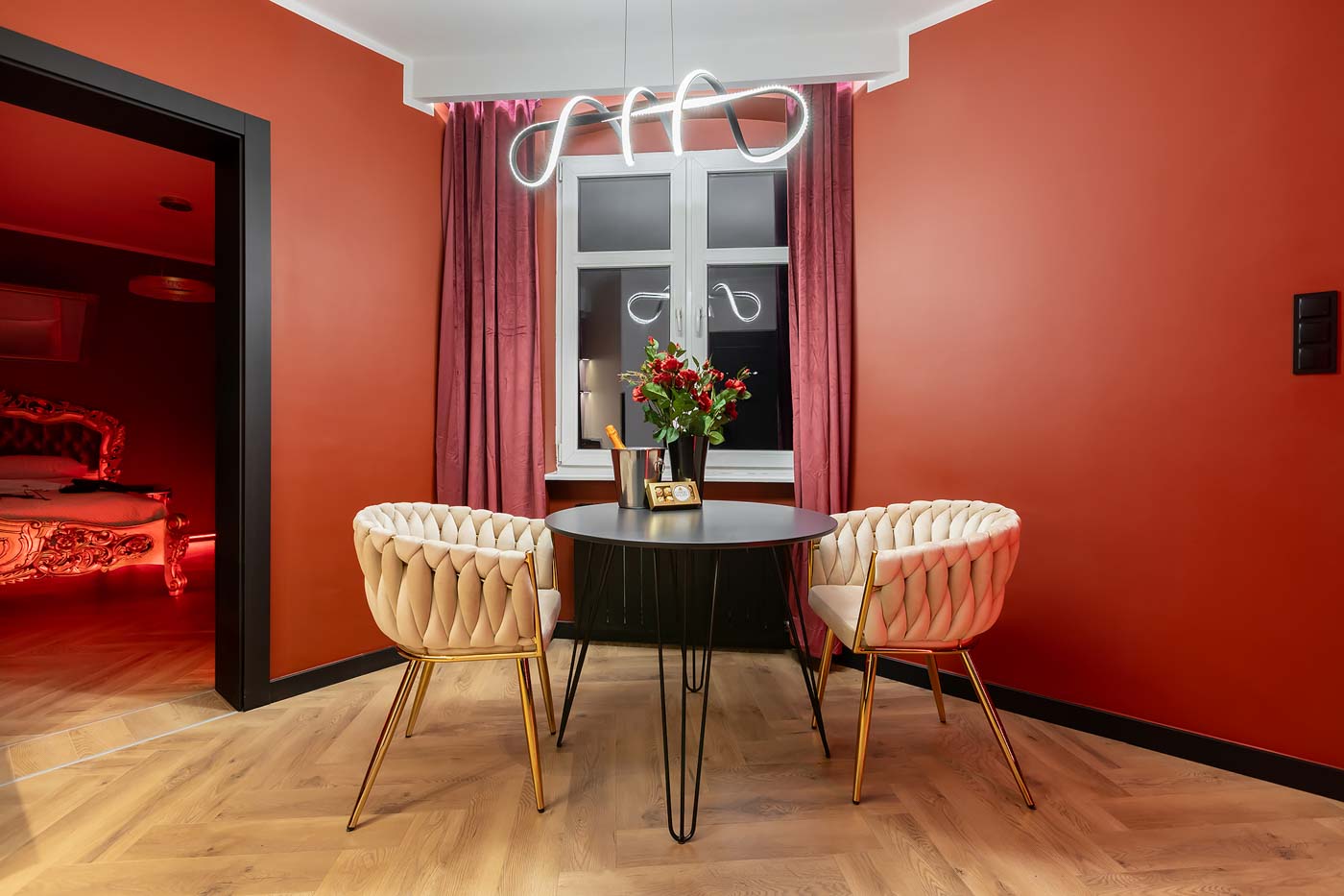 Od wejścia uwagę przyciąga czerwona kolorystyka i konsekwentnie budowany klimat „po godzinach”. Światło prowadzi po wnętrzu strefowo, dzięki czemu łatwo przejść z trybu codziennego na prywatny, bardziej zmysłowy. Ta część świetnie sprawdza się jako spokojny start: muzyka, toast i wejście w atmosferę bez pośpiechu.