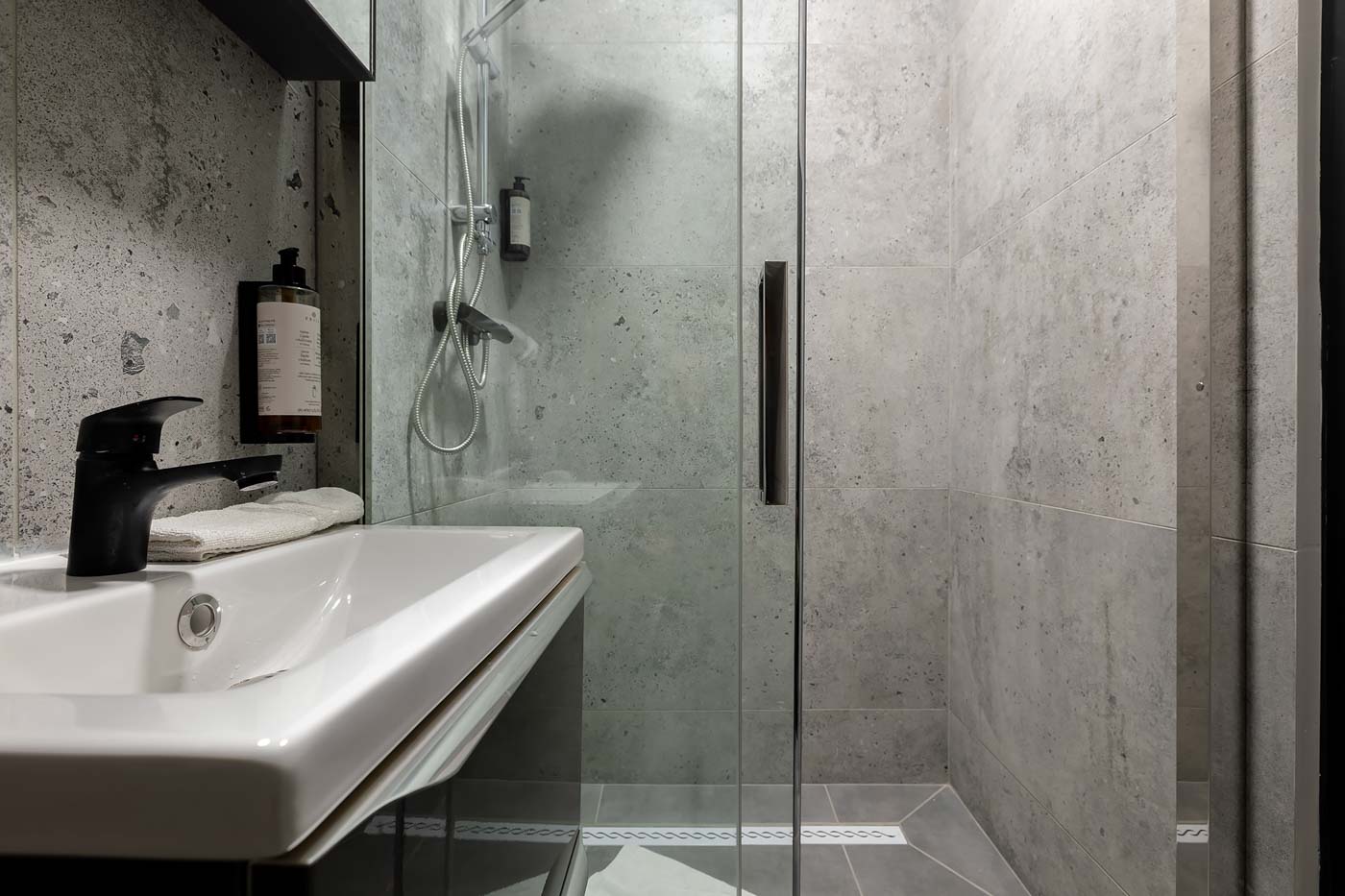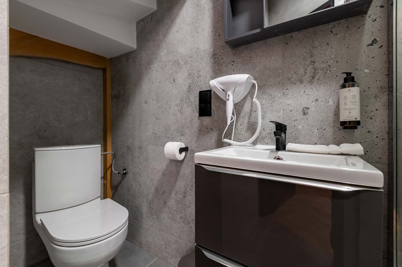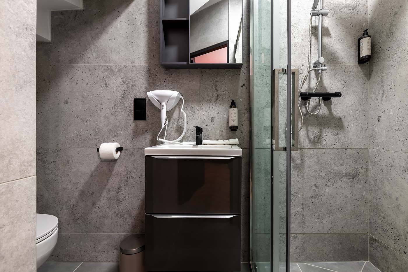 Łazienka jest utrzymana w neutralnym, nowoczesnym stylu, który nie konkuruje z czerwonym klimatem apartamentu, a zapewnia pełen komfort użytkowania. To praktyczne domknięcie pobytu: szybkie odświeżenie, wygoda i standard, którego oczekuje się od apartamentu premium.