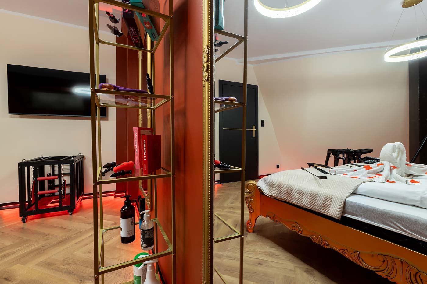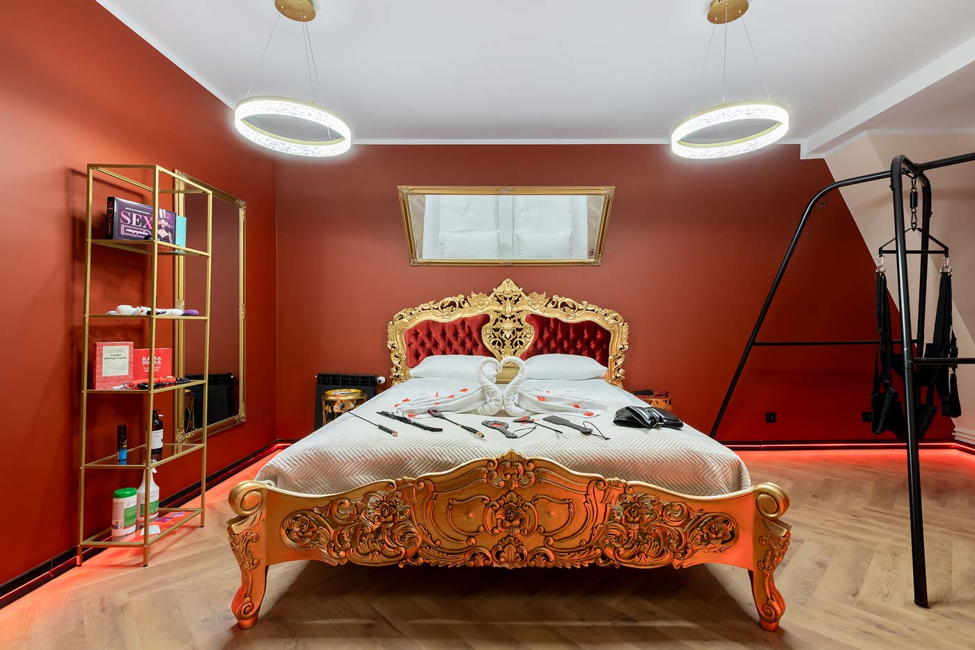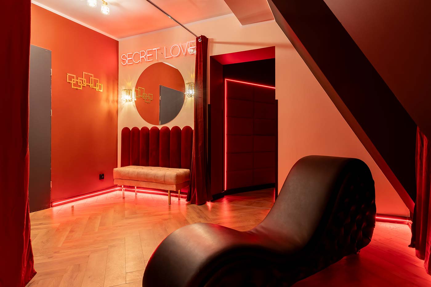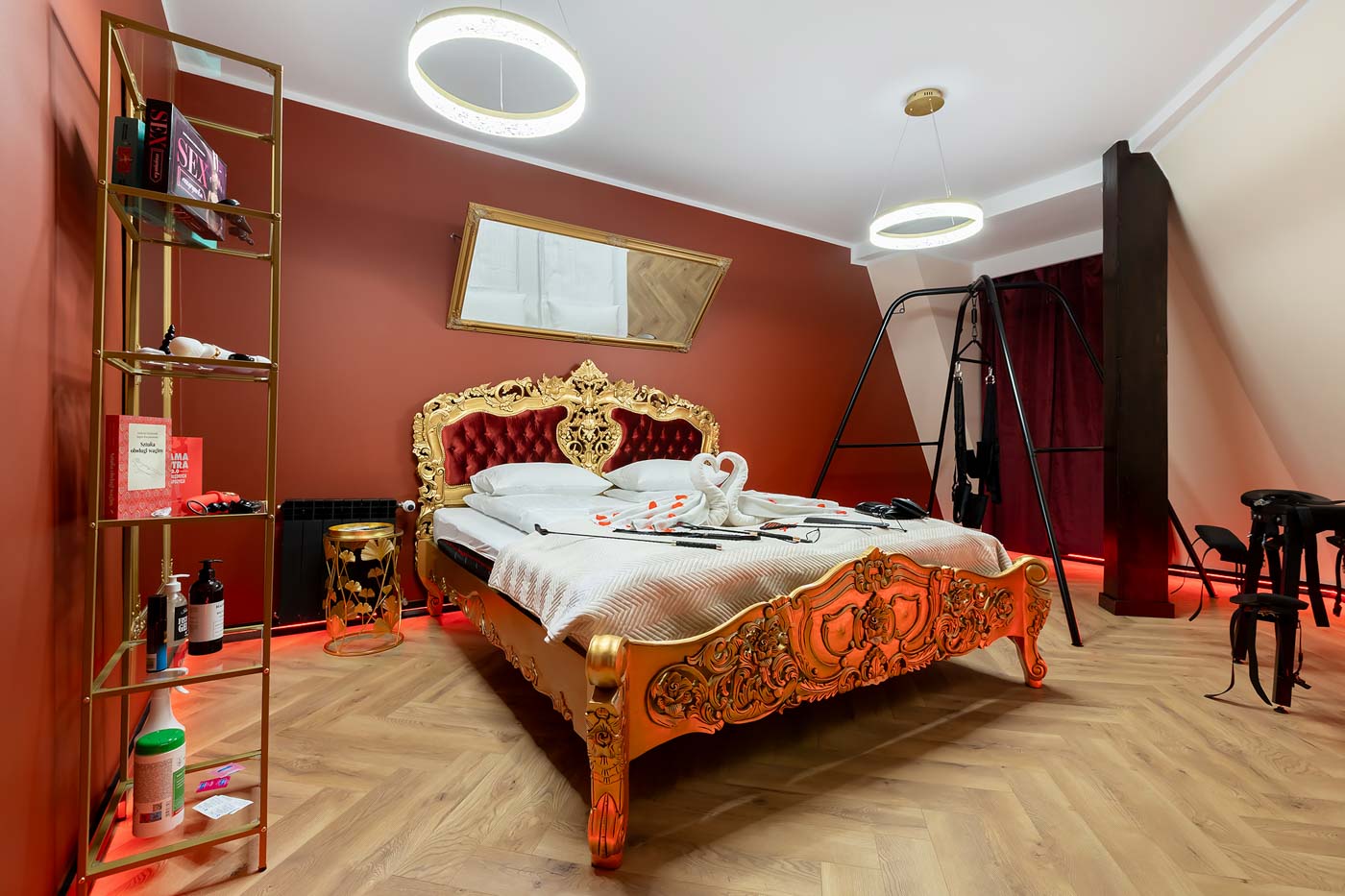 Secret Love Royal to apartament tematyczny w estetyce „royal & club”, gdzie intensywna czerwień, miękkie tkaniny i wyraziste światło tworzą wnętrze z charakterem. Klimat opiera się na połączeniu złotych akcentów, scenograficznego oświetlenia i wyraźnie wydzielonych stref: komfortowej części noclegowej oraz przestrzeni przygotowanej pod doświadczenia BDSM. To układ, który pozwala dopasować pobyt do nastroju — od spokojnego „premium” po bardziej odważny, klubowy wariant.