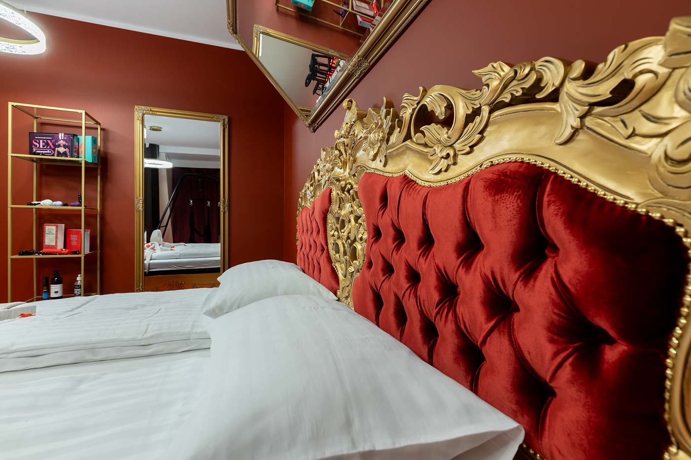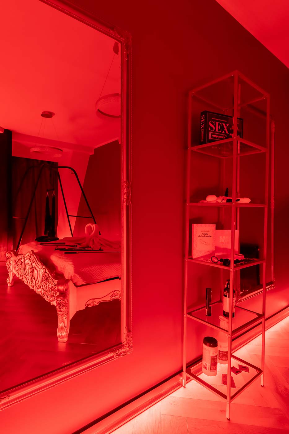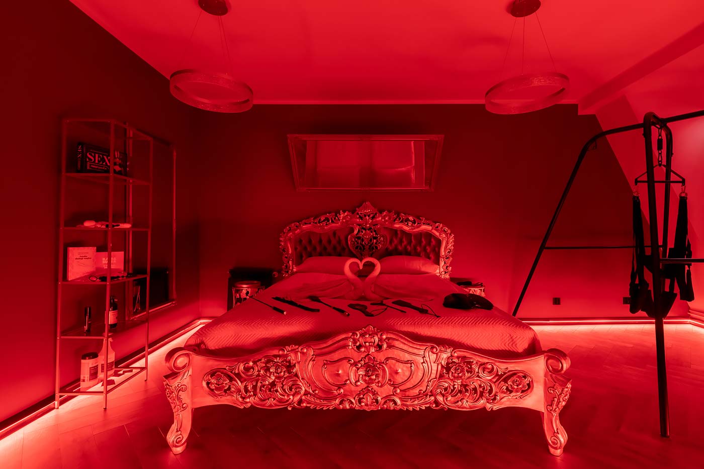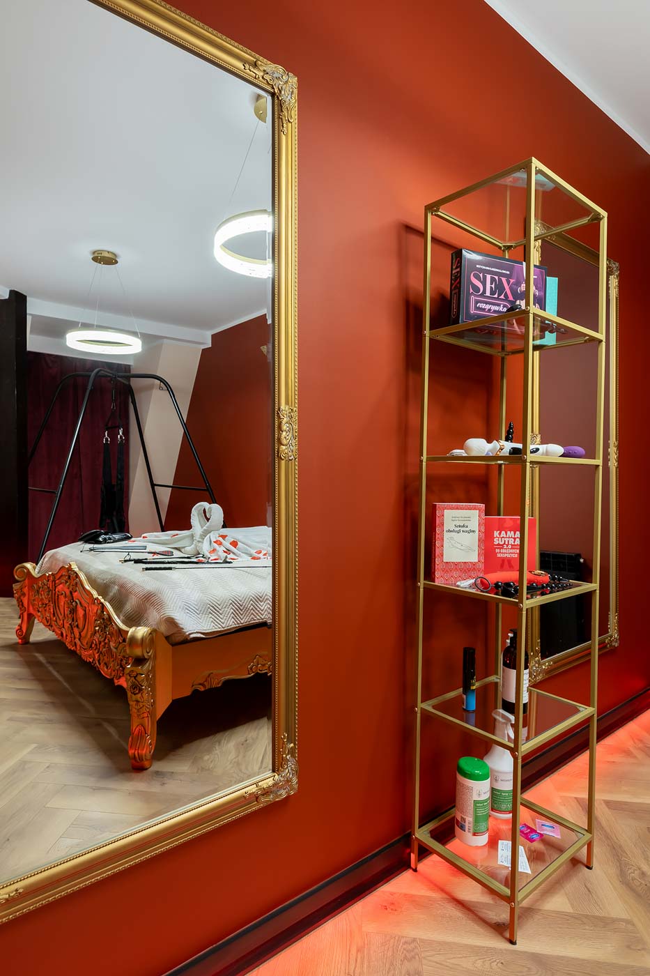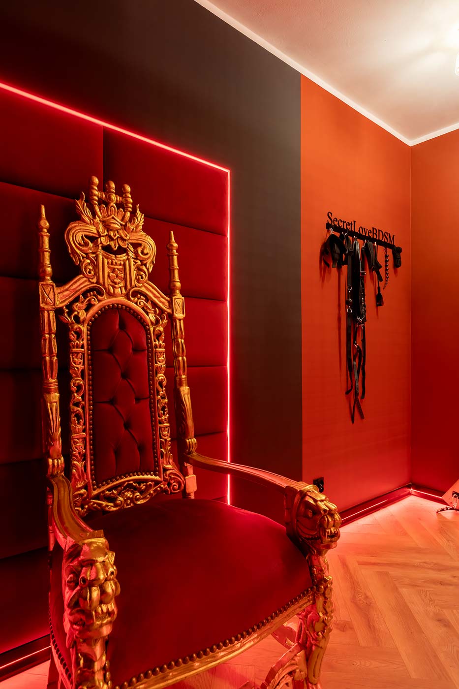 Secret Love Royal to apartament tematyczny w estetyce „royal & club”, gdzie intensywna czerwień, miękkie tkaniny i wyraziste światło tworzą wnętrze z charakterem. Klimat opiera się na połączeniu złotych akcentów, scenograficznego oświetlenia i wyraźnie wydzielonych stref: komfortowej części noclegowej oraz przestrzeni przygotowanej pod doświadczenia BDSM. To układ, który pozwala dopasować pobyt do nastroju — od spokojnego „premium” po bardziej odważny, klubowy wariant.