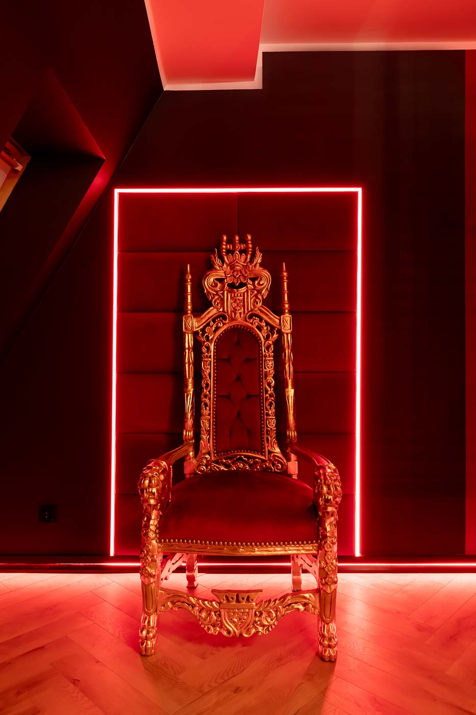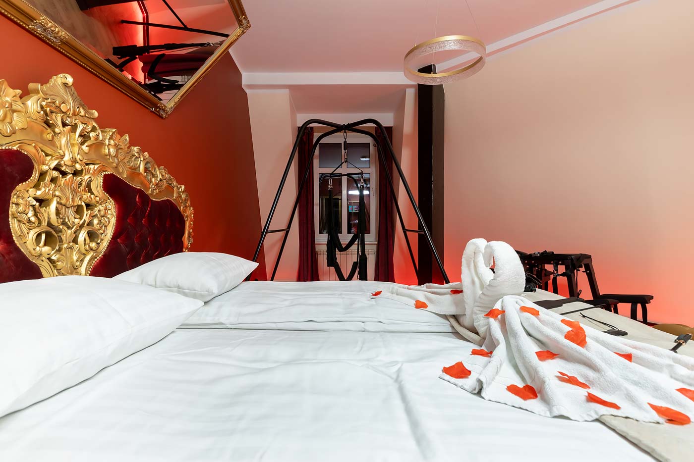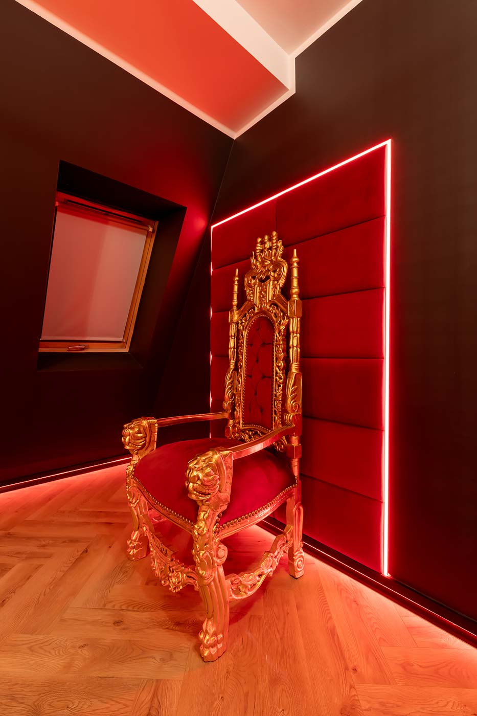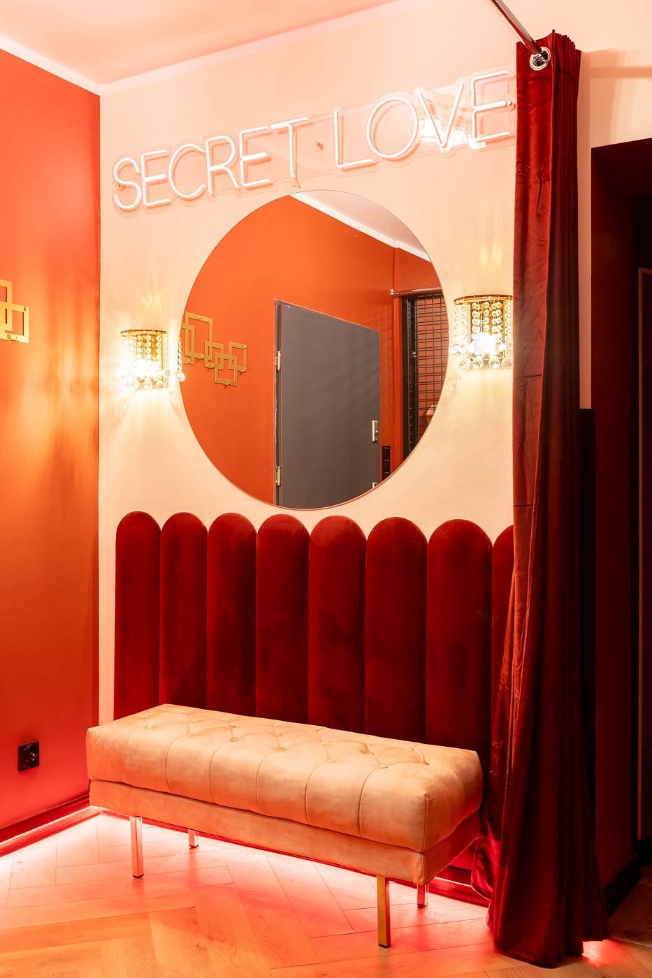 Secret Love Royal to apartament tematyczny w estetyce „royal & club”, gdzie intensywna czerwień, miękkie tkaniny i wyraziste światło tworzą wnętrze z charakterem. Klimat opiera się na połączeniu złotych akcentów, scenograficznego oświetlenia i wyraźnie wydzielonych stref: komfortowej części noclegowej oraz przestrzeni przygotowanej pod doświadczenia BDSM. To układ, który pozwala dopasować pobyt do nastroju — od spokojnego „premium” po bardziej odważny, klubowy wariant.