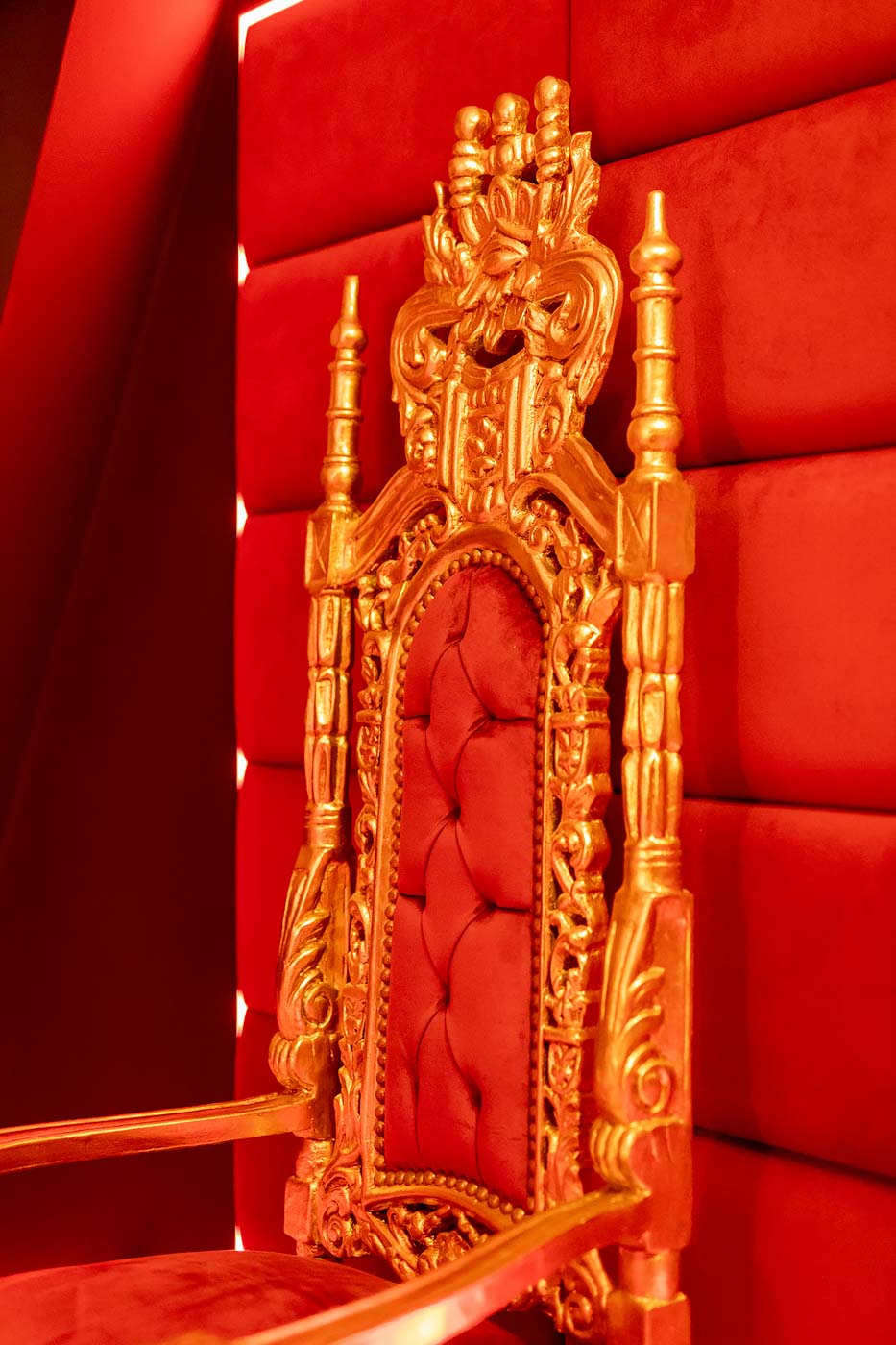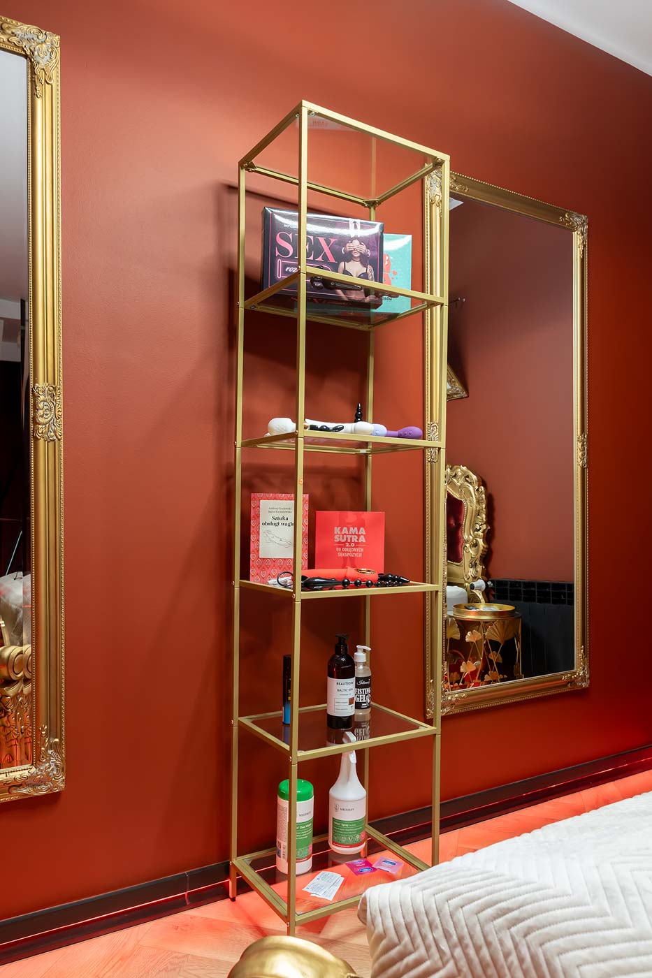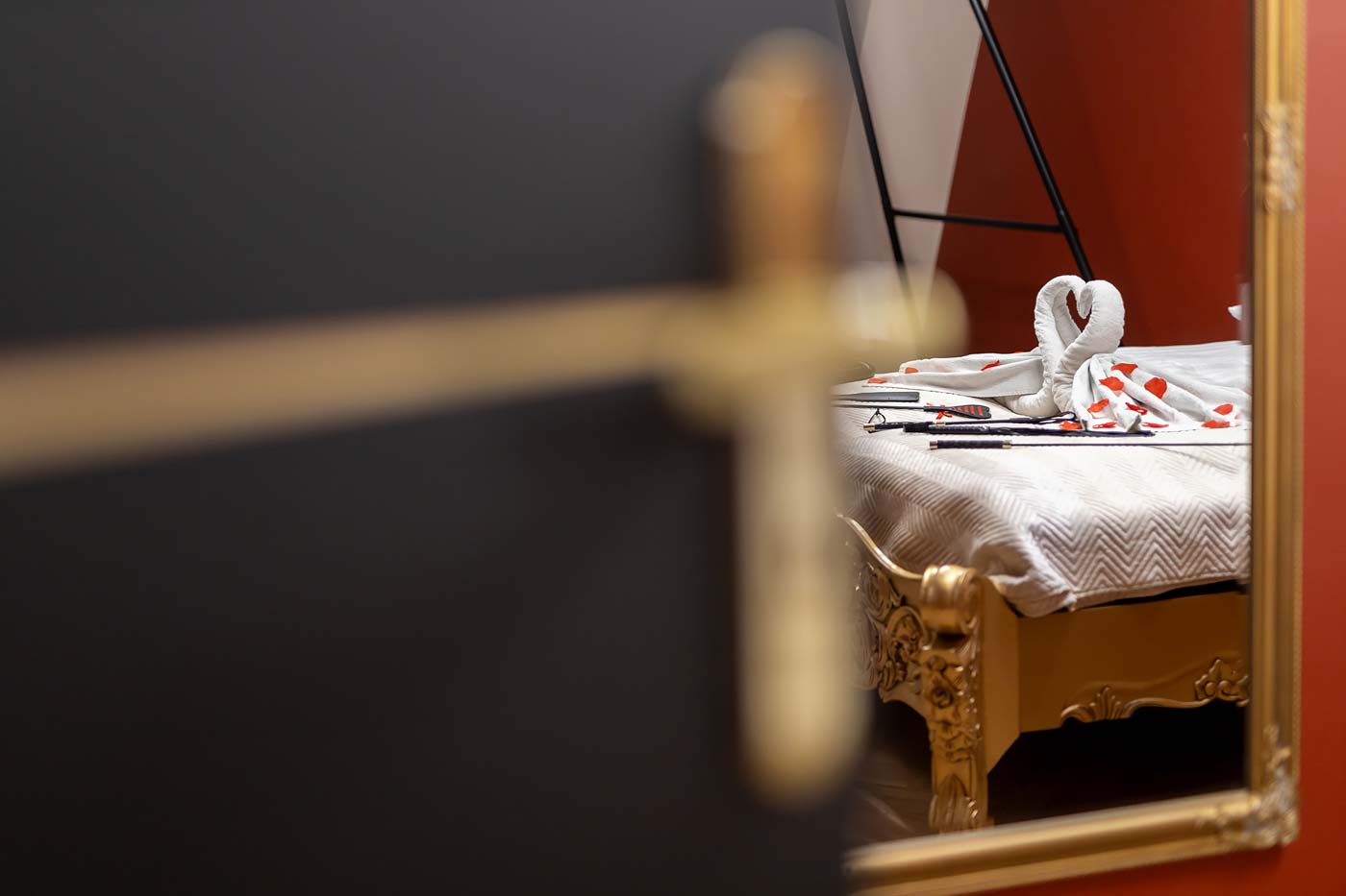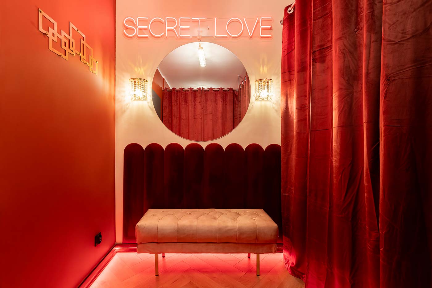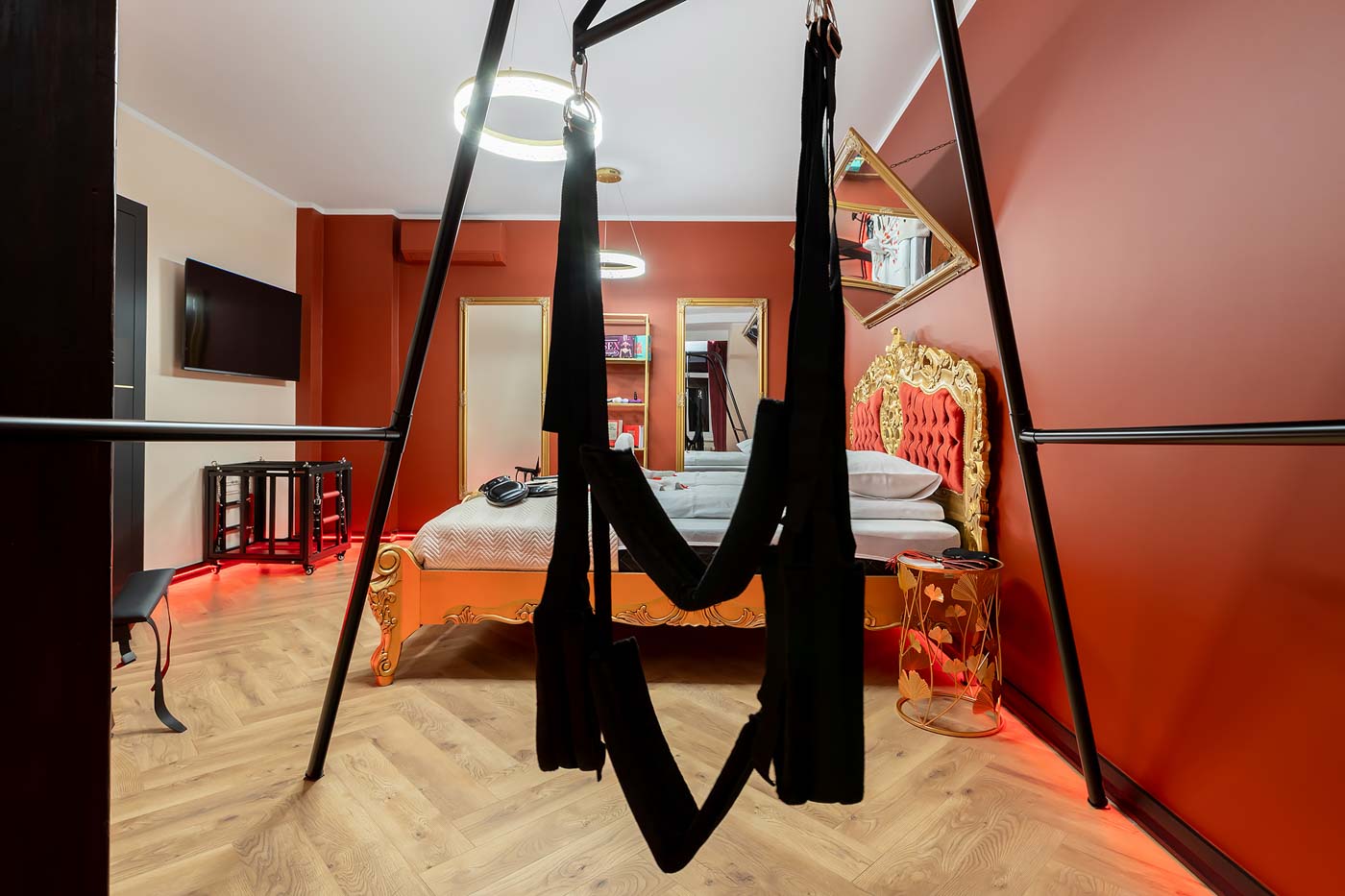 Secret Love Royal to apartament tematyczny w estetyce „royal & club”, gdzie intensywna czerwień, miękkie tkaniny i wyraziste światło tworzą wnętrze z charakterem. Klimat opiera się na połączeniu złotych akcentów, scenograficznego oświetlenia i wyraźnie wydzielonych stref: komfortowej części noclegowej oraz przestrzeni przygotowanej pod doświadczenia BDSM. To układ, który pozwala dopasować pobyt do nastroju — od spokojnego „premium” po bardziej odważny, klubowy wariant.