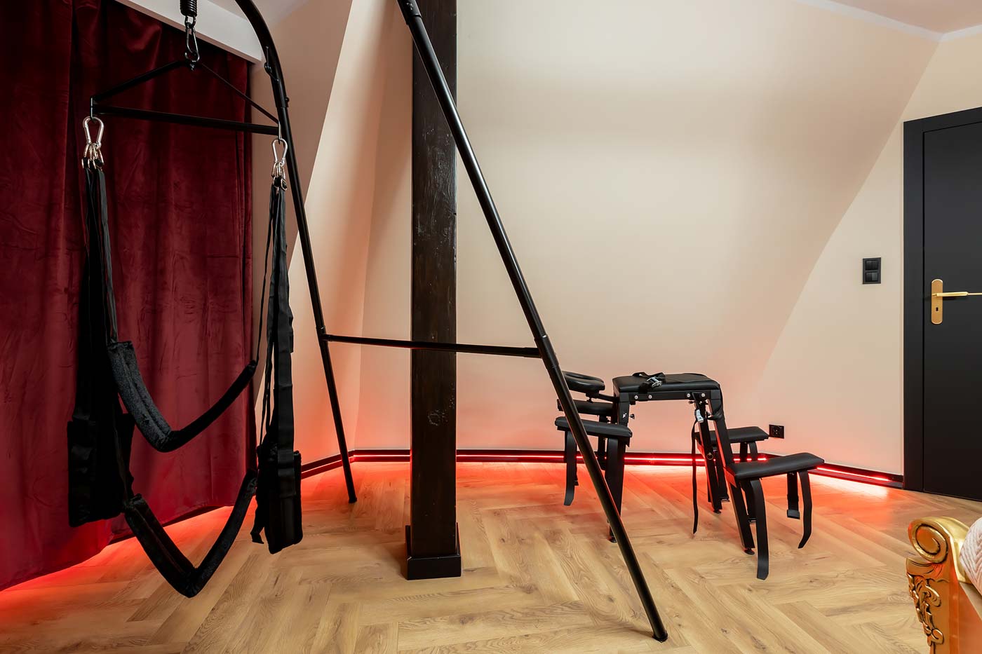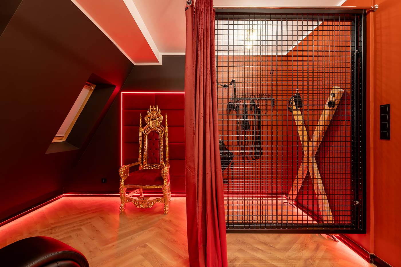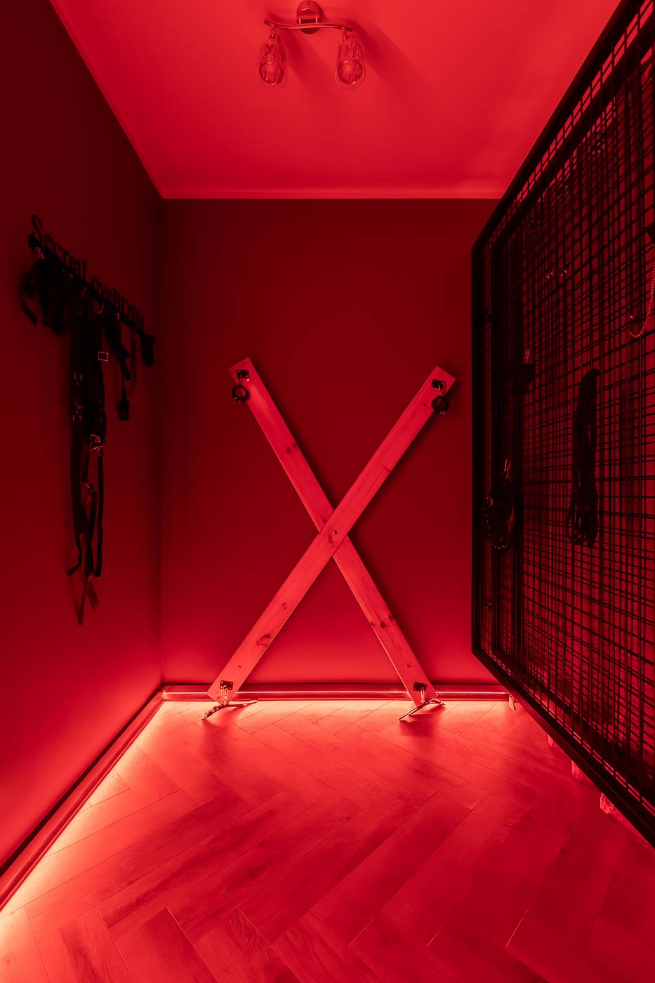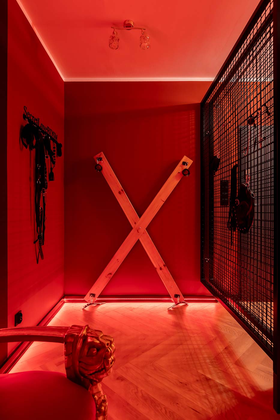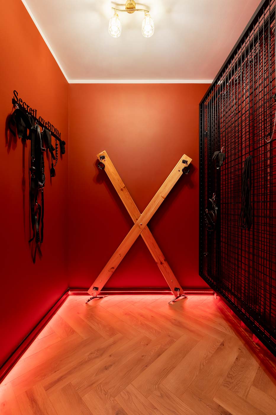 Wydzielona strefa BDSM w Secret Love Royal została zaprojektowana tak, aby dawać realne możliwości, a nie tylko klimat. Znajdziesz tu elementy w estetyce dungeon/club, które pozwalają budować różne warianty gry ról — od subtelnych po bardziej zdecydowane. To przestrzeń, w której scenografia i światło „robią robotę”, dzięki czemu nie trzeba nic aranżować: wystarczy wybrać tempo i granice, a wnętrze naturalnie wspiera klimat.