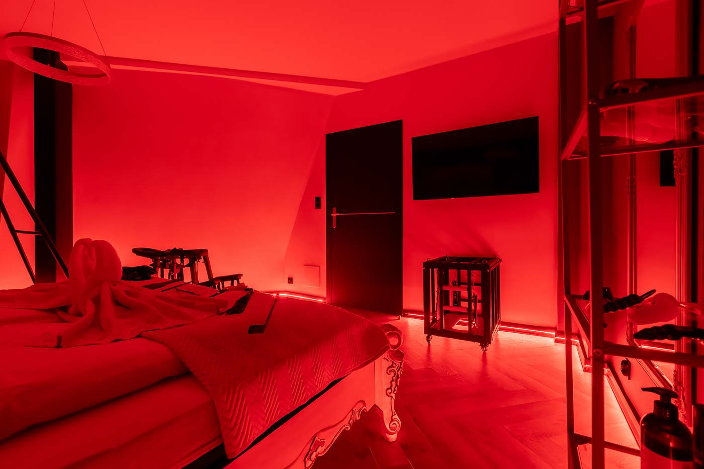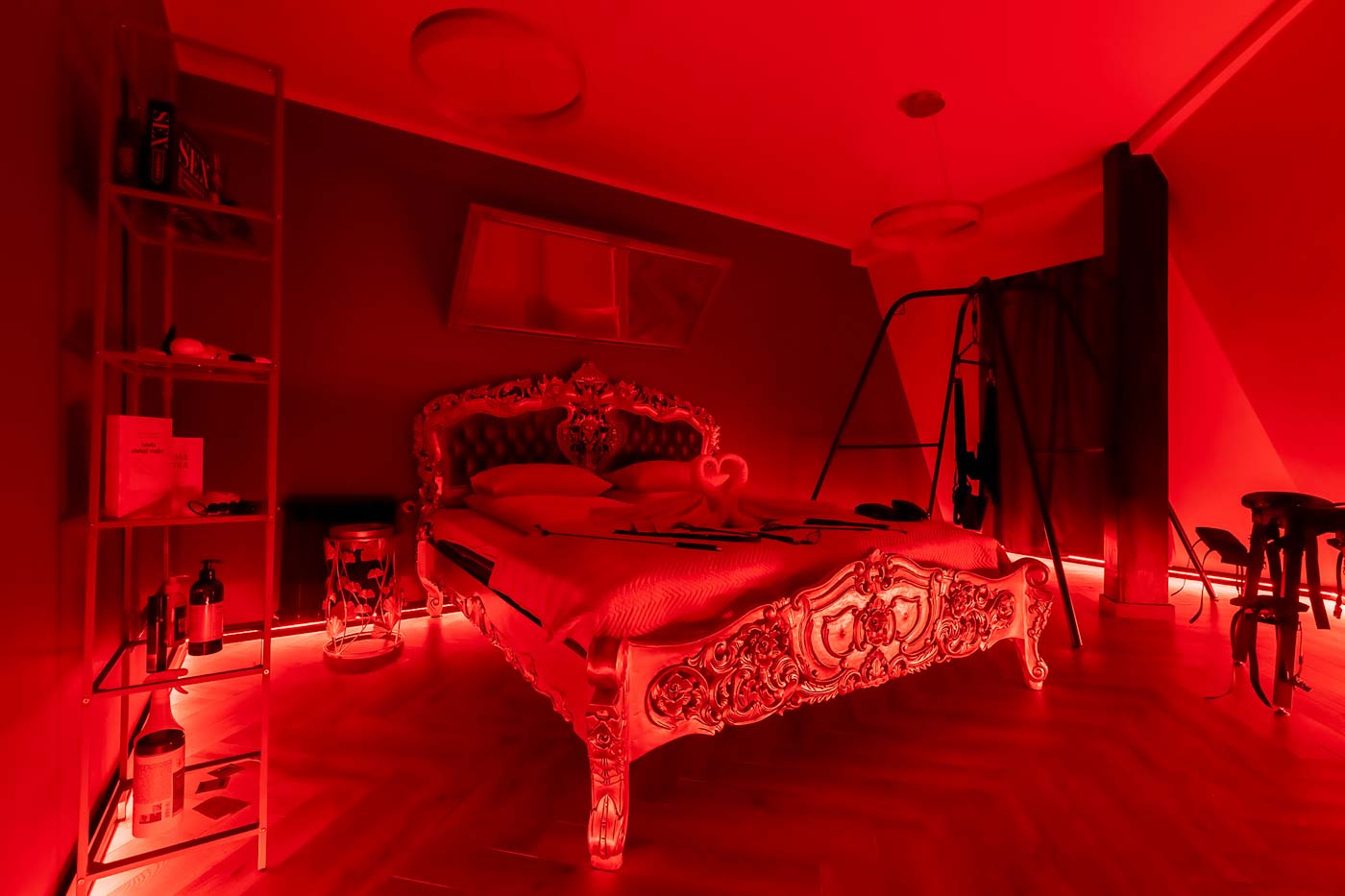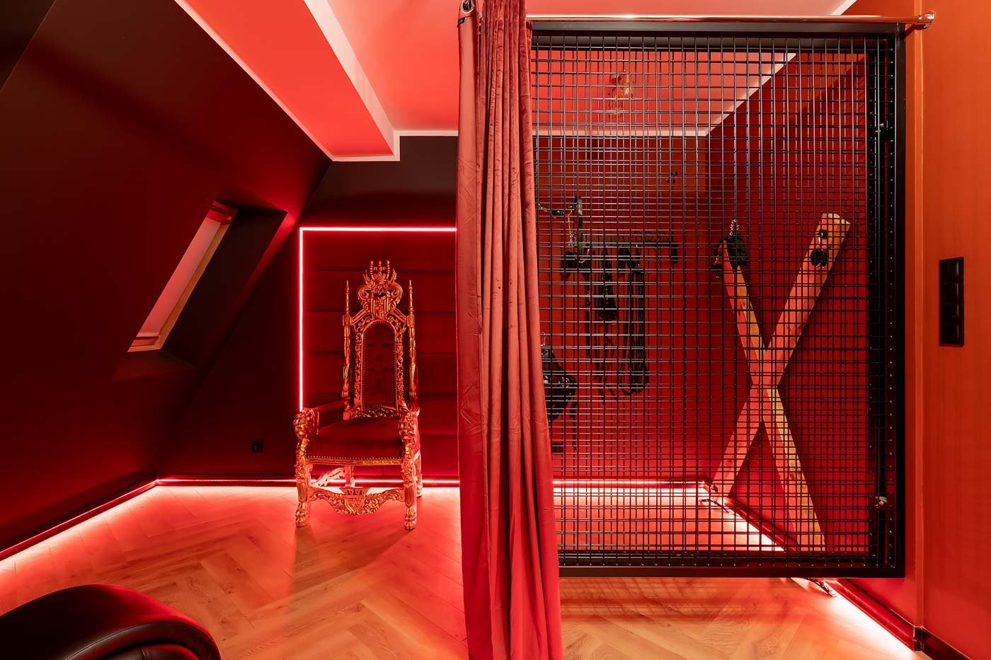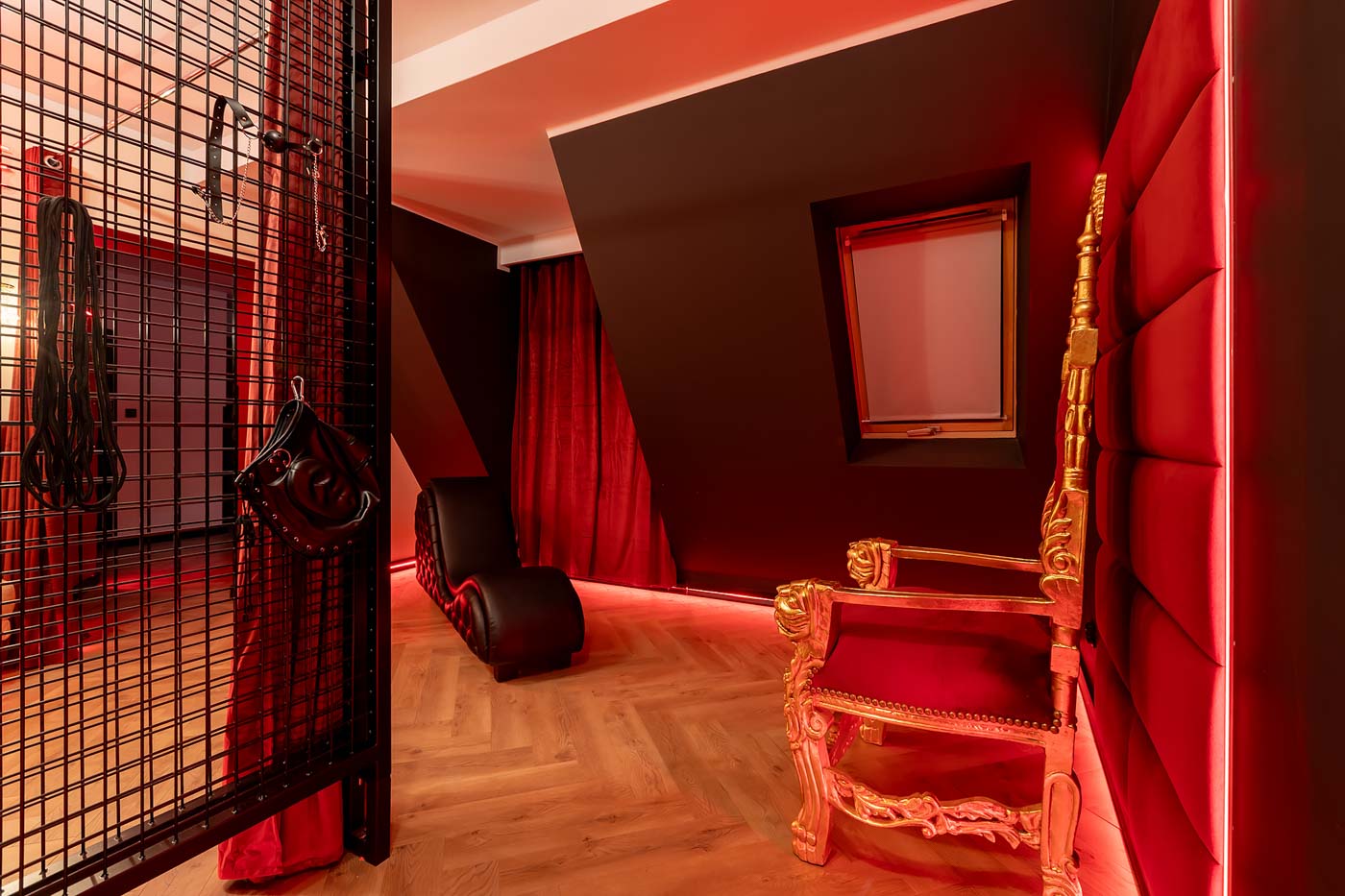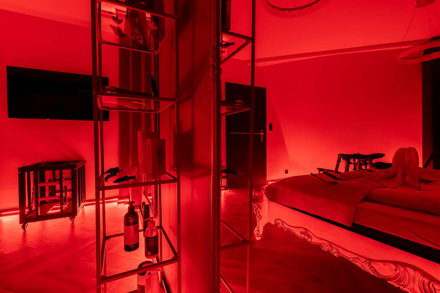 Wydzielona strefa BDSM w Secret Love Royal została zaprojektowana tak, aby dawać realne możliwości, a nie tylko klimat. Znajdziesz tu elementy w estetyce dungeon/club, które pozwalają budować różne warianty gry ról — od subtelnych po bardziej zdecydowane. To przestrzeń, w której scenografia i światło „robią robotę”, dzięki czemu nie trzeba nic aranżować: wystarczy wybrać tempo i granice, a wnętrze naturalnie wspiera klimat.