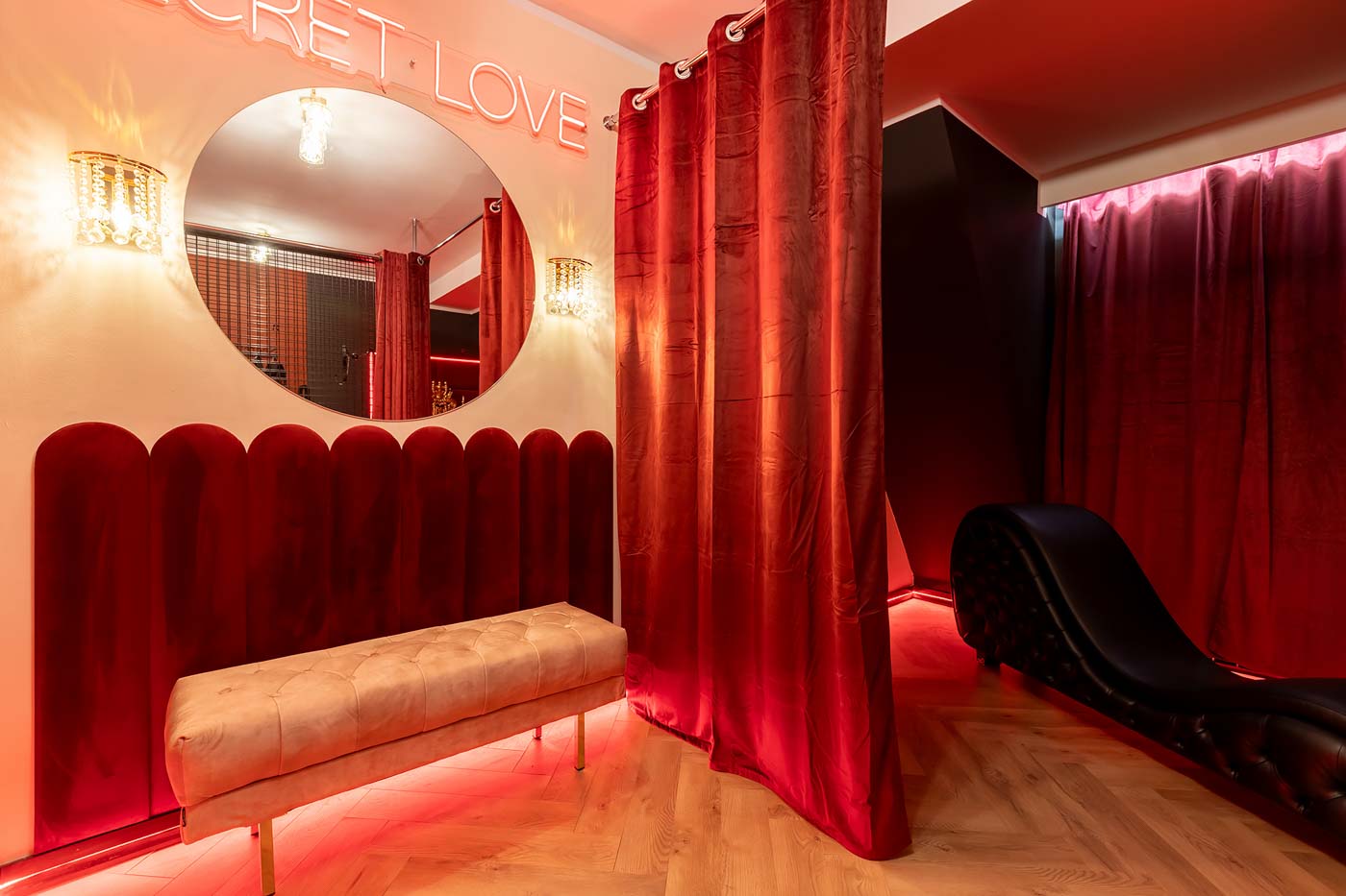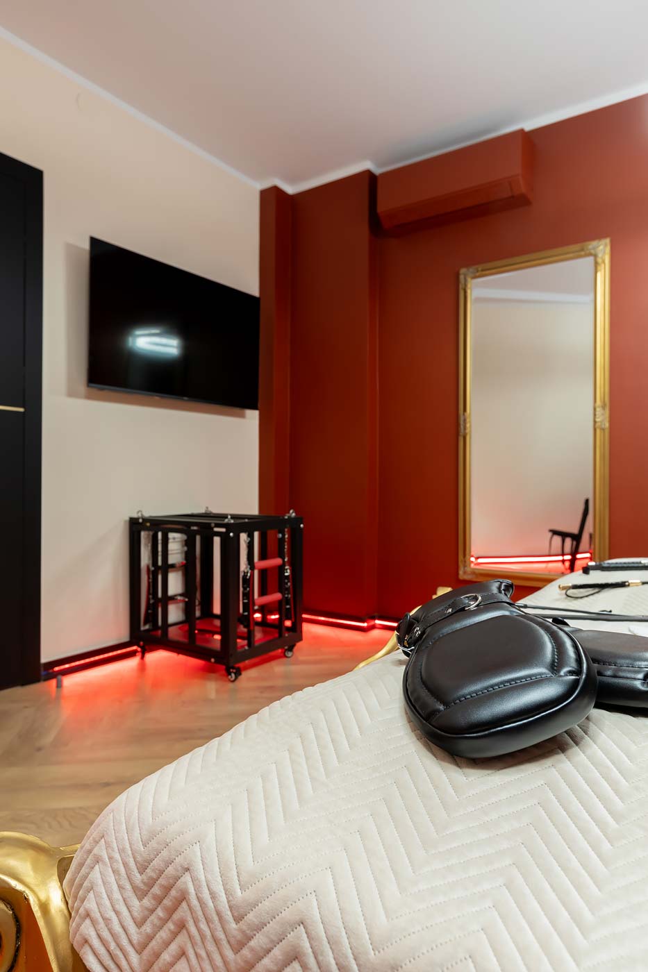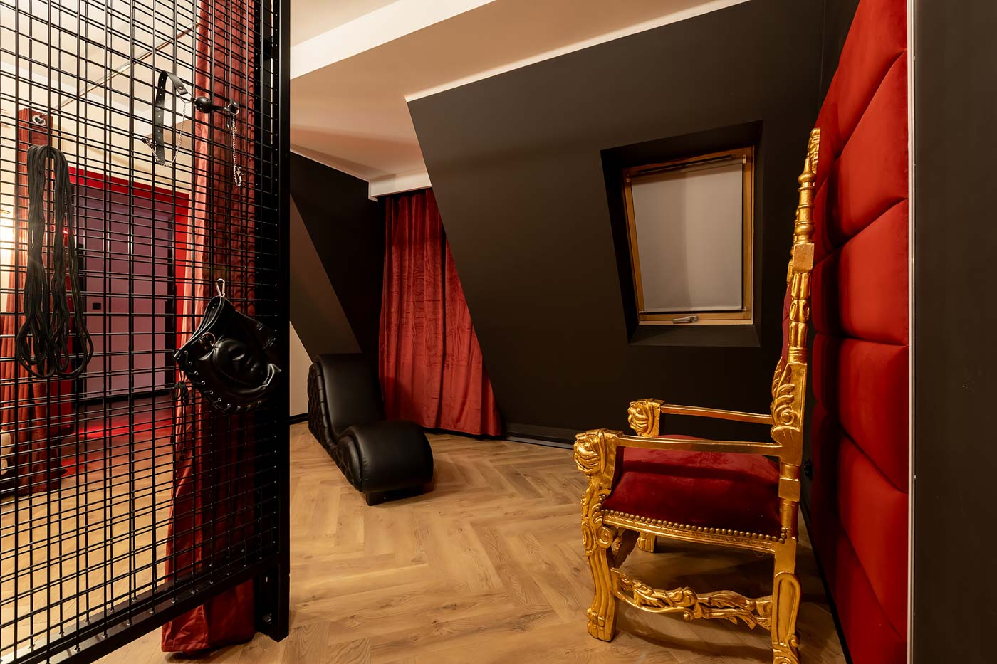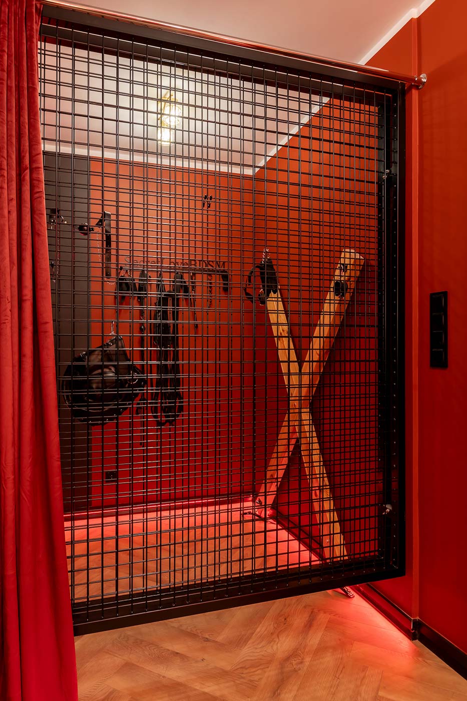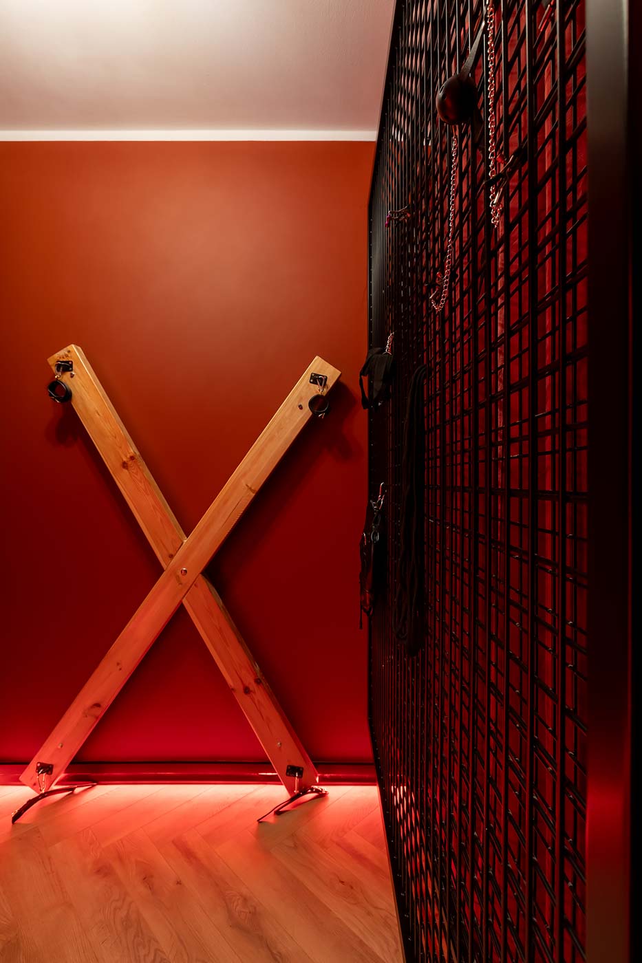 Wydzielona strefa BDSM w Secret Love Royal została zaprojektowana tak, aby dawać realne możliwości, a nie tylko klimat. Znajdziesz tu elementy w estetyce dungeon/club, które pozwalają budować różne warianty gry ról — od subtelnych po bardziej zdecydowane. To przestrzeń, w której scenografia i światło „robią robotę”, dzięki czemu nie trzeba nic aranżować: wystarczy wybrać tempo i granice, a wnętrze naturalnie wspiera klimat.