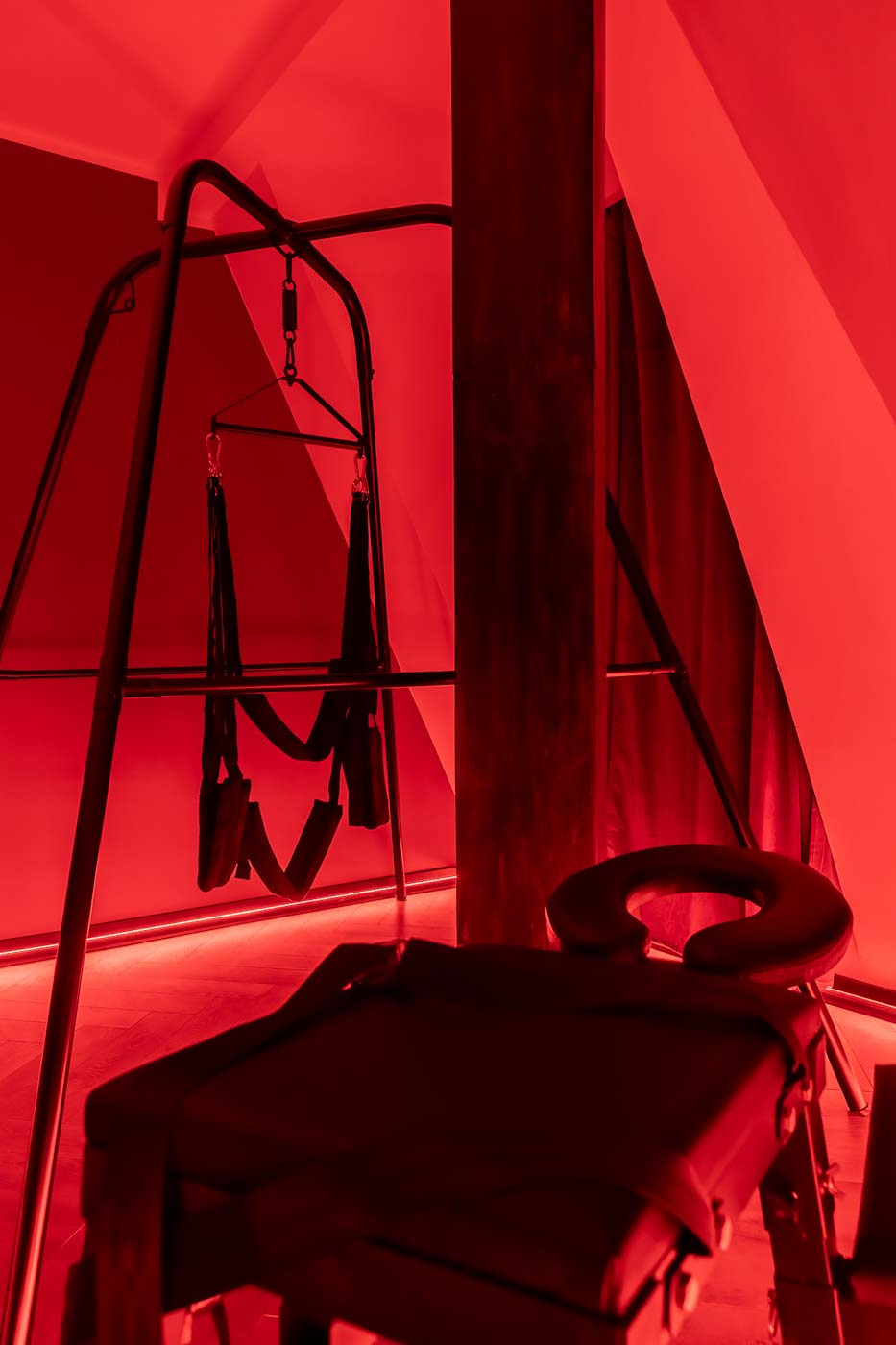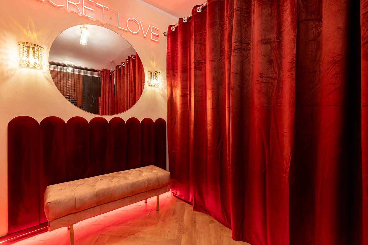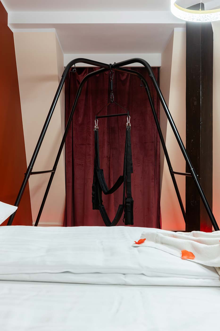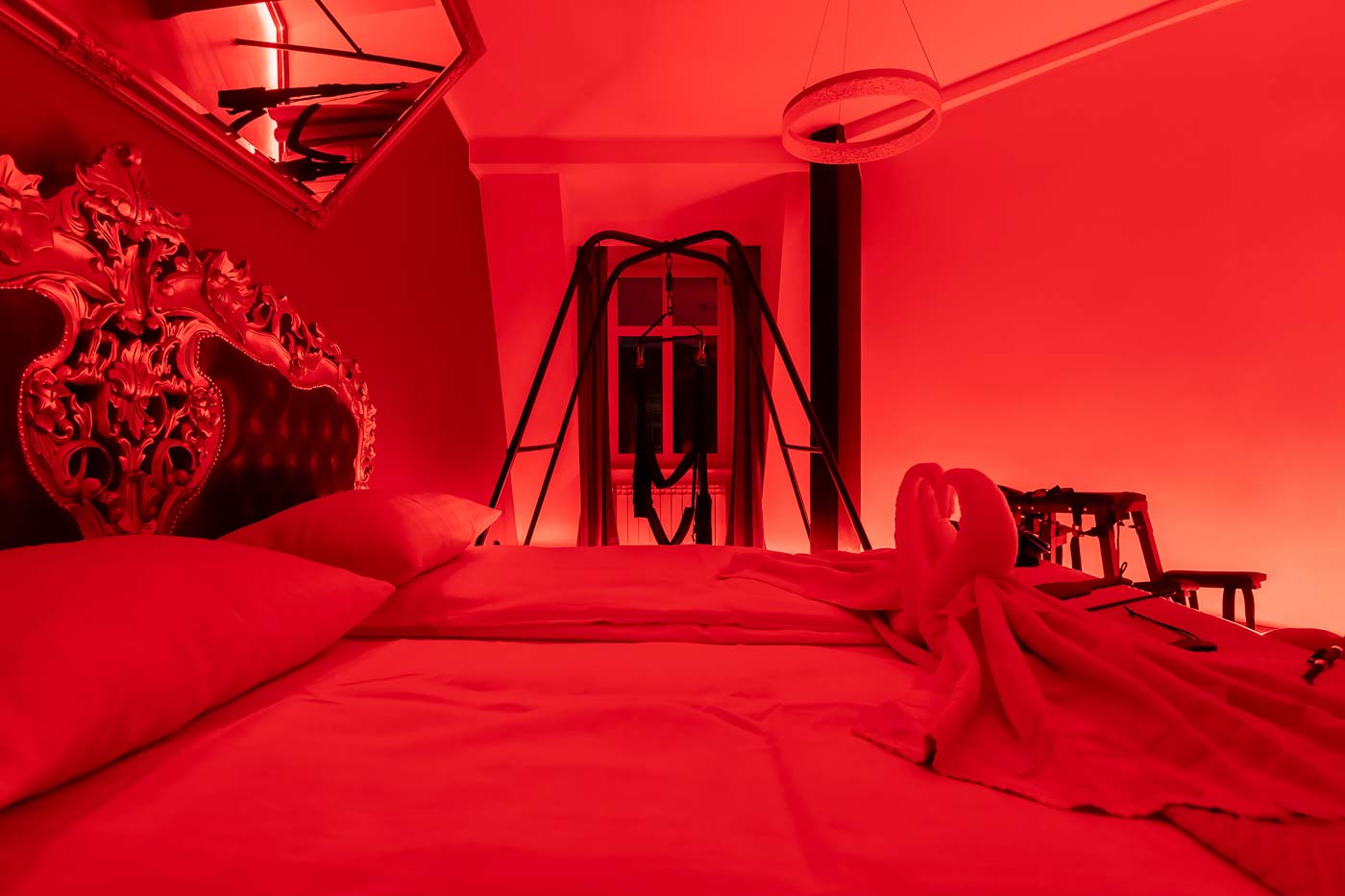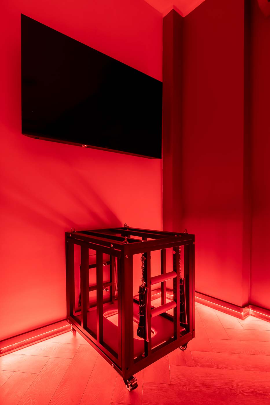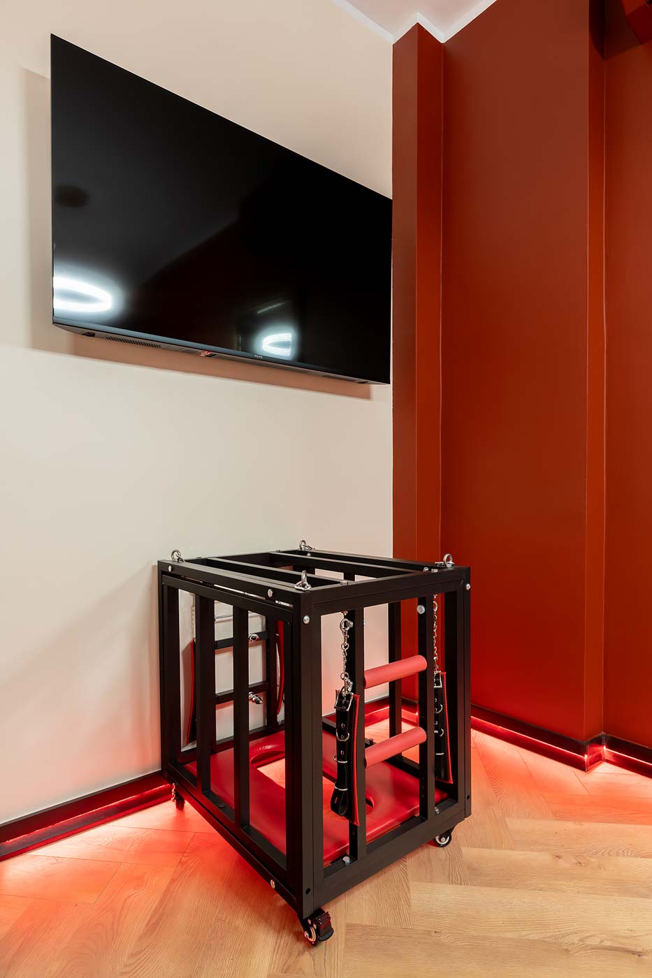 Wydzielona strefa BDSM w Secret Love Royal została zaprojektowana tak, aby dawać realne możliwości, a nie tylko klimat. Znajdziesz tu elementy w estetyce dungeon/club, które pozwalają budować różne warianty gry ról — od subtelnych po bardziej zdecydowane. To przestrzeń, w której scenografia i światło „robią robotę”, dzięki czemu nie trzeba nic aranżować: wystarczy wybrać tempo i granice, a wnętrze naturalnie wspiera klimat.