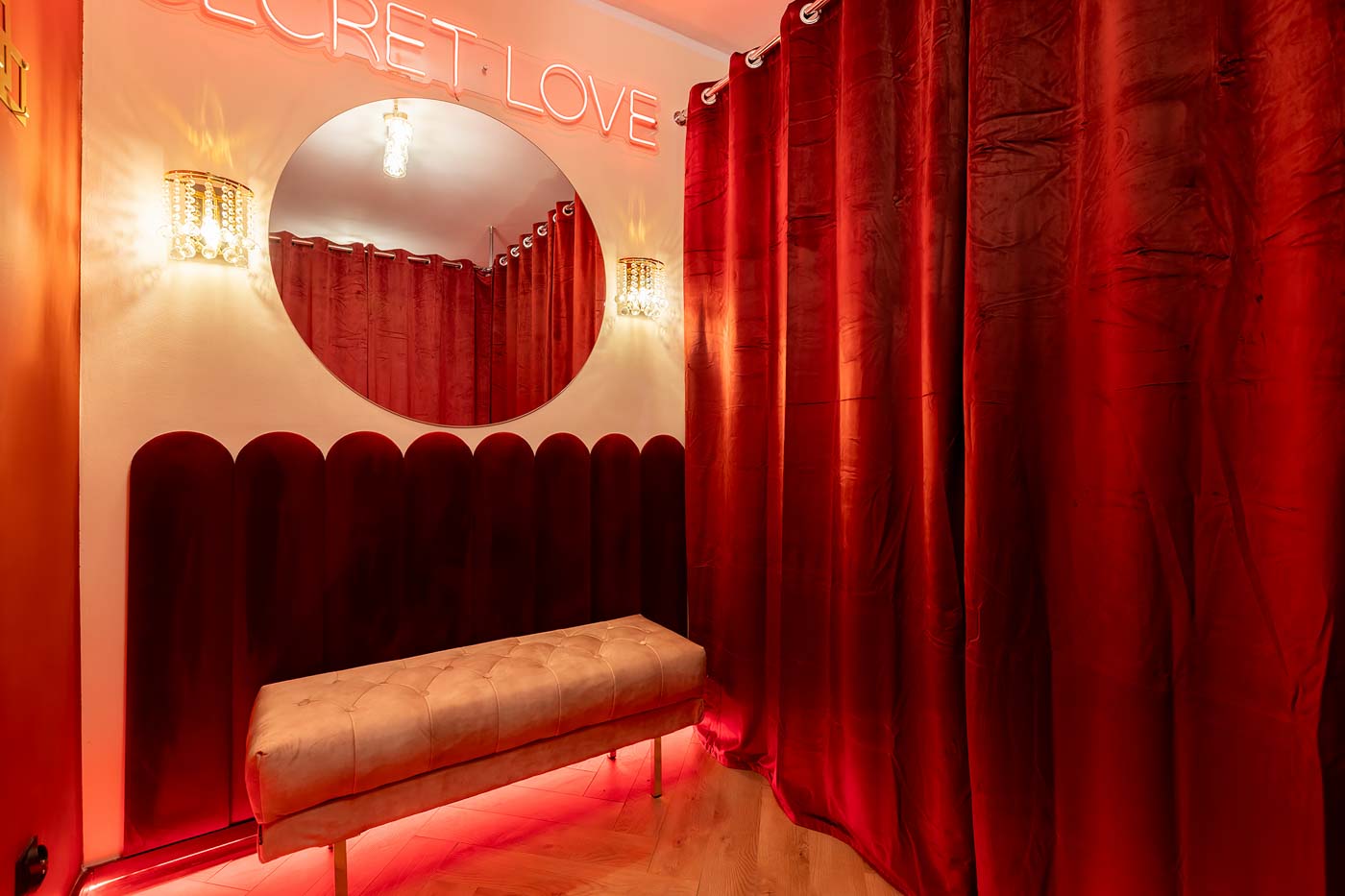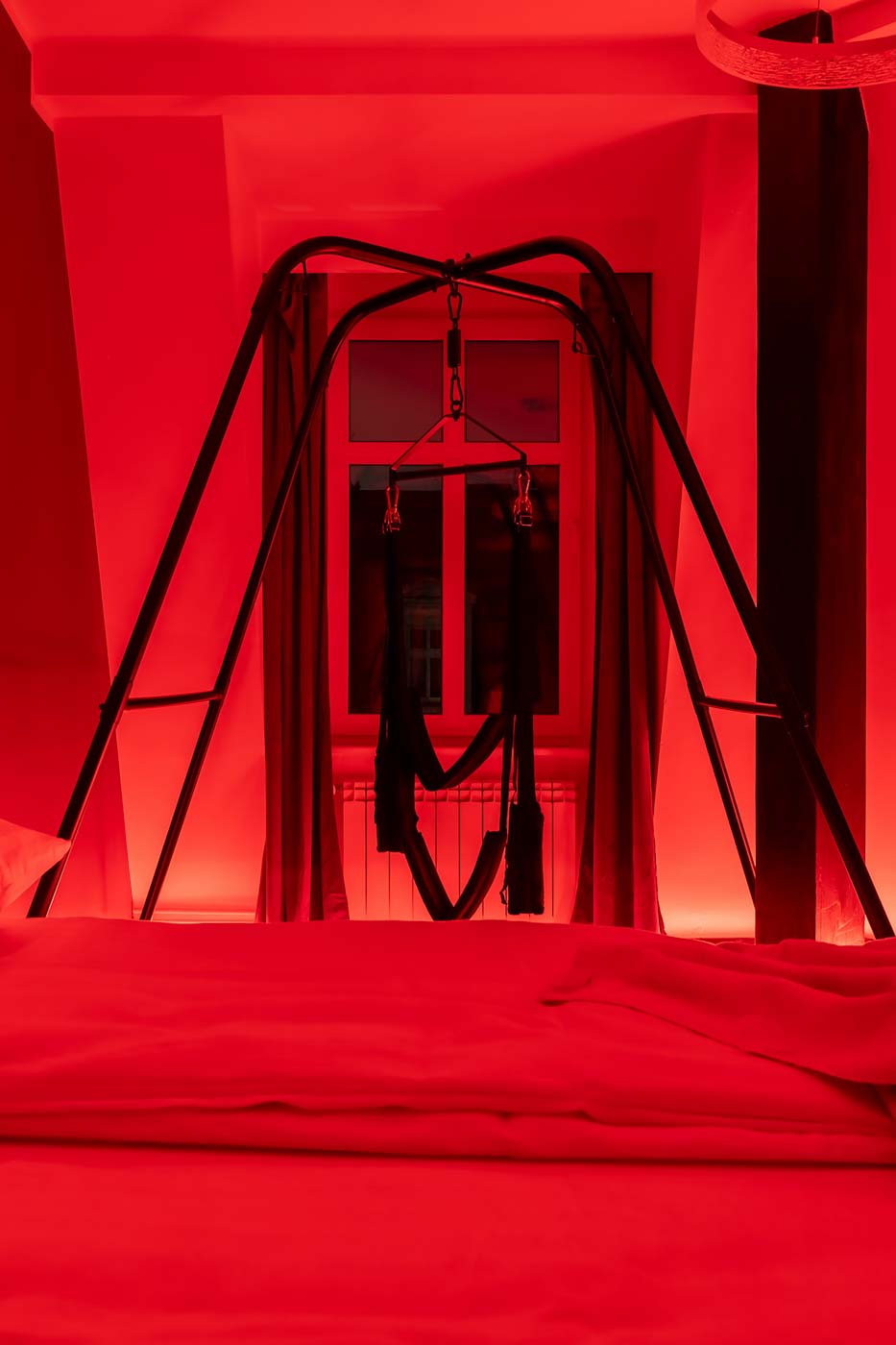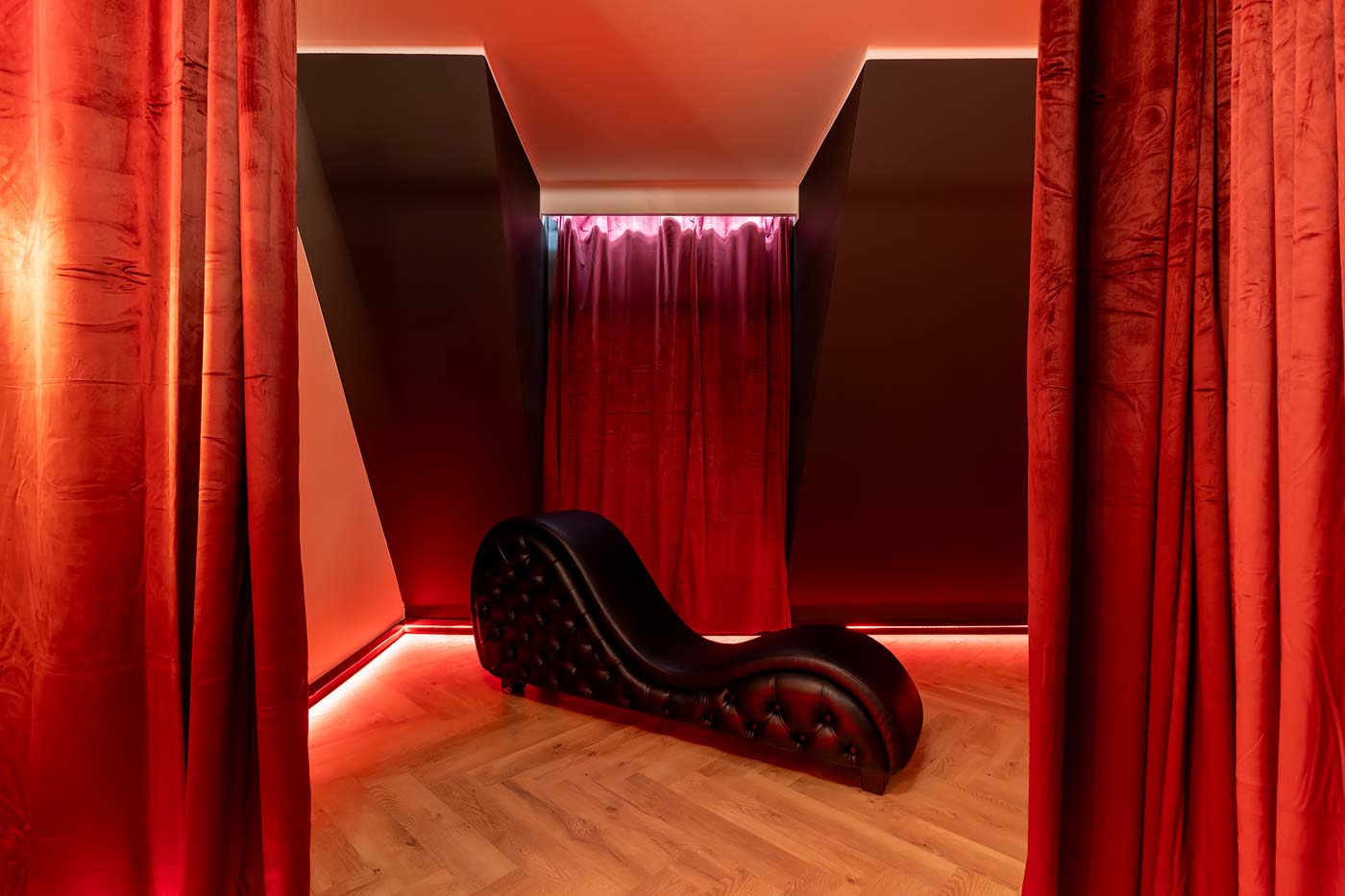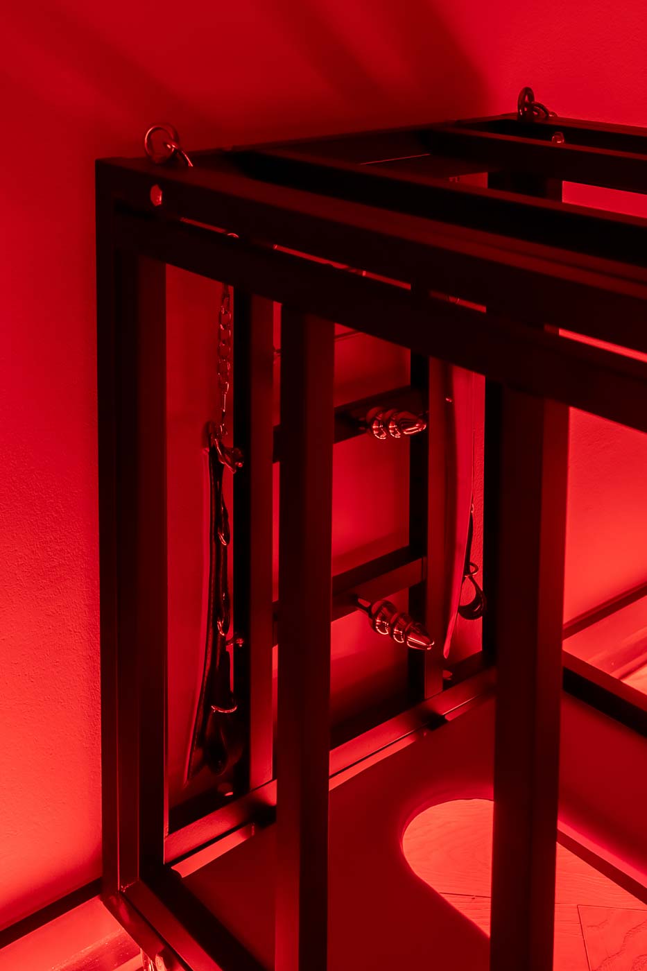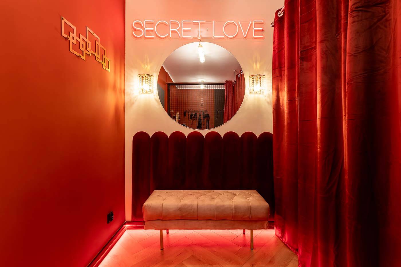 Wydzielona strefa BDSM w Secret Love Royal została zaprojektowana tak, aby dawać realne możliwości, a nie tylko klimat. Znajdziesz tu elementy w estetyce dungeon/club, które pozwalają budować różne warianty gry ról — od subtelnych po bardziej zdecydowane. To przestrzeń, w której scenografia i światło „robią robotę”, dzięki czemu nie trzeba nic aranżować: wystarczy wybrać tempo i granice, a wnętrze naturalnie wspiera klimat.
