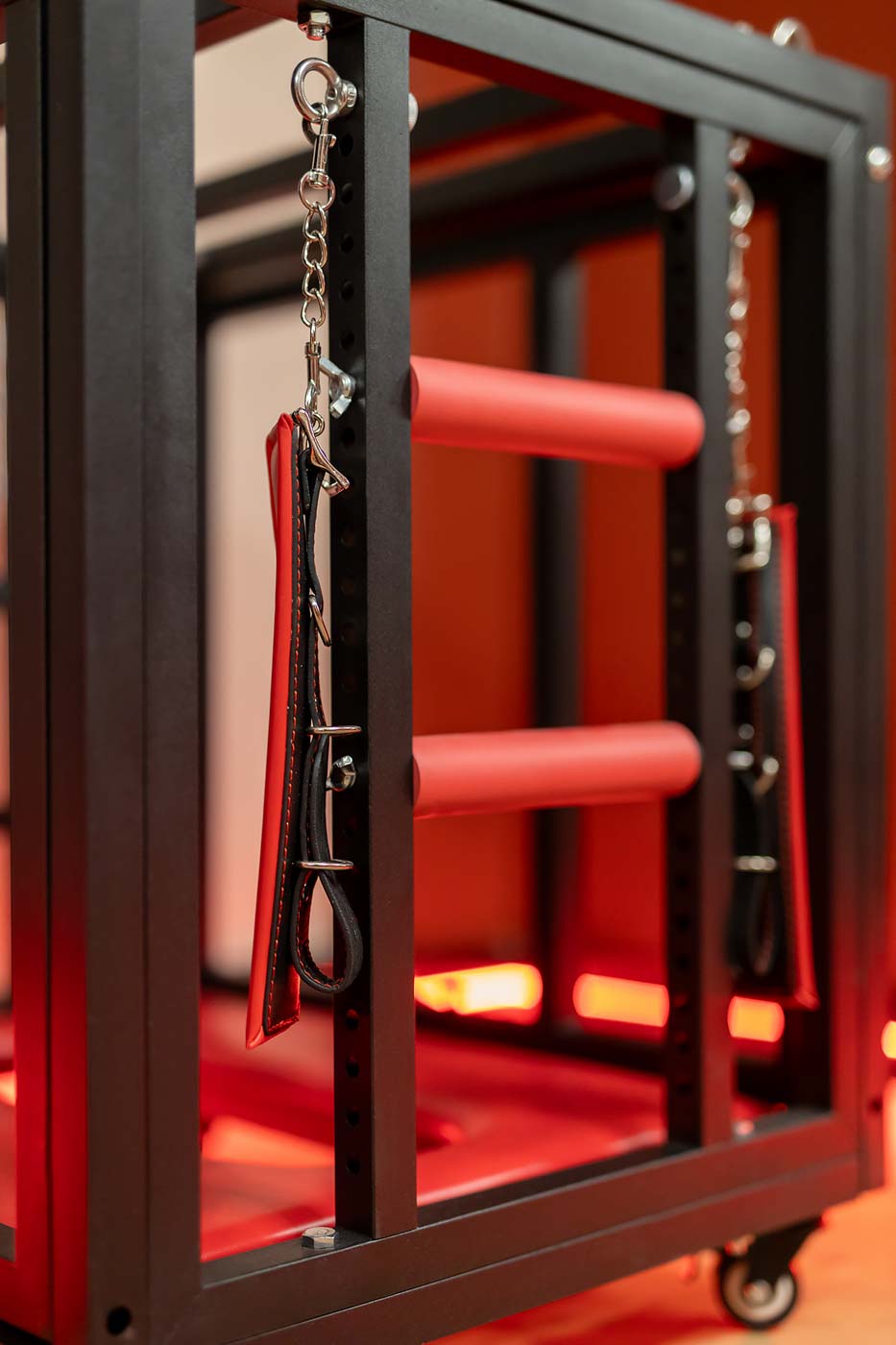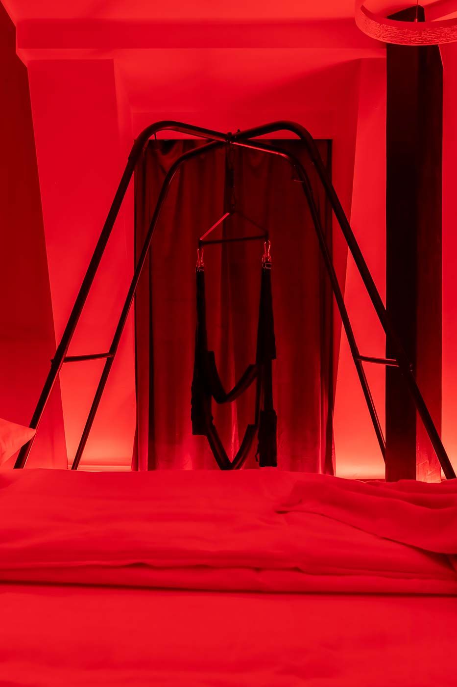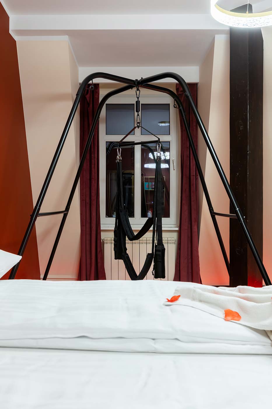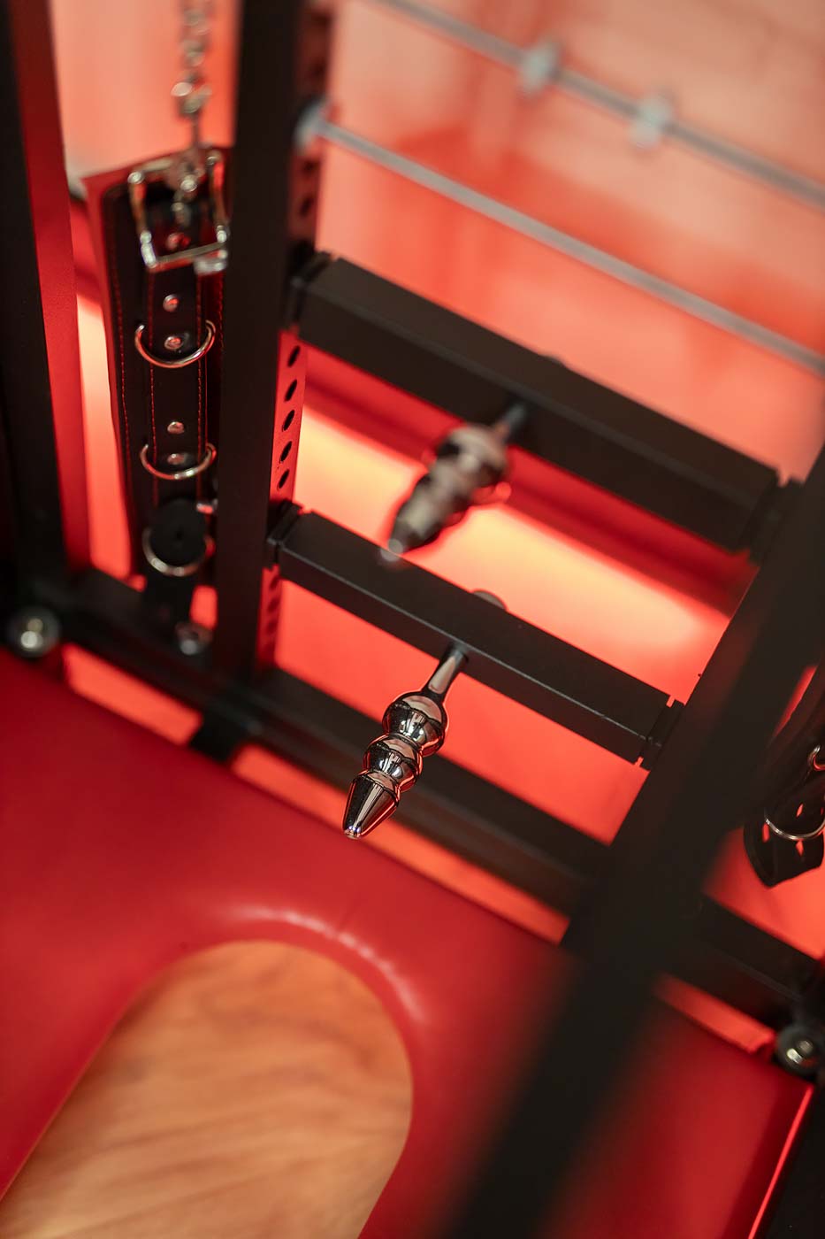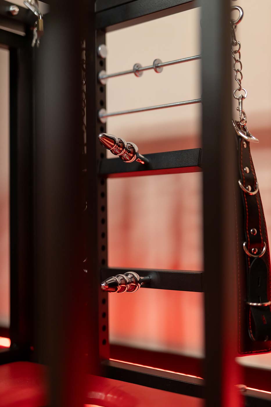 Wydzielona strefa BDSM w Secret Love Royal została zaprojektowana tak, aby dawać realne możliwości, a nie tylko klimat. Znajdziesz tu elementy w estetyce dungeon/club, które pozwalają budować różne warianty gry ról — od subtelnych po bardziej zdecydowane. To przestrzeń, w której scenografia i światło „robią robotę”, dzięki czemu nie trzeba nic aranżować: wystarczy wybrać tempo i granice, a wnętrze naturalnie wspiera klimat.