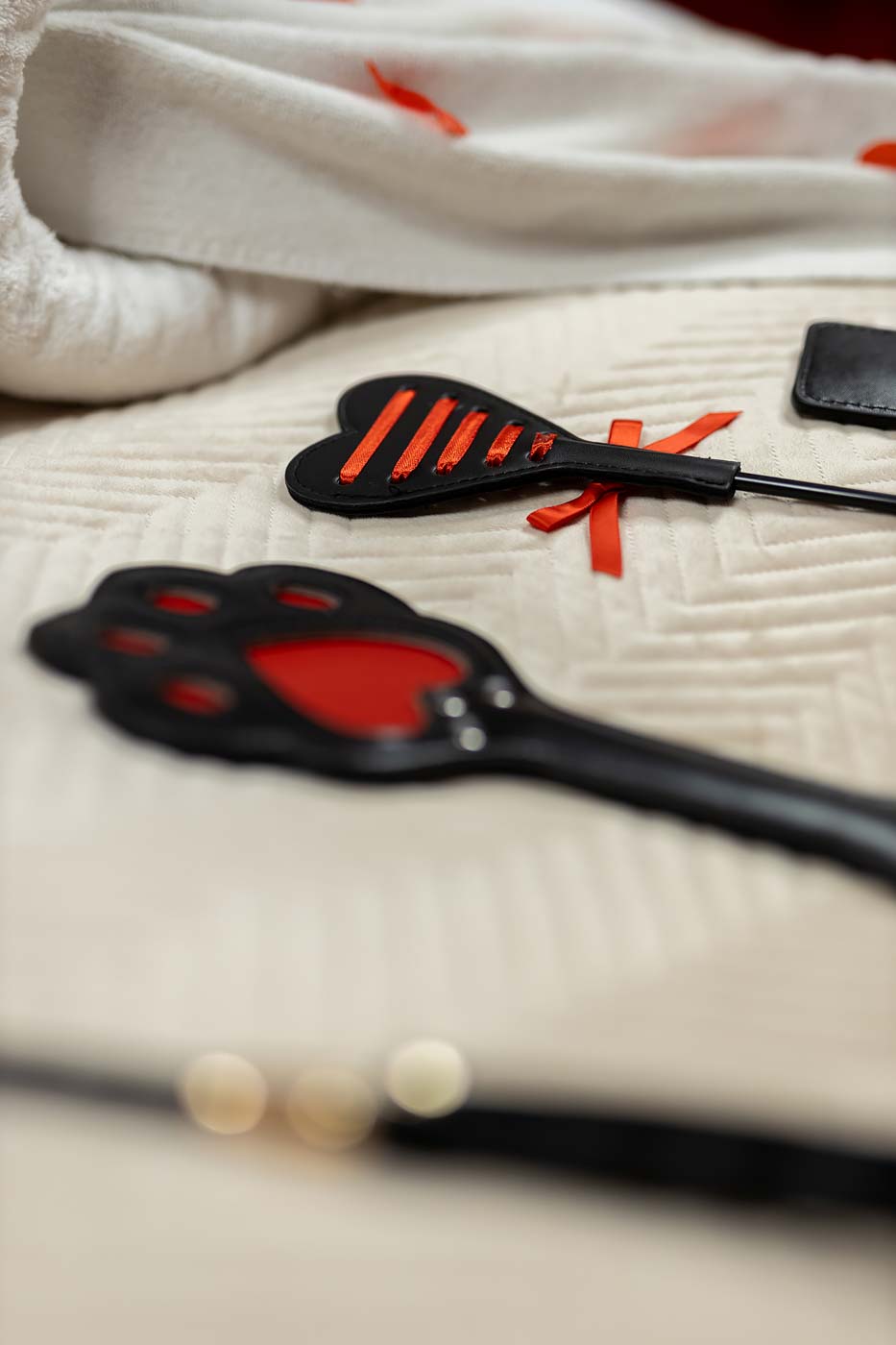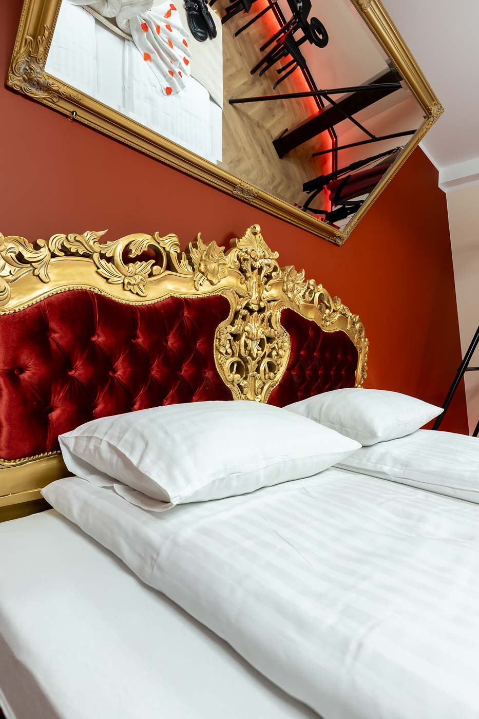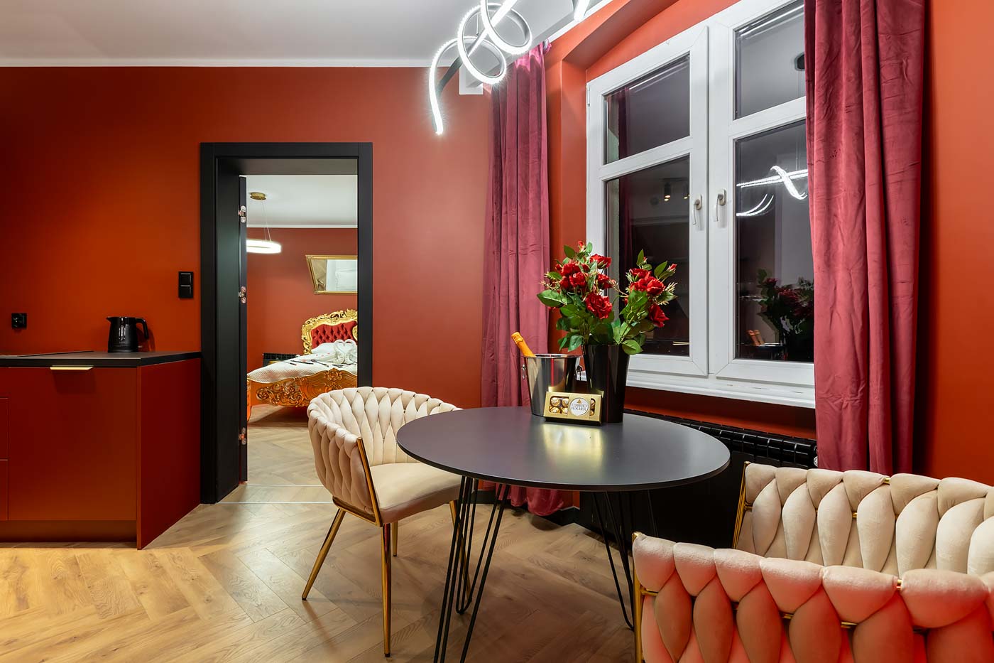 Strefa sypialniana jest utrzymana w stylu, który podbija wrażenie luksusu: miękkie czerwone zasłony, wyraziste tło i detale budujące klimat „boutique”. To przestrzeń, w której można postawić na komfortowy nocleg, ale też na spokojniejszą, bardziej intymną część pobytu — kiedy liczy się tempo, bliskość i oprawa, która nie jest przesadna, tylko dopracowana.
