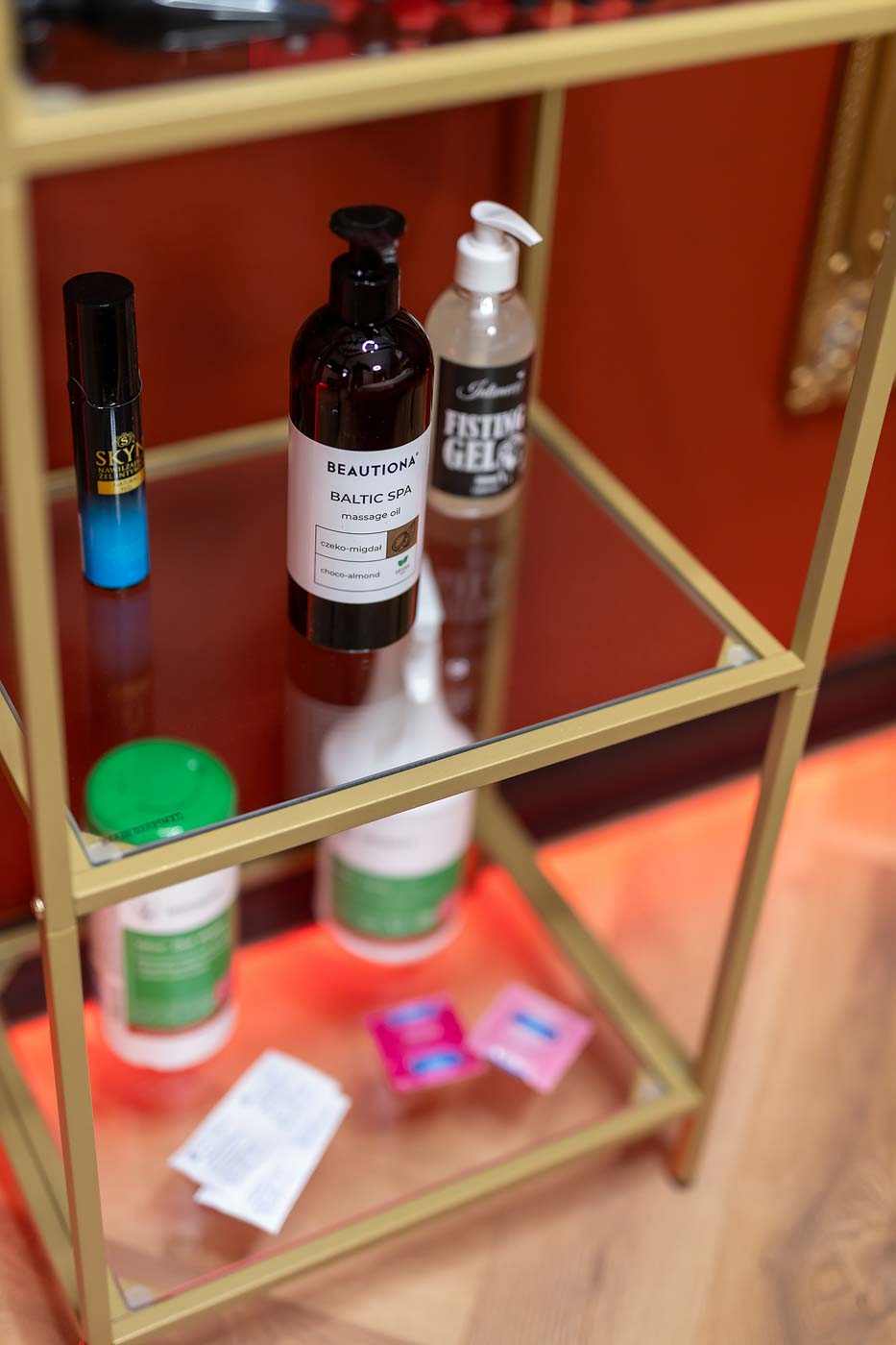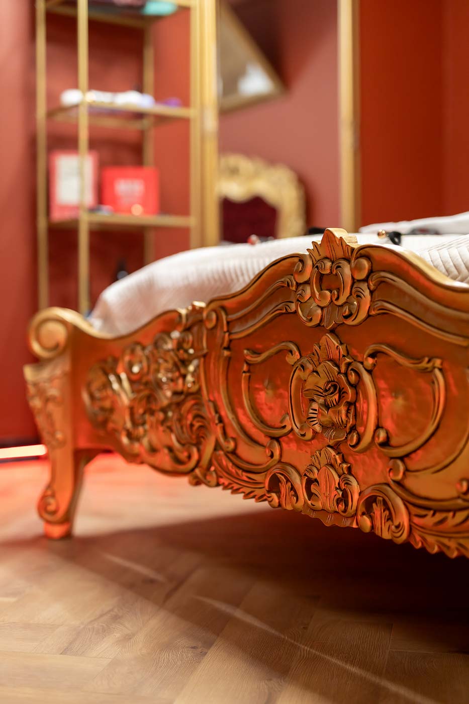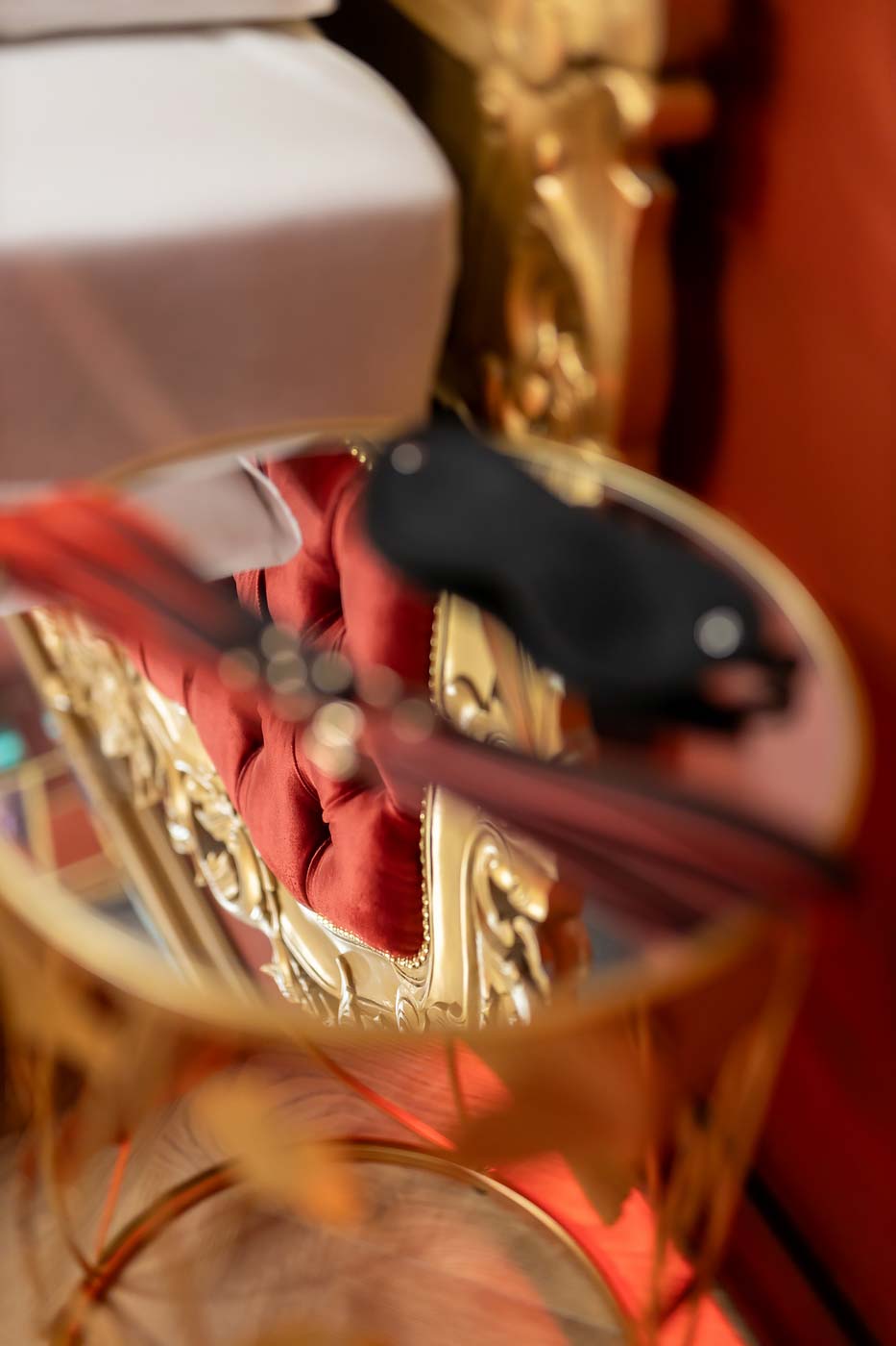 W Royal ważną rolę grają mocne akcenty wizualne: złote detale, charakterystyczne elementy w stylu „królewskim” oraz oświetlenie, które potrafi zmienić nastrój w kilka sekund. Ta strefa działa jak prywatny lounge — dobra do rozmowy, przerwy, zmiany tempa lub przygotowania się do bardziej tematycznej części apartamentu.